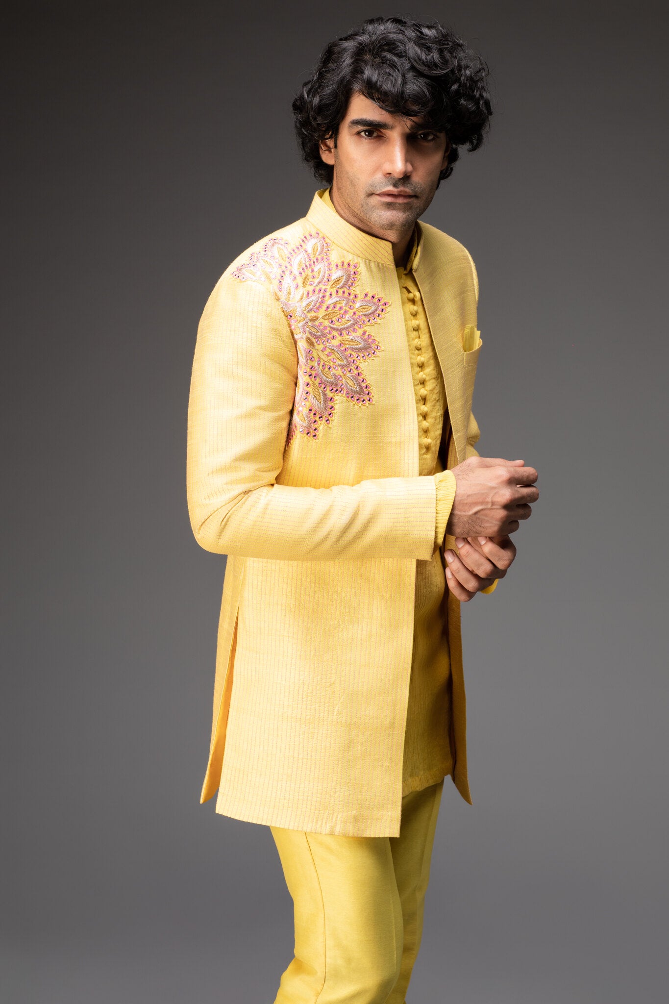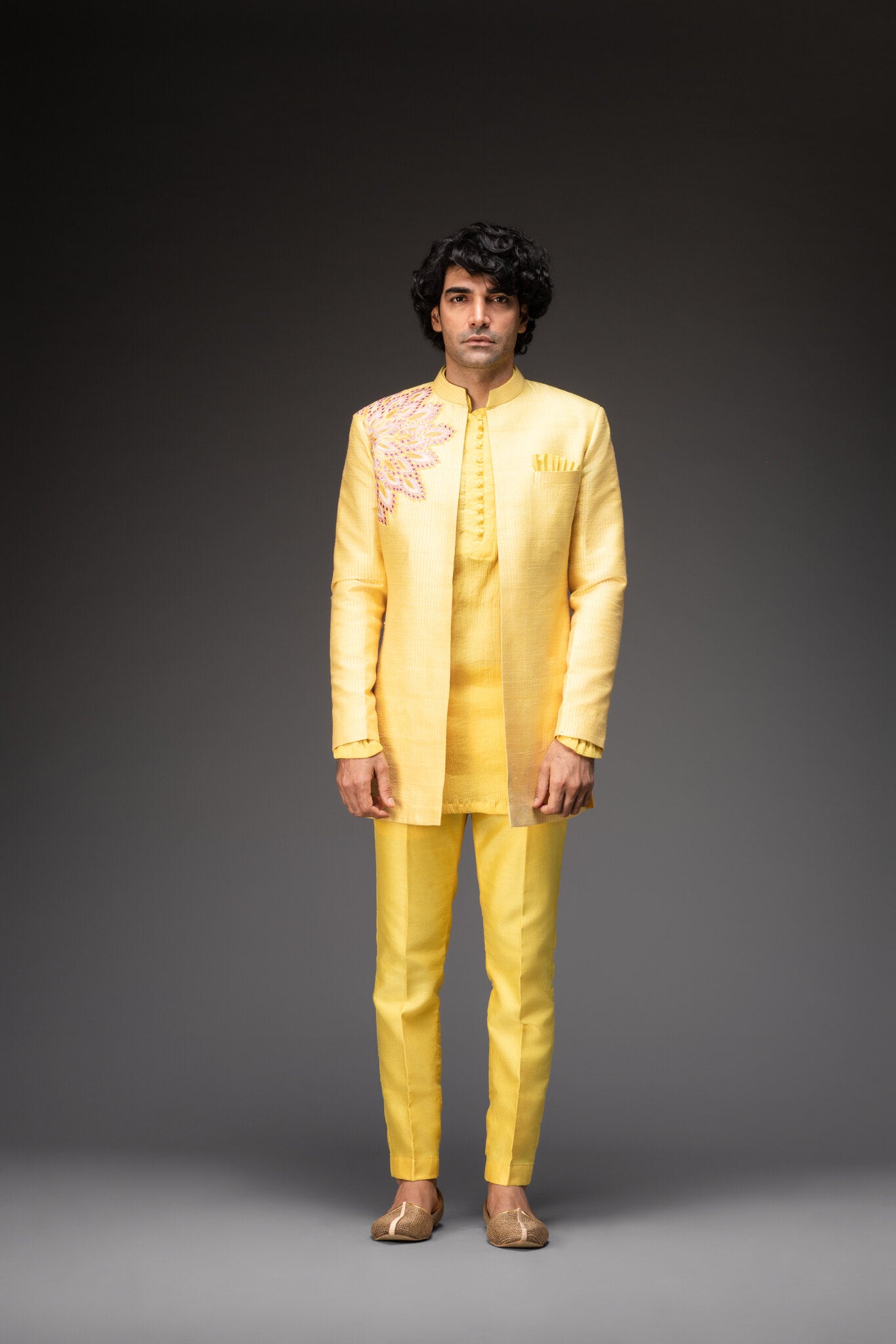 Lemon yellow crinckled kurta teamed with narrow pants. It is paired with a matching open jacket with thread and mirror work motif on one shoulder