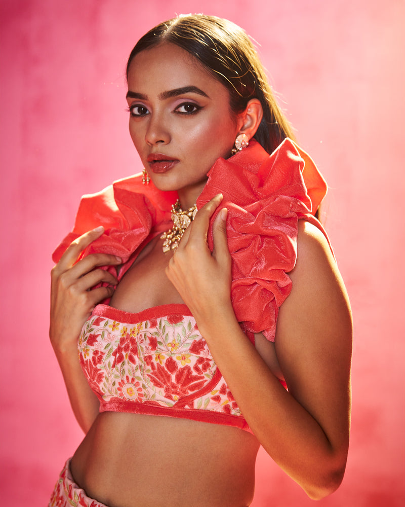 Indulge in the glamorous charm of this Light Pink Embroidered Lehenga Set with Shrug. The organza fabric, cancan attachment, velvet patchwork, intricate thread and mirror embroidery will leave you in awe. The padded blouse and velvet draped shrug add an extra touch of elegance to this ensemble.