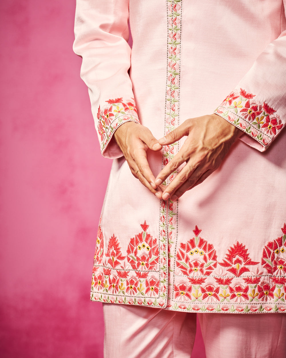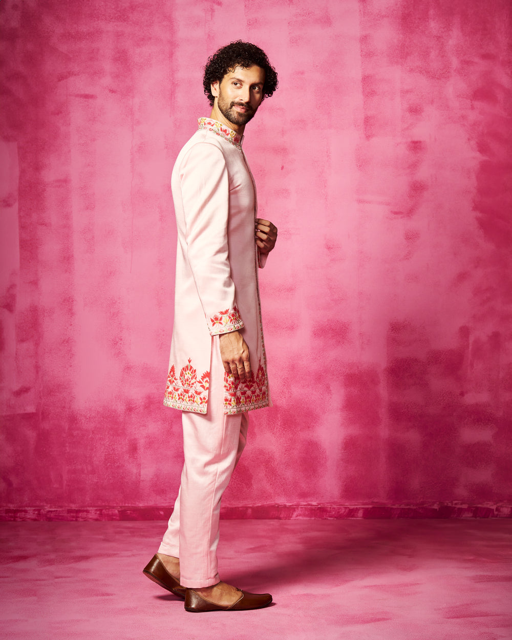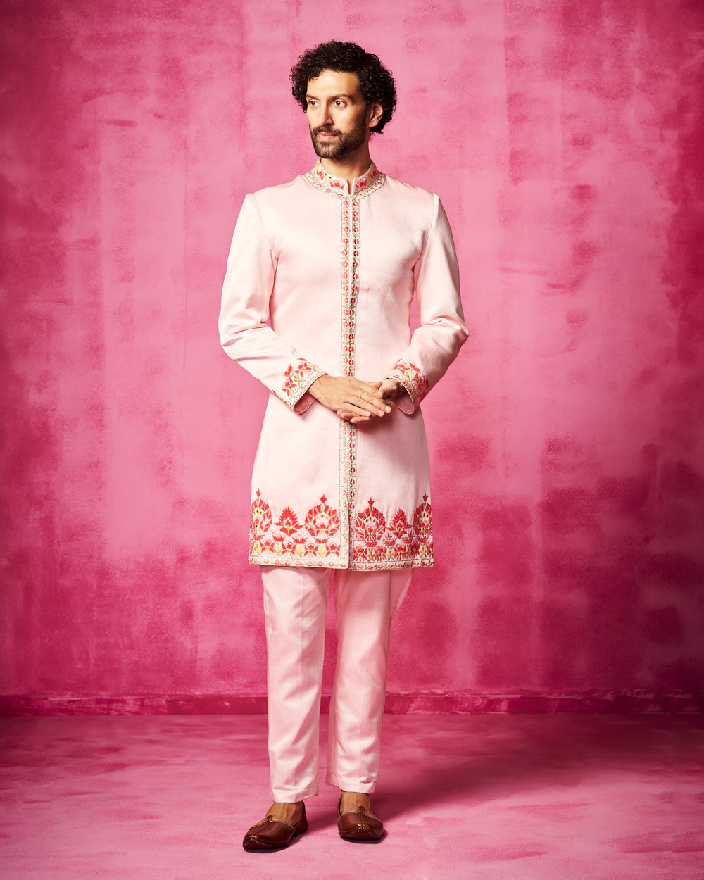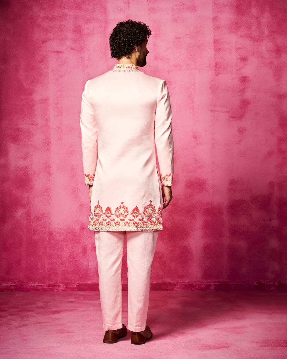 Light Pink embroidered sherwani with velvet patchwork and thread work embroidery. It is teamed with matching narrow pants