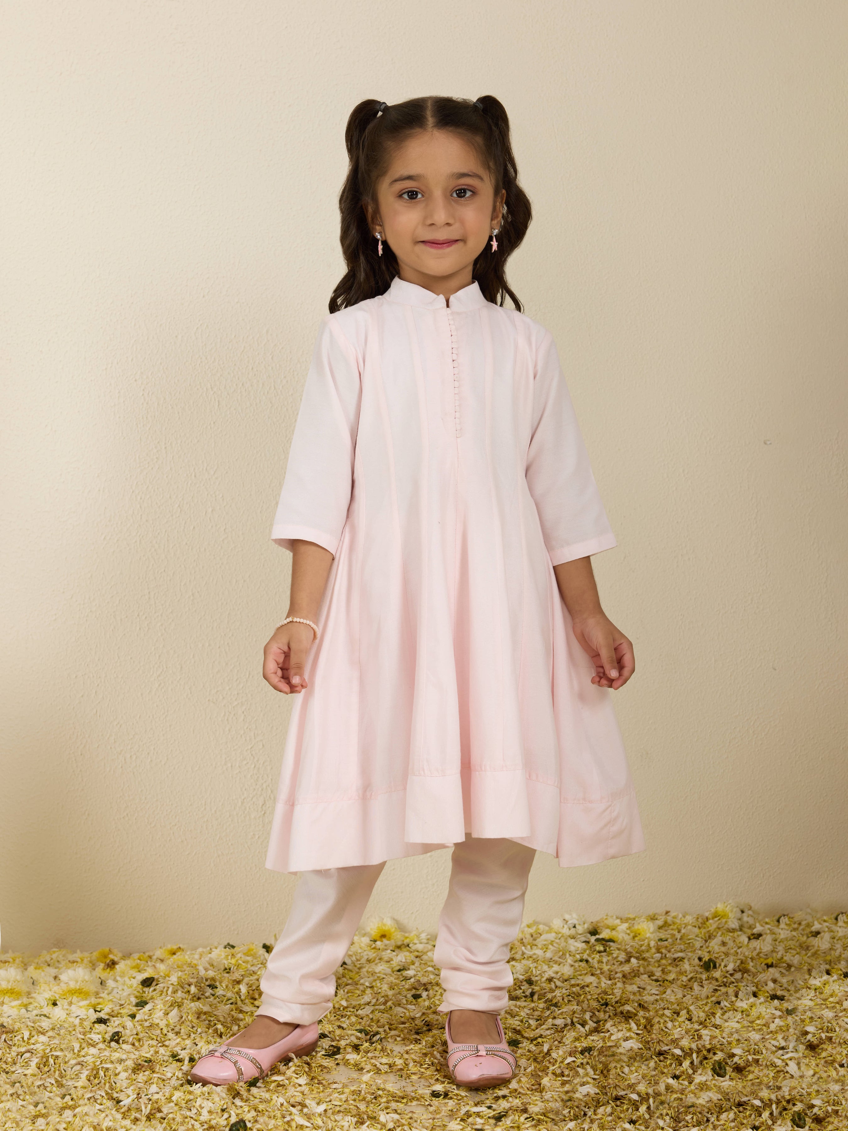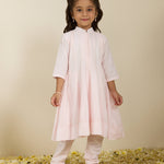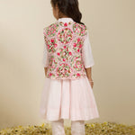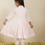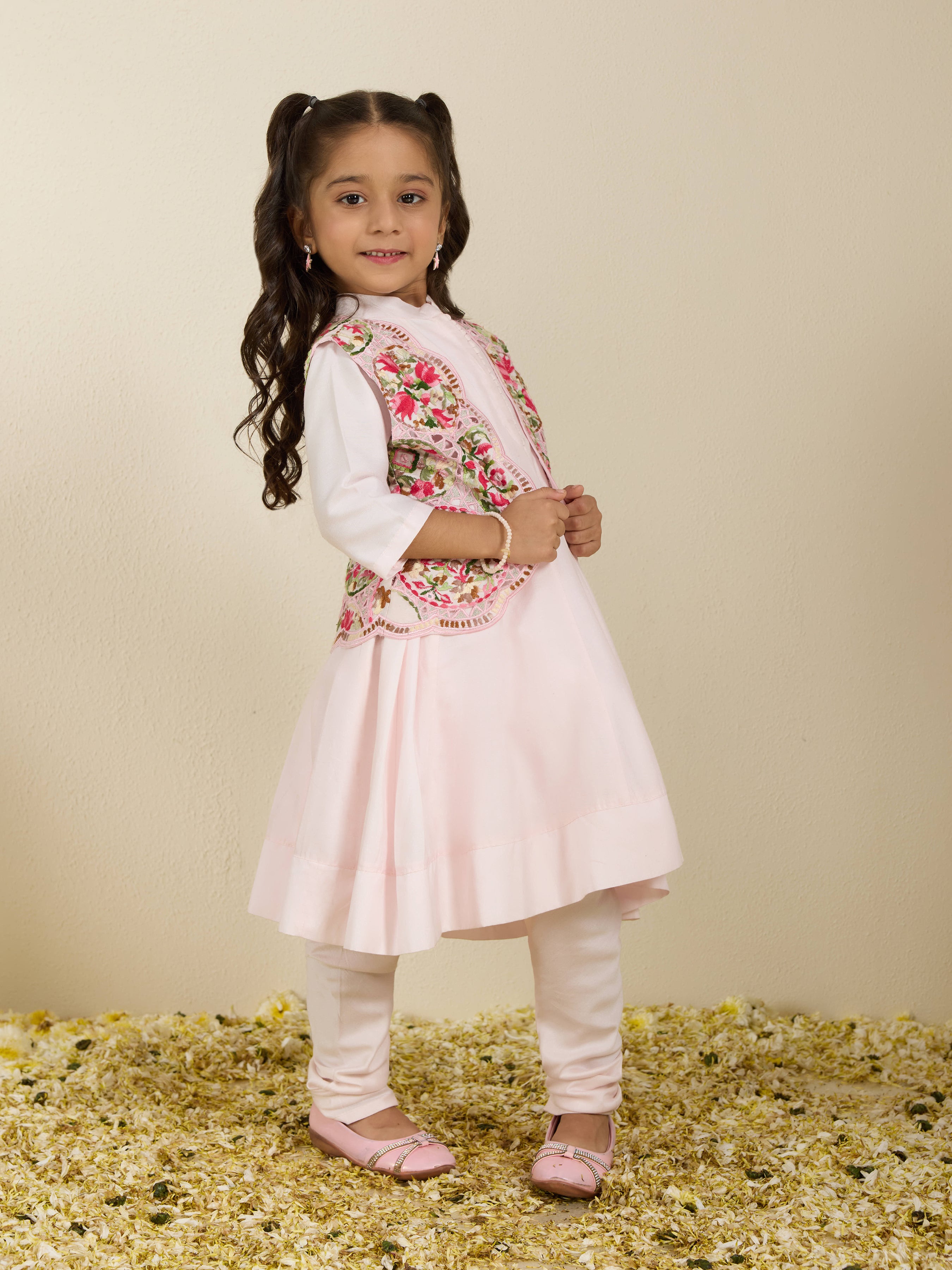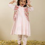 Dress your child in timeless elegance with this light pink kalidar spun silk kurta set for girls, featuring a flowing anarkali silhouette and matching pants for comfort and style. The coordinated look is completed with an embroidered, multi-coloured cutwork jacket, adding a playful yet sophisticated touch to festive and formal occasions. Designed with premium spun silk fabric for softness and durability, this set is ideal for celebrations, weddings, and family gatherings.
