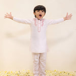 Elevate your child’s traditional wardrobe with this boys’ light pink spun silk kurta set, featuring delicate embroidery on the collar and around the placket for a sophisticated touch. The kurta is paired with matching narrow pants made from soft spun silk, ensuring both style and comfort. Perfect for weddings, festivals, and special occasions, this set combines elegant craftsmanship with modern fit for a polished ethnic look.