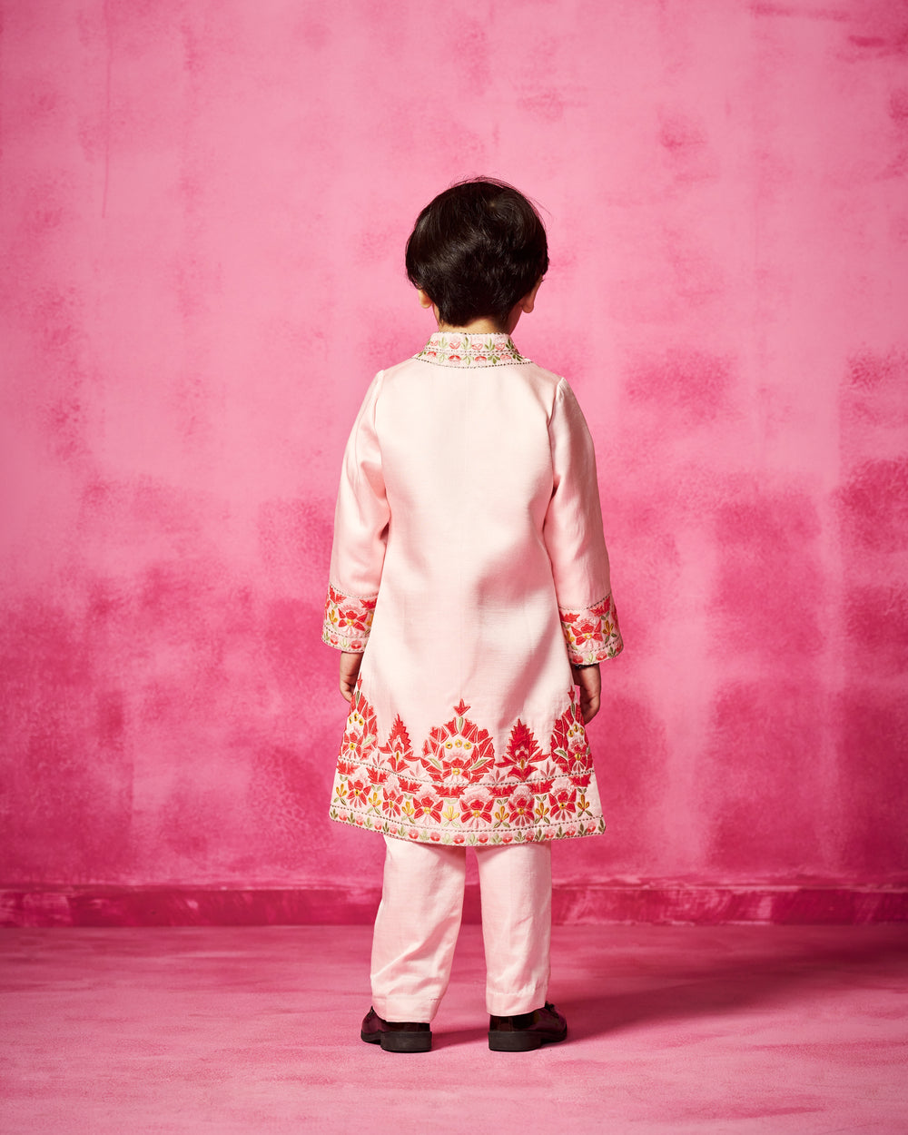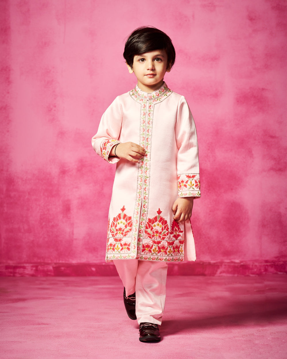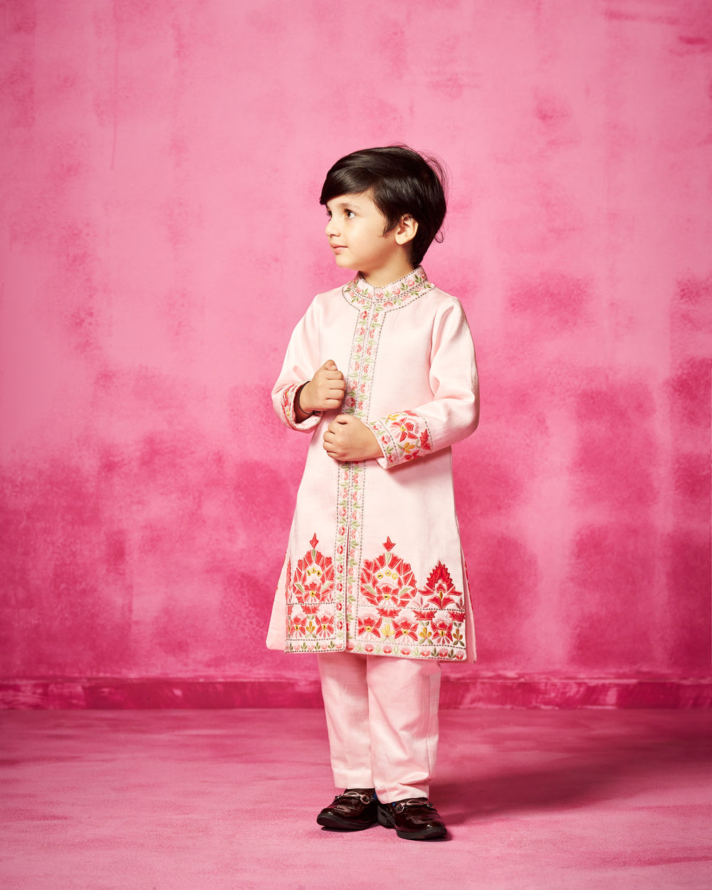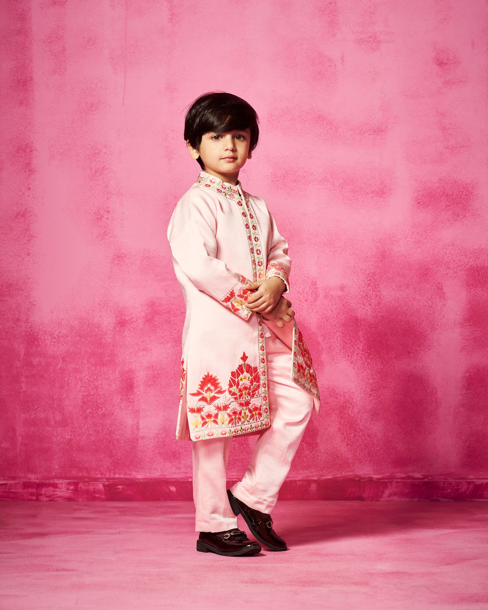 Crafted with delicate hand-embroidered threadwork and accented with a luxurious velvet patchwork, this Light Pink Sherwani Set for boys comes paired with sleek narrow pants for a complete and refined ensemble.