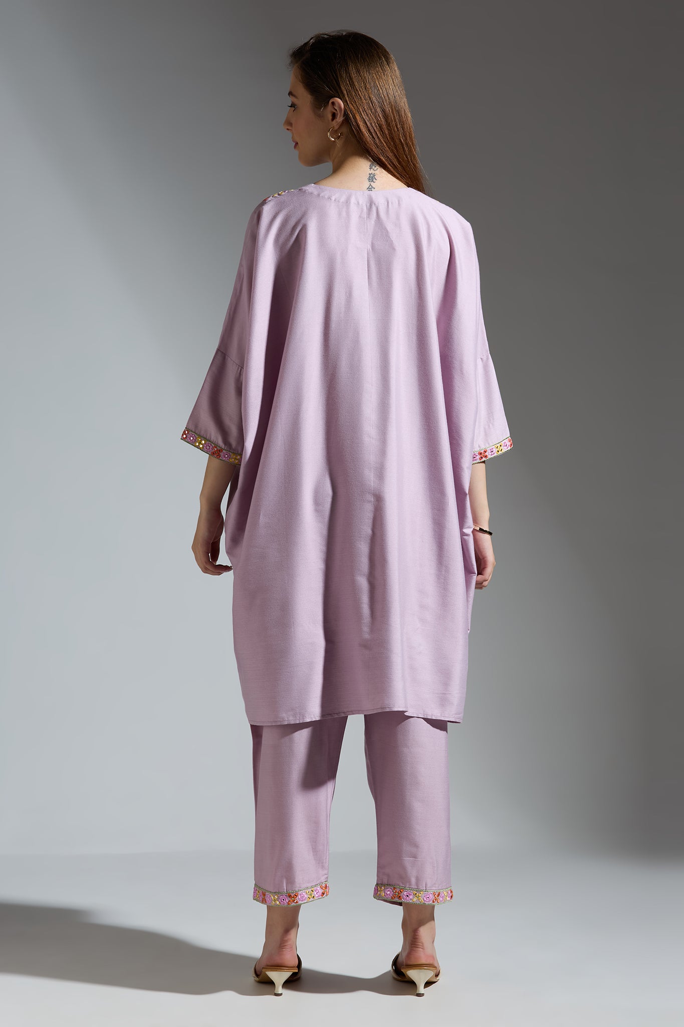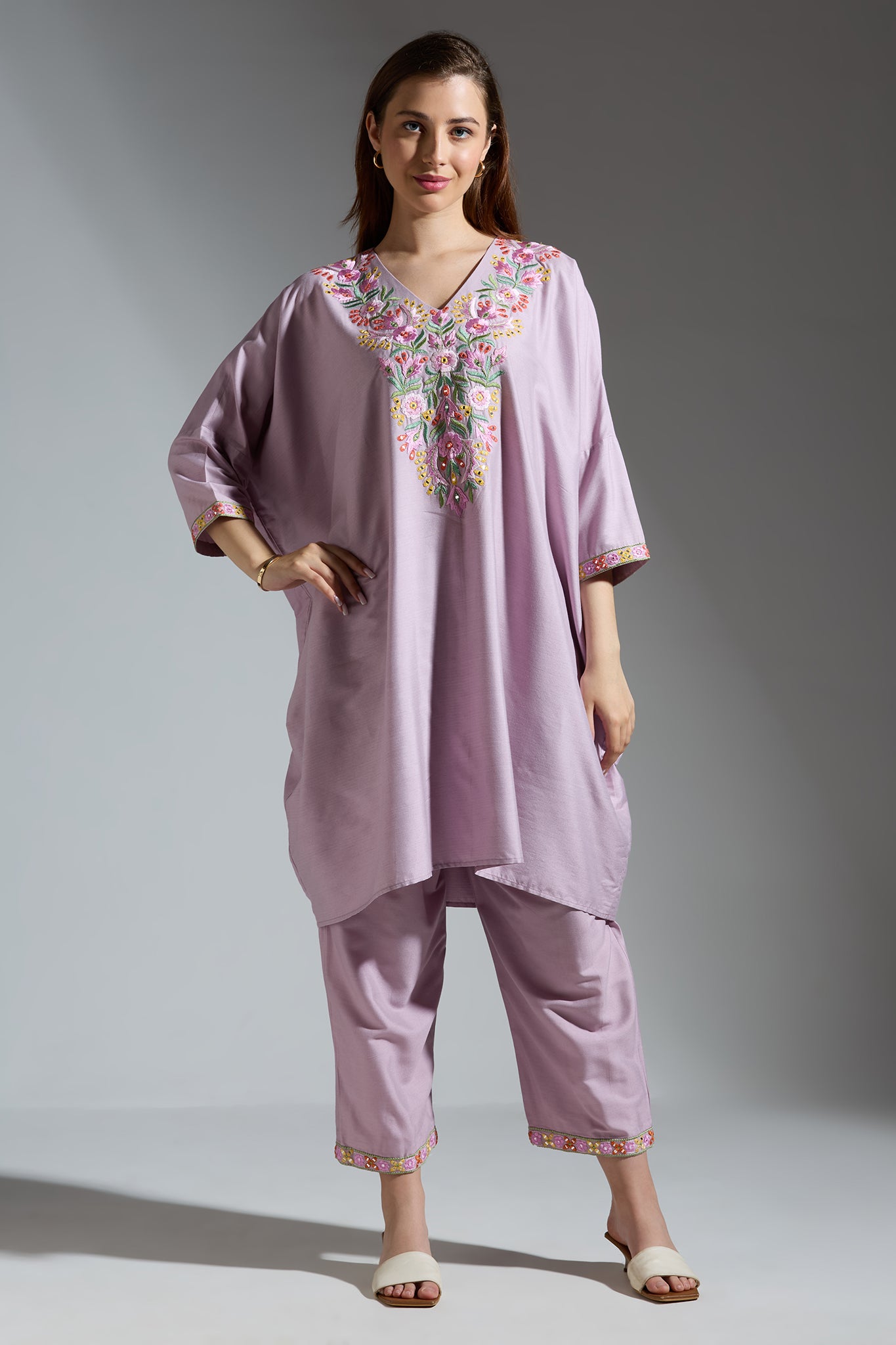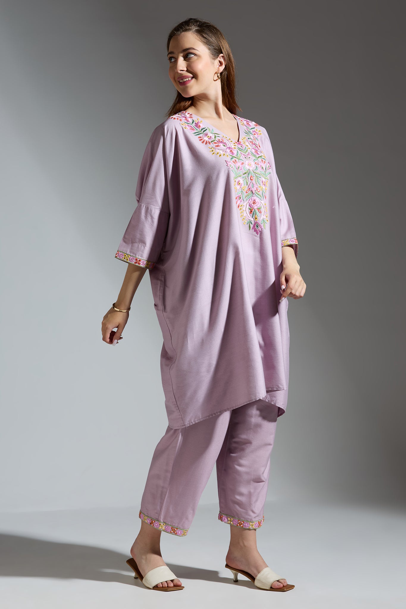 The Light Purple Silk Embroidered Co-ord Set features intricate thread and mirror work on the top's yoke and cuff, complemented by coordinating pants.