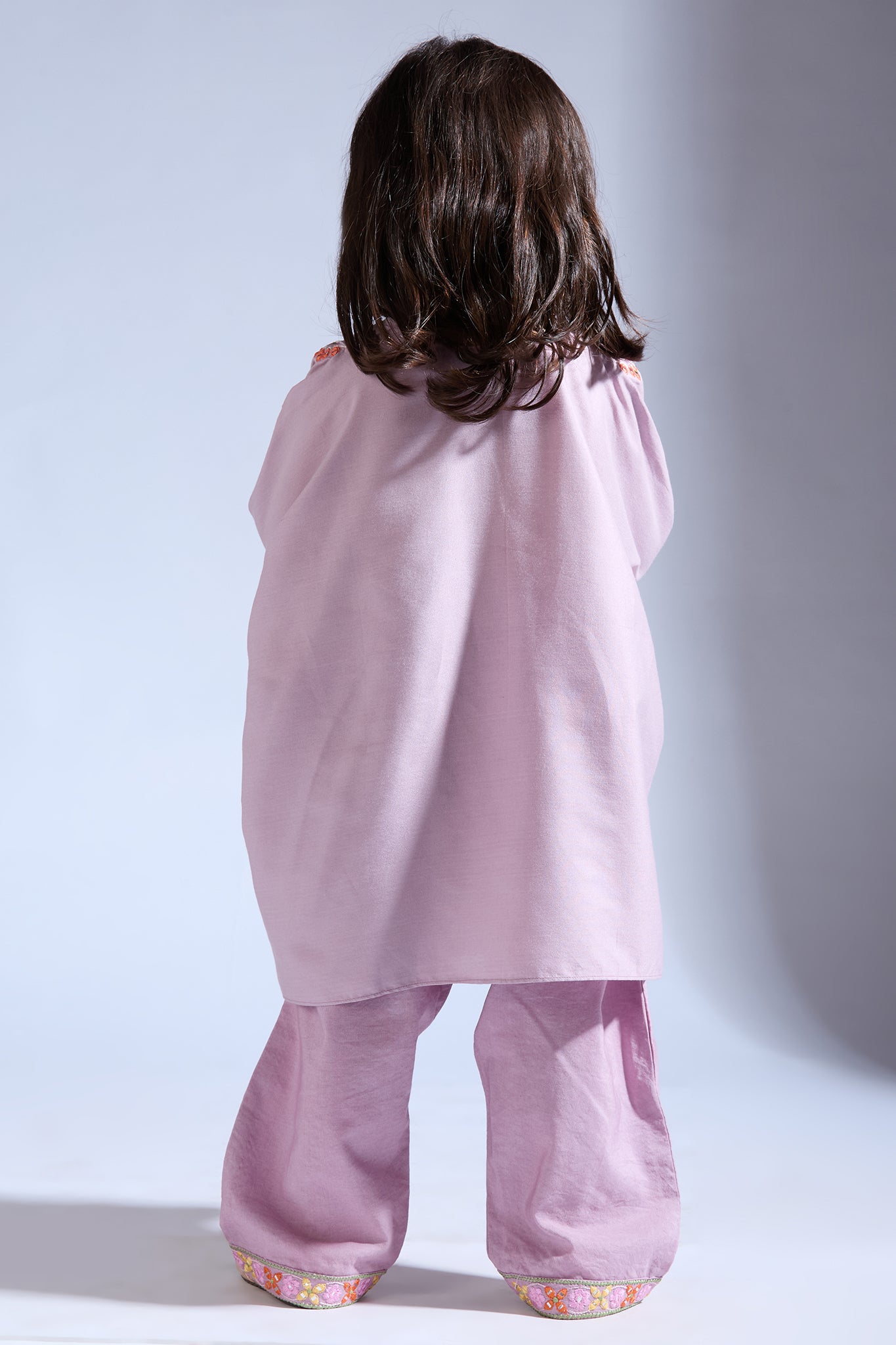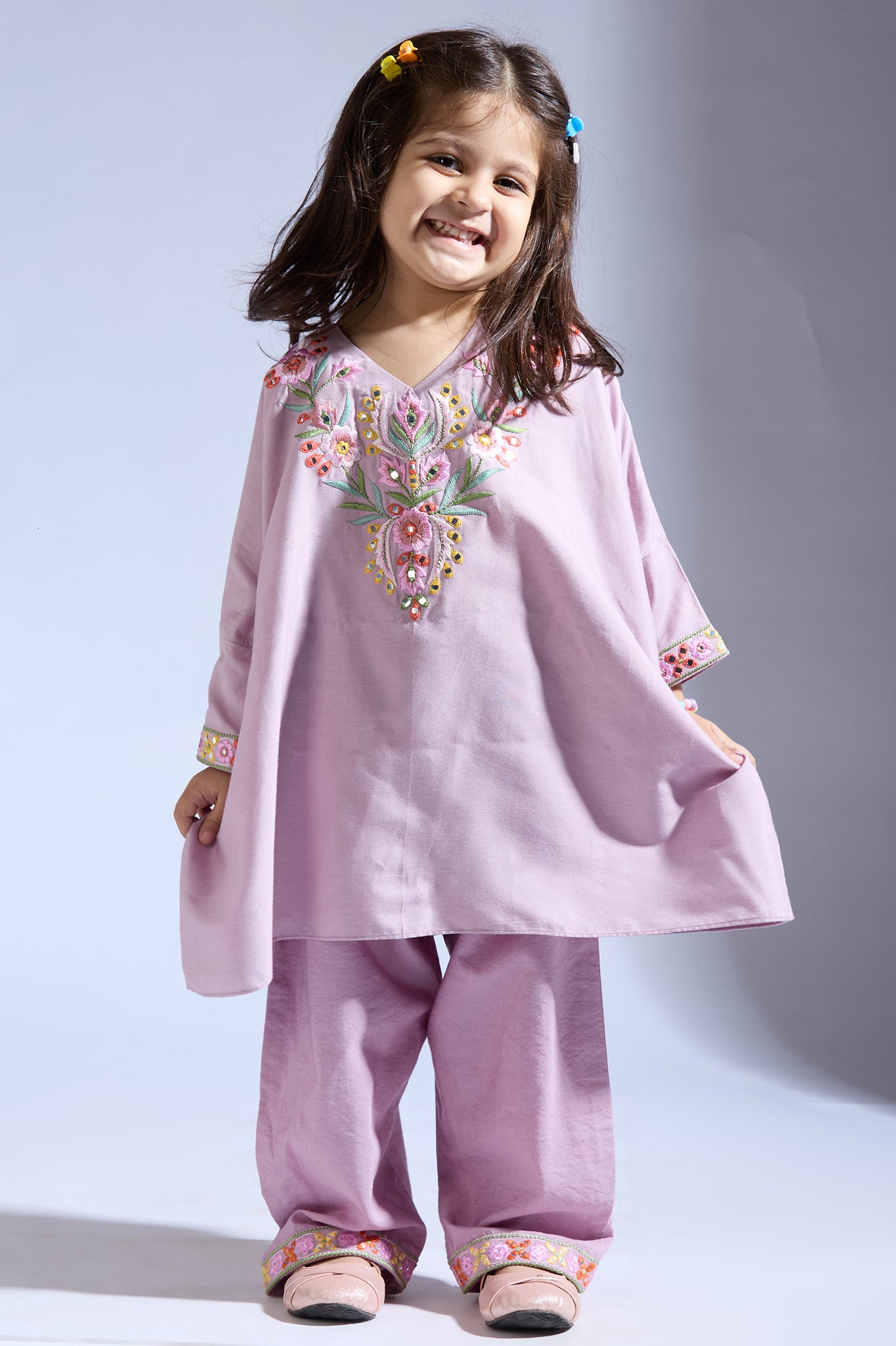 This co-ord set for girls features delicate thread and mirror work on the yoke and cuff of the top, complemented by similarly adorned pants.