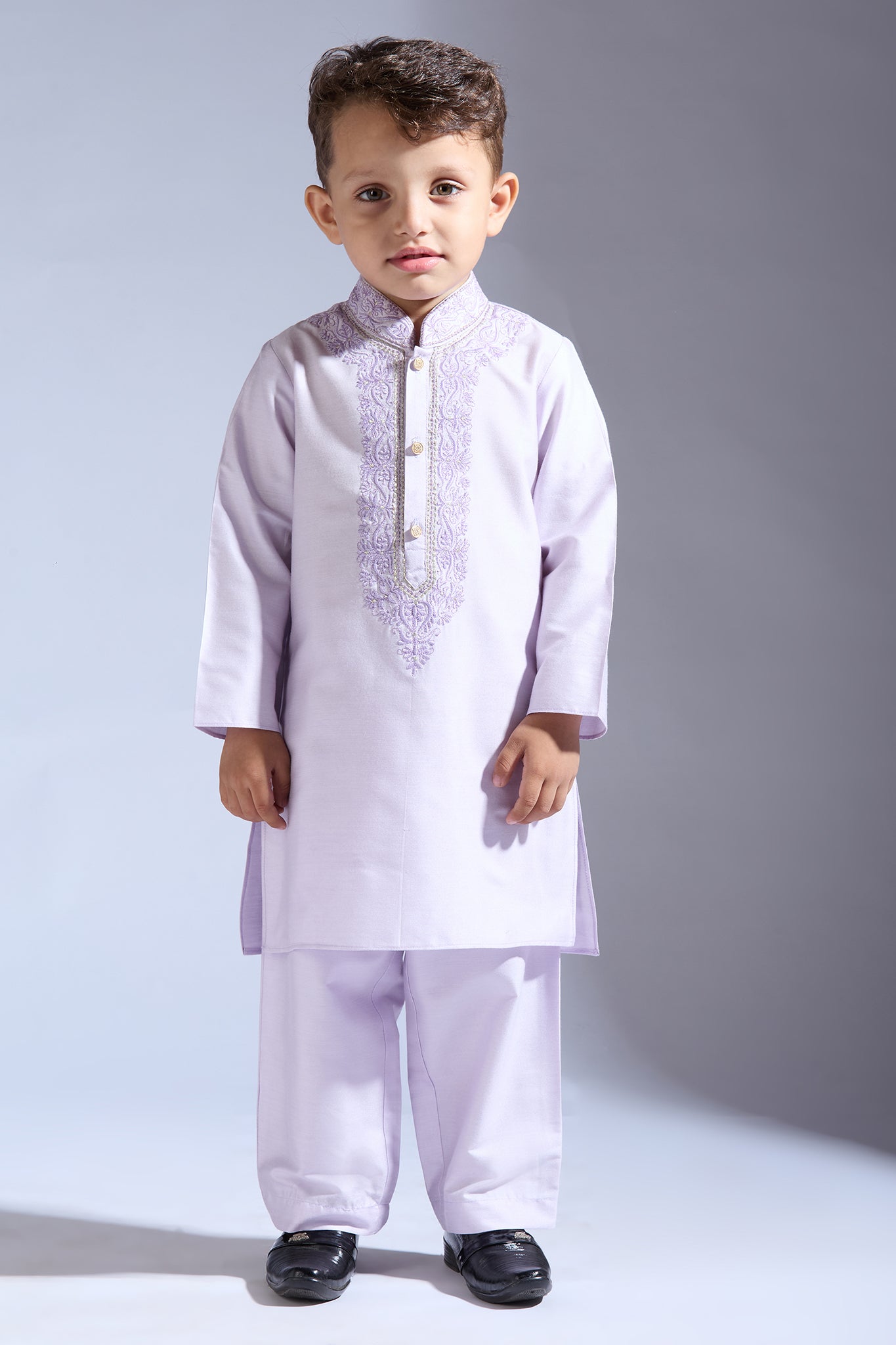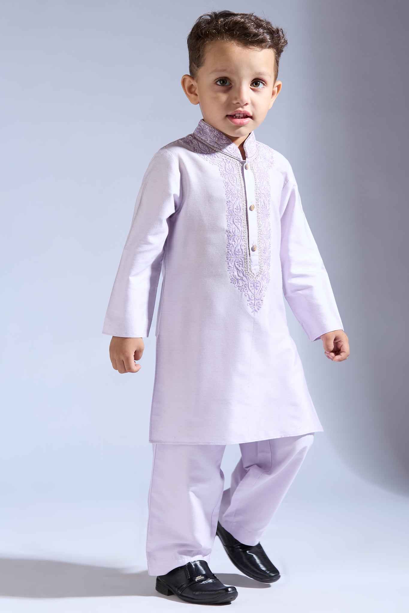 Lilac kurta for boys with embroidery details collar and around the placket. It is teamed with matching pants.