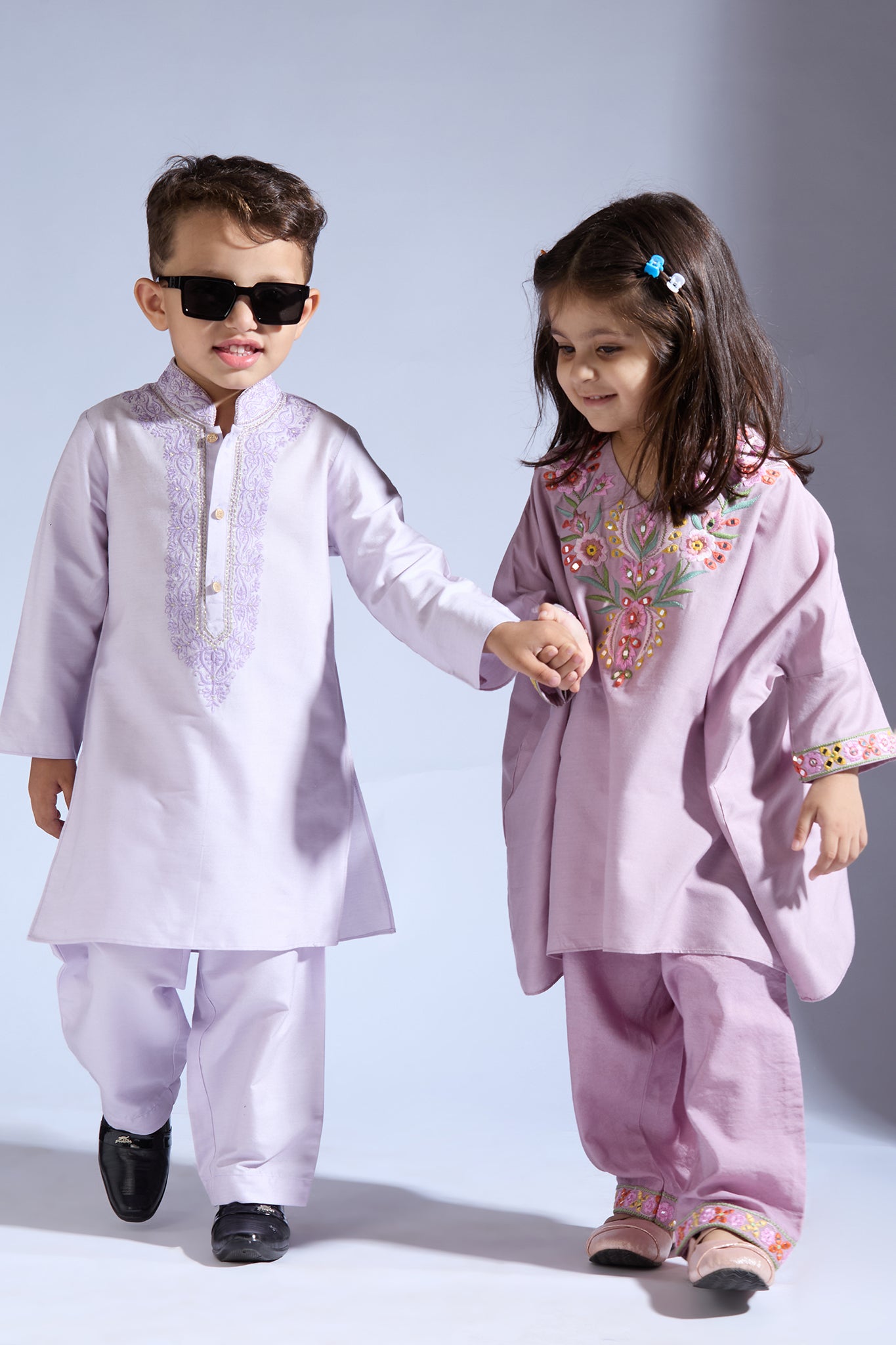 Lilac kurta for boys with embroidery details collar and around the placket. It is teamed with matching pants.