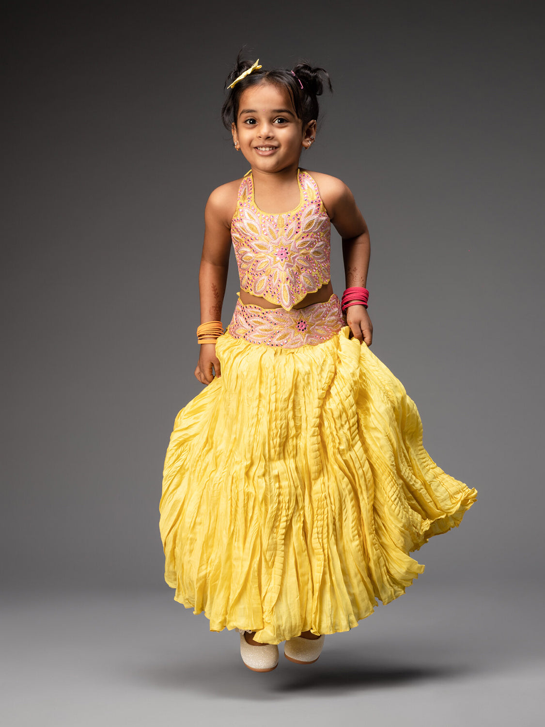 Midnight blue net gown with a pleated bodice attached to a full bias cut skirt. The gown is further enhanced with metallic embroidery along the waist. This navy blue layered party gown is an ideal choice for your daughter’s western collection. It comes with a satin bow detailing at the front that boosts its look.