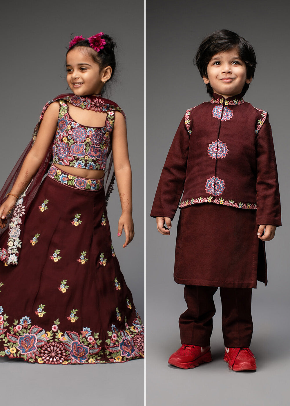 Maroon Embroidered Lehenga and Nehru Jacket Kurta Set - Siblings Set