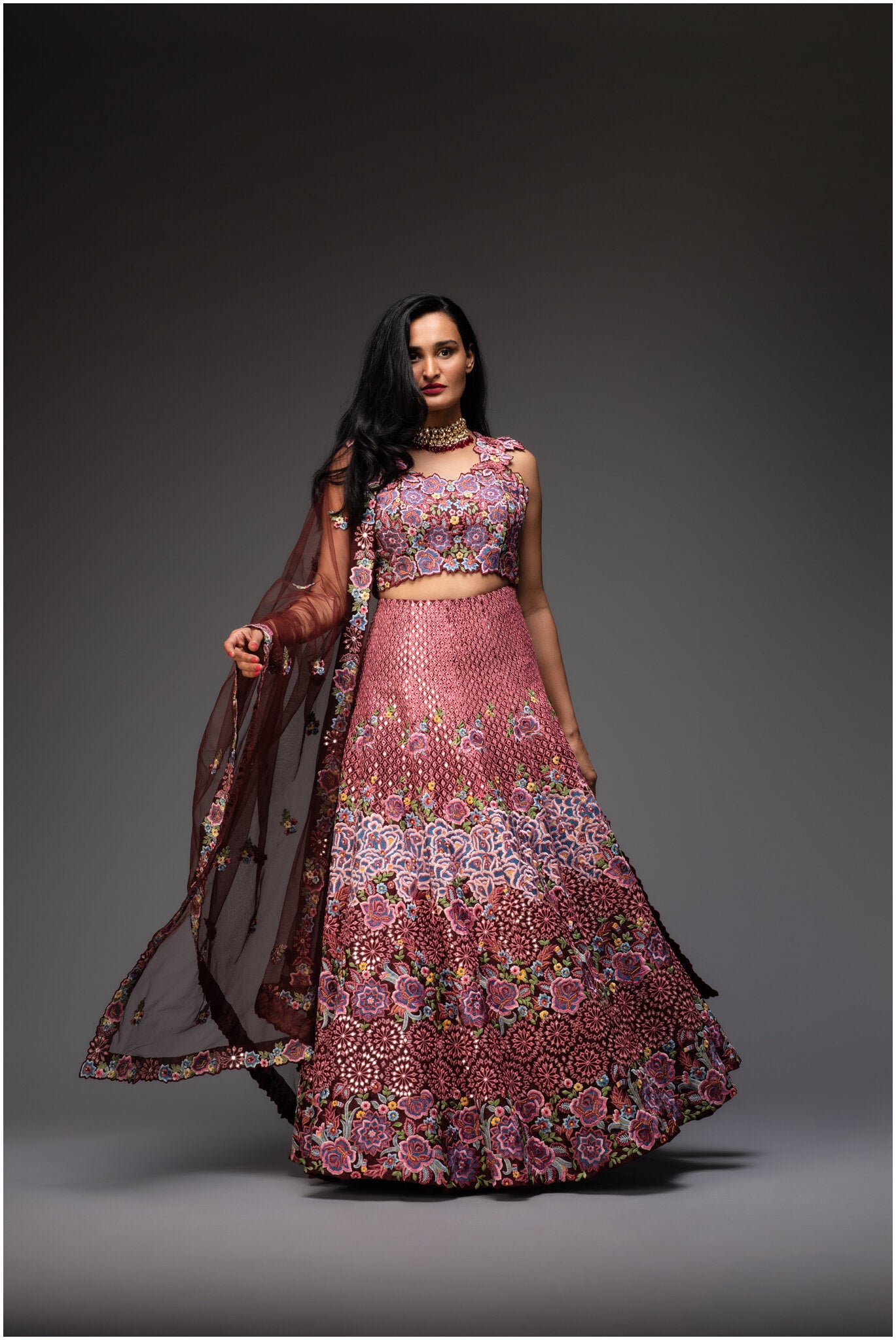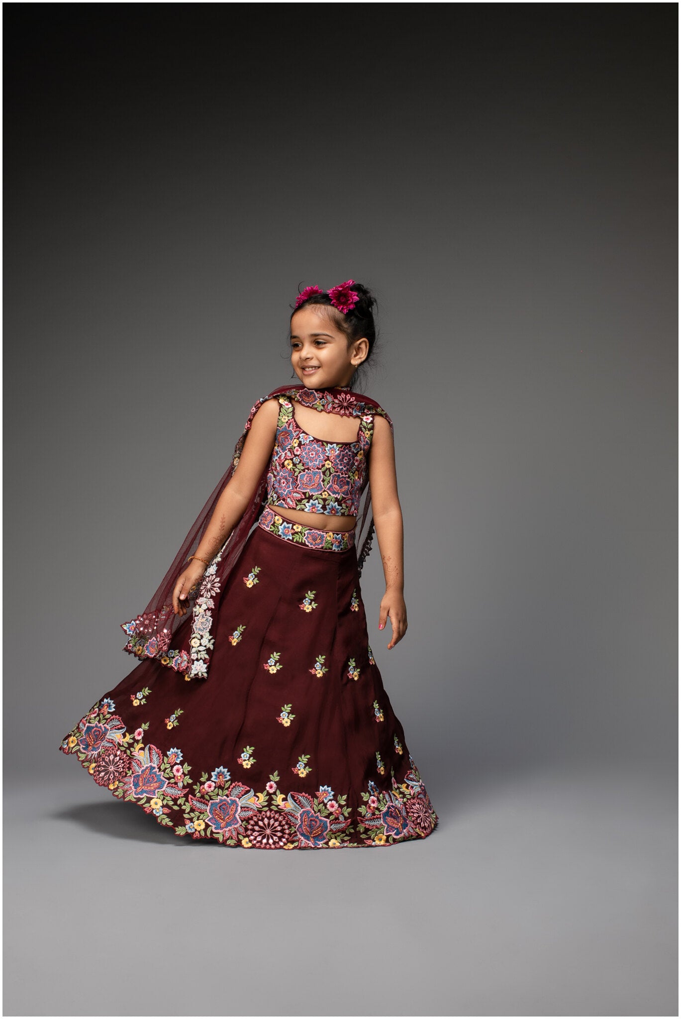This Maroon Organza Embroidered Lehenga Set for girls features intricate thread-mirror embroidery and cutwork hem, lending it a sophisticated and elegant appeal. The set includes a round neckline blouse and a net dupatta, completing the effortlessly chic look.