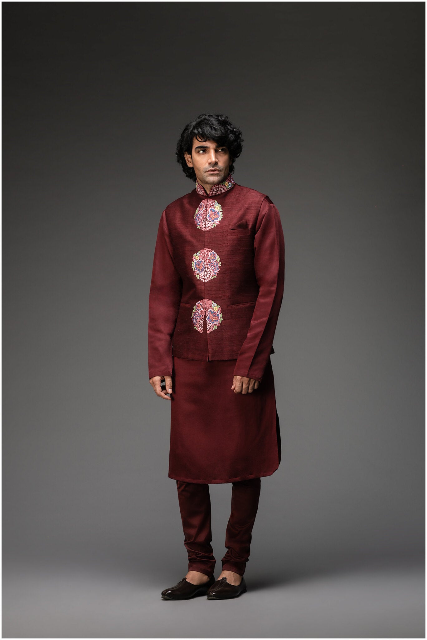 This deep wine nehru jacket for boys features center front mandala motifs in thread and mirror work, paired with a matching kurta and narrow pants for a complete set.