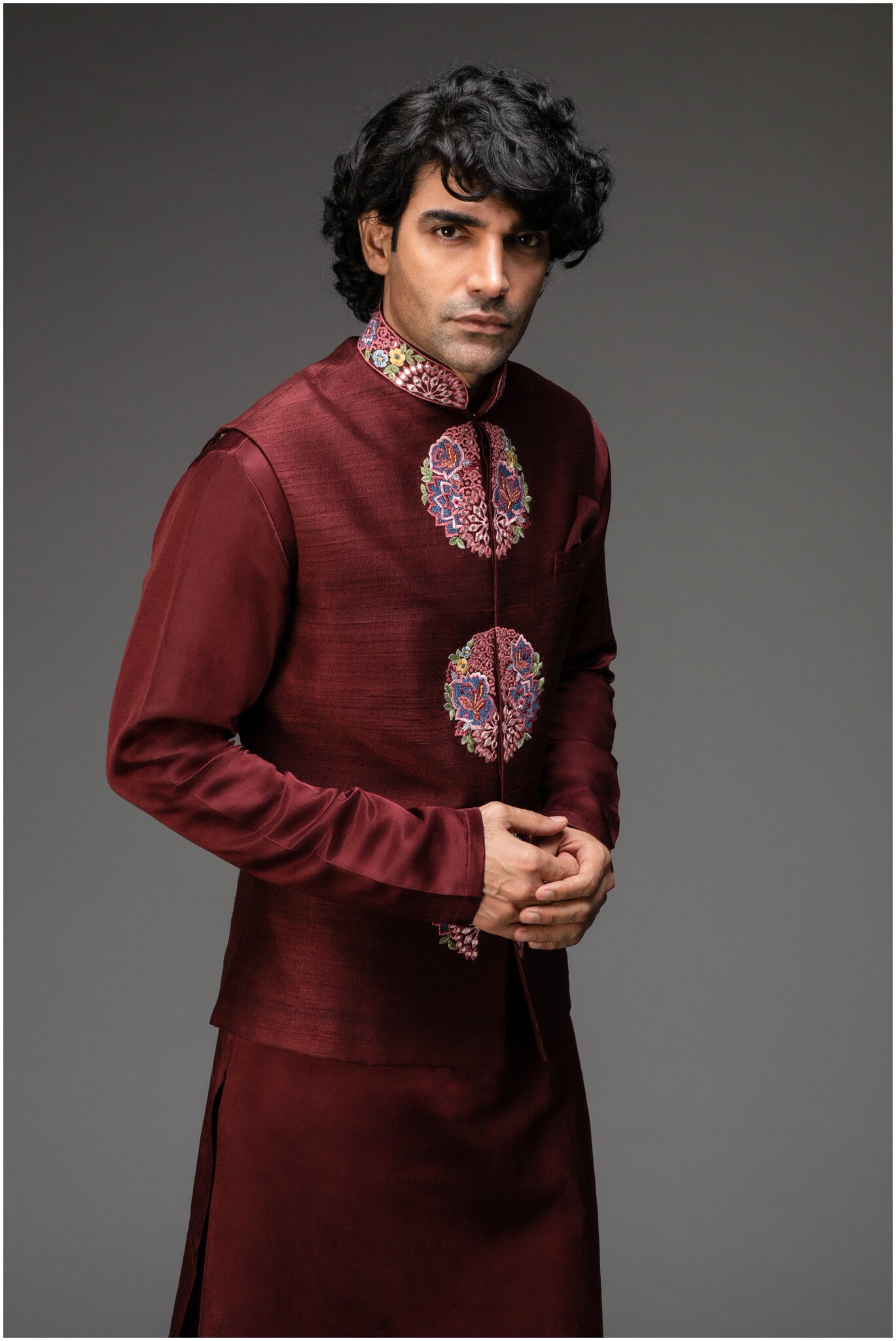 The Deep Wine embroidered nehru jacket for men features front mandala motifs in thread and mirror work. It is paired with a matching kurta with similar embroidery and narrow pants.
