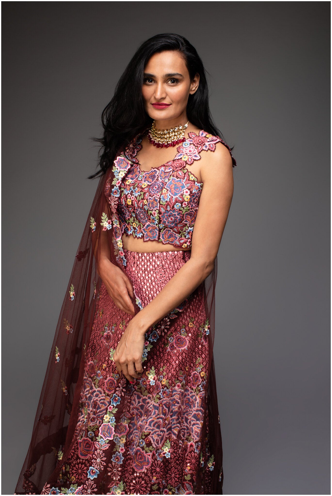 The maroon bridal lehenga set for women features a satin organza lehenga and blouse. The ensemble is adorned with intricate embroidery using multi-color thread and mirrors. A matching net dupatta completes the look.