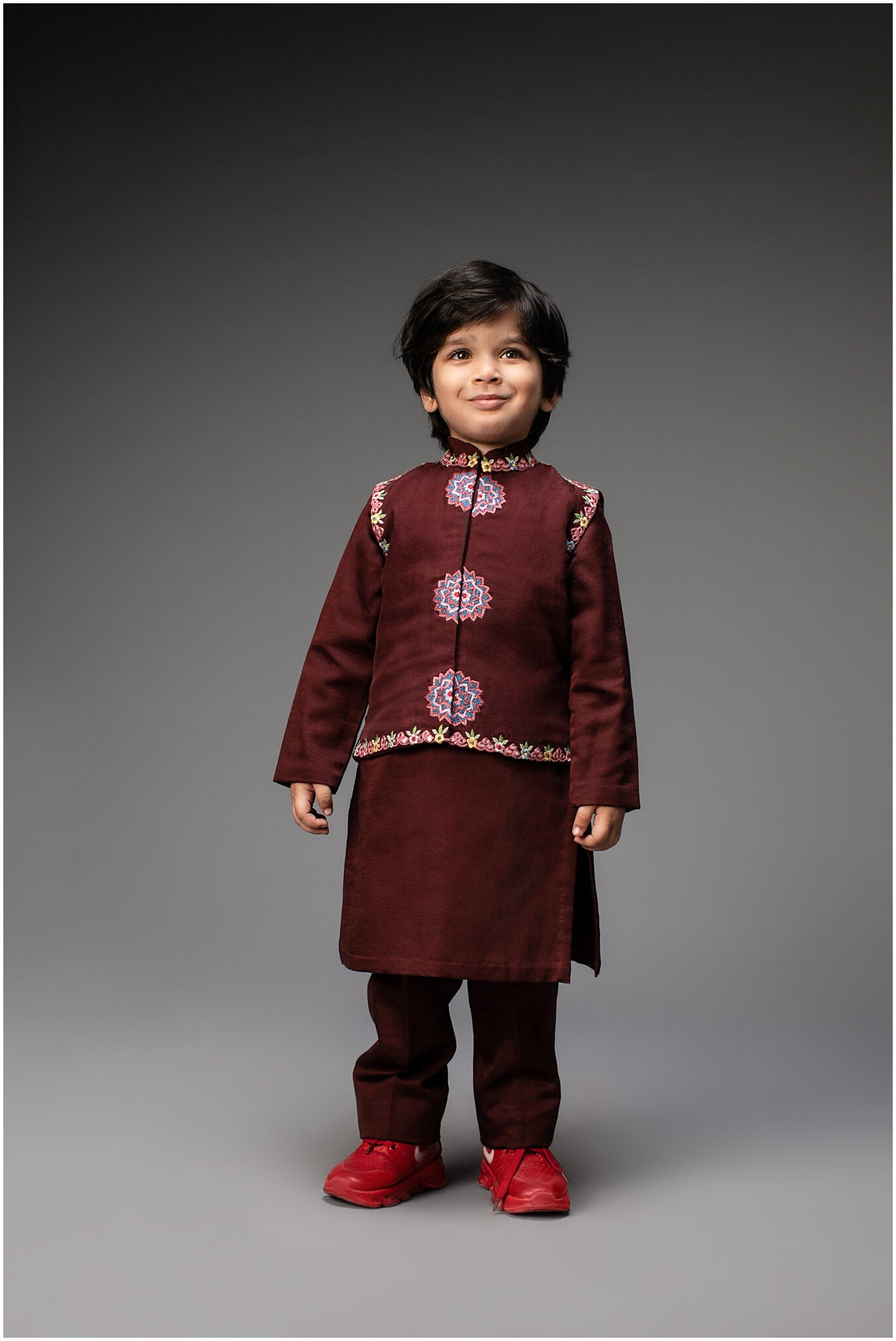 This deep wine nehru jacket features center front mandala motifs in thread and mirror work, paired with a matching kurta and narrow pants for a complete set.