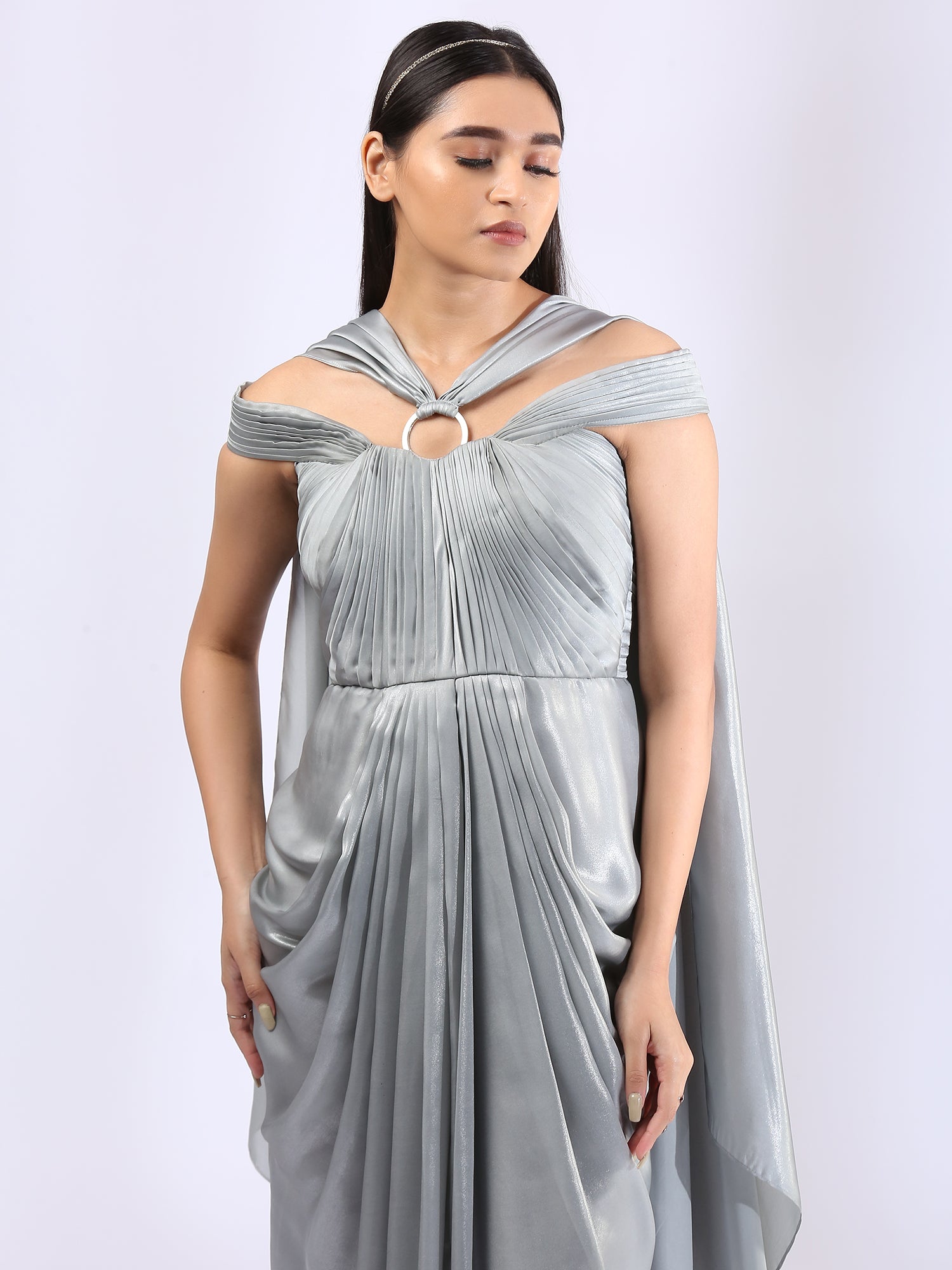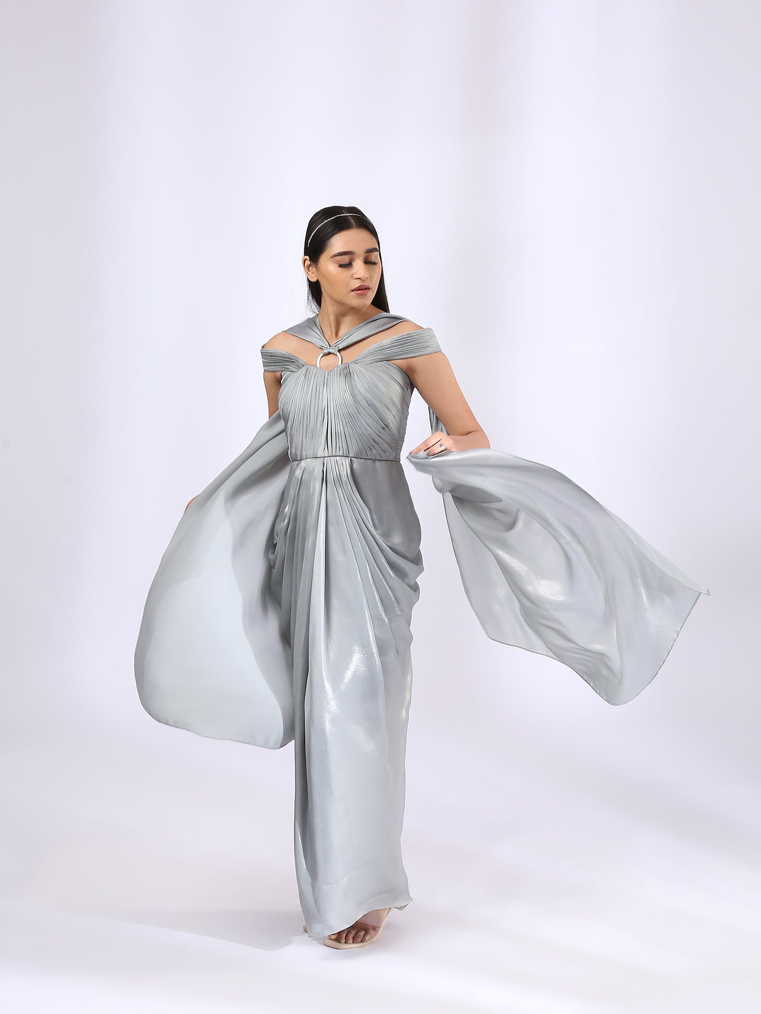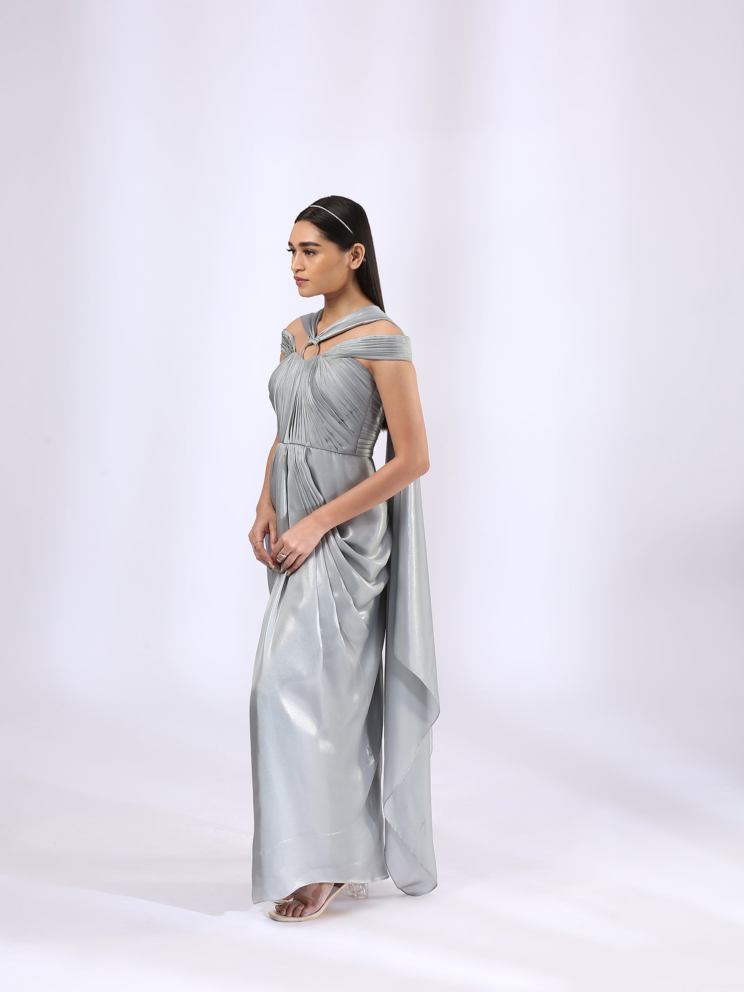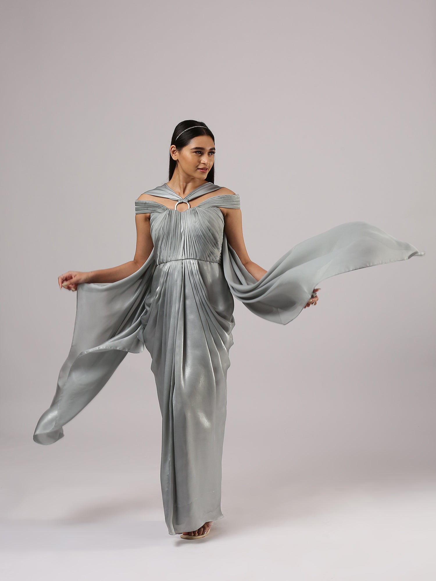 The Metallic Grey Pre Draped Gown features a pleated bodice and draped skirt, accented by a silver metallic ring for added sophistication.