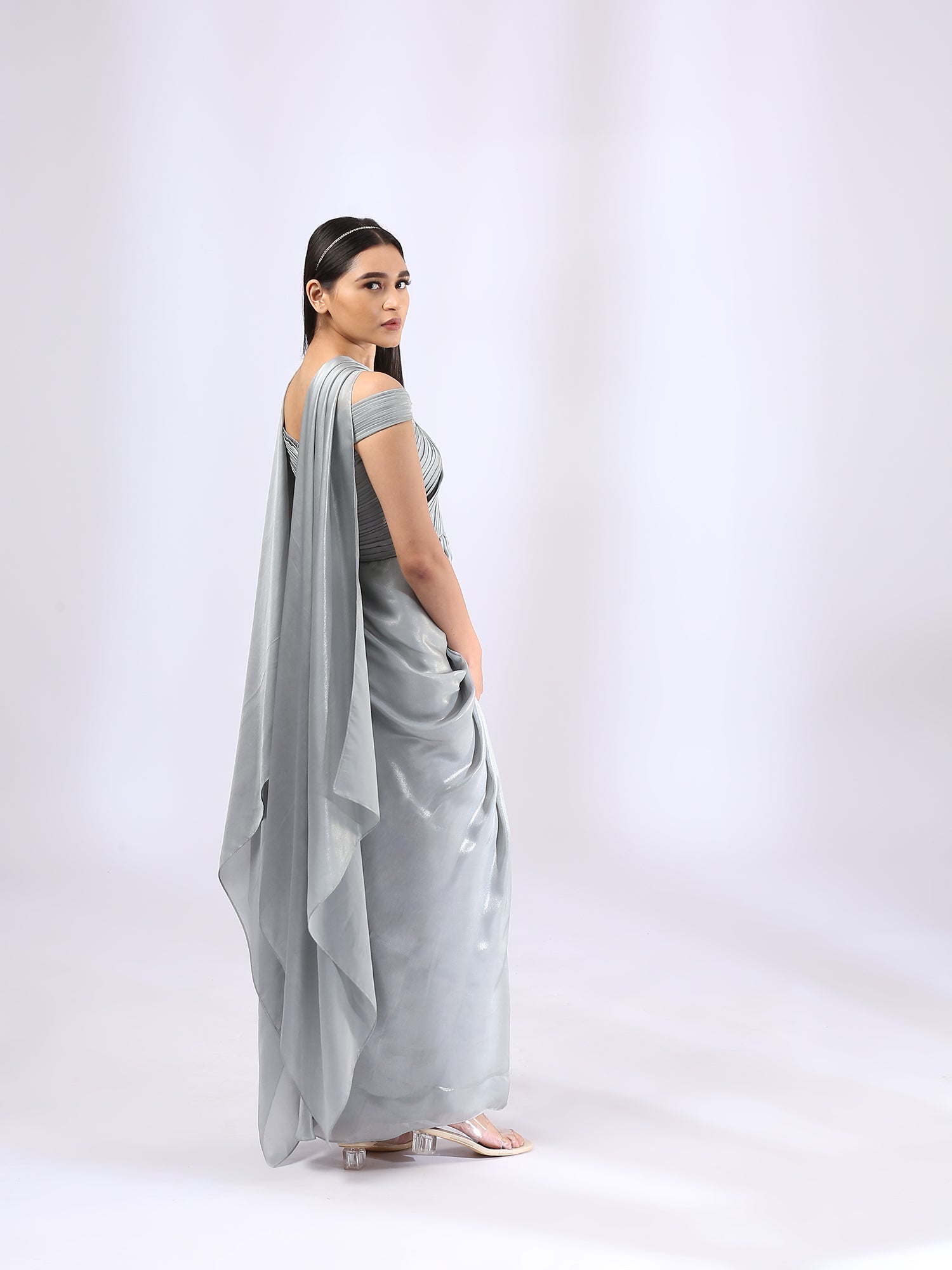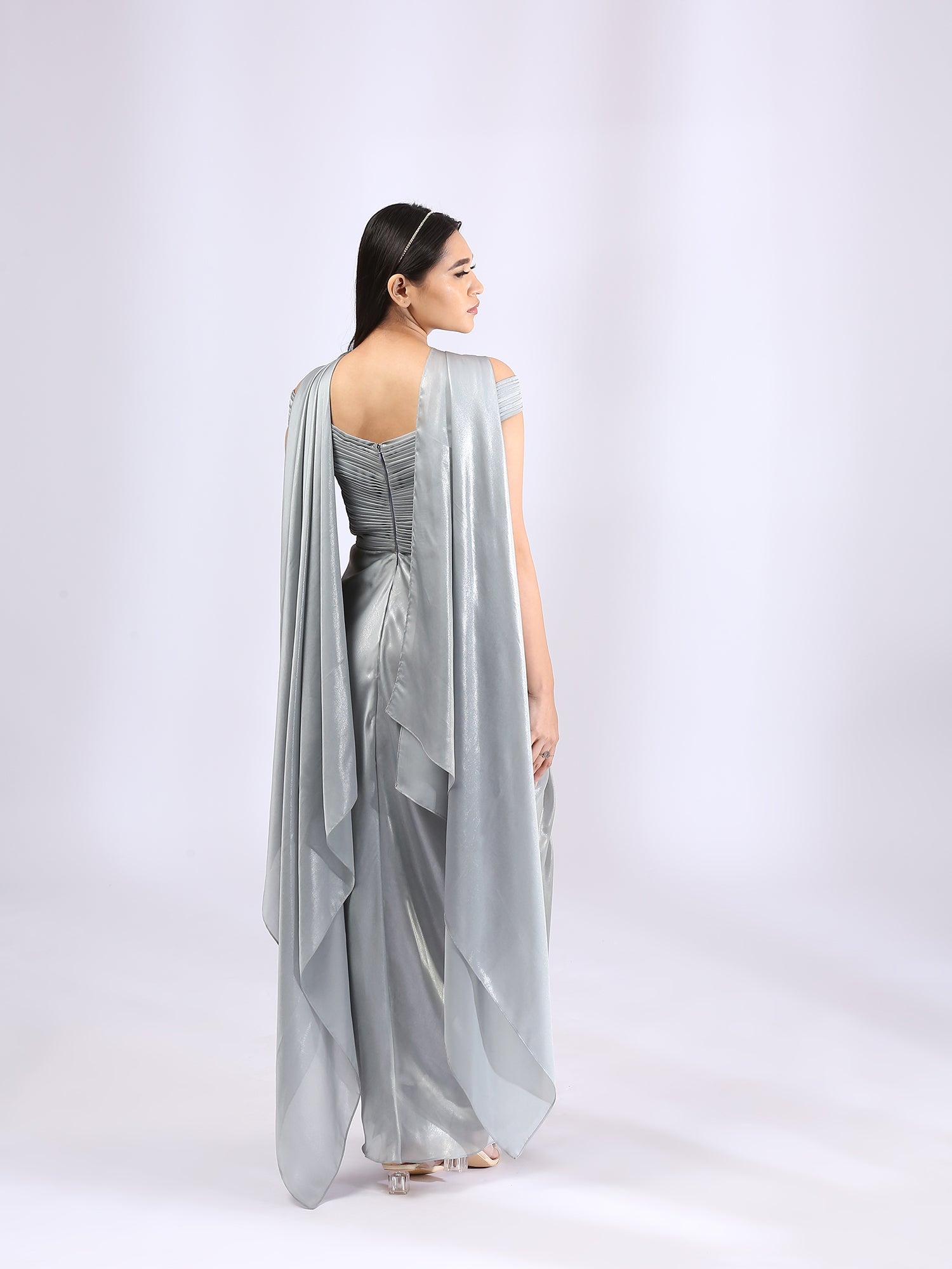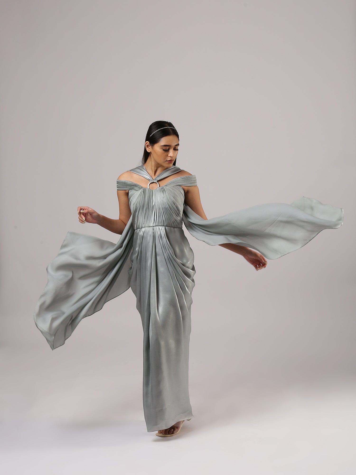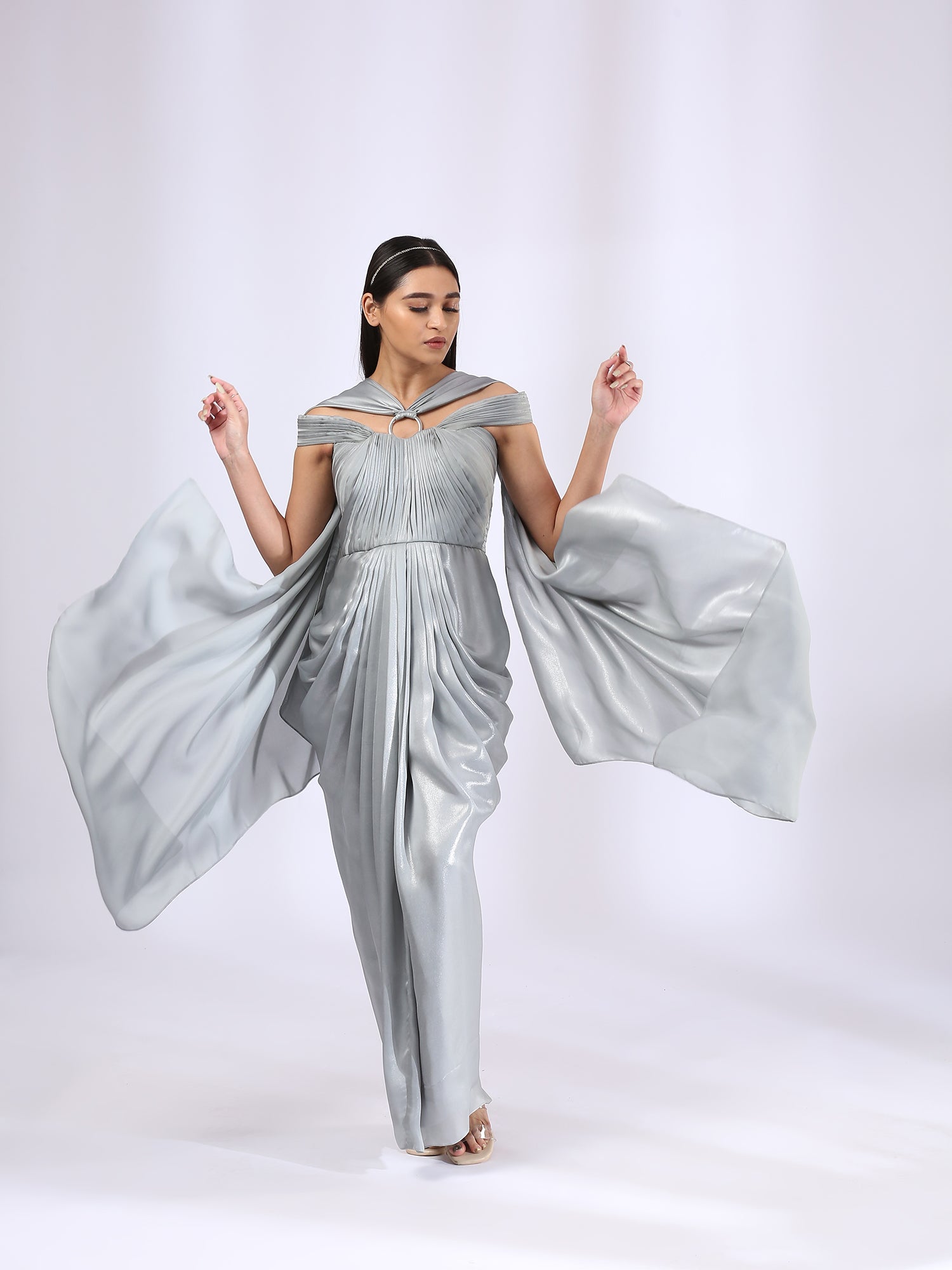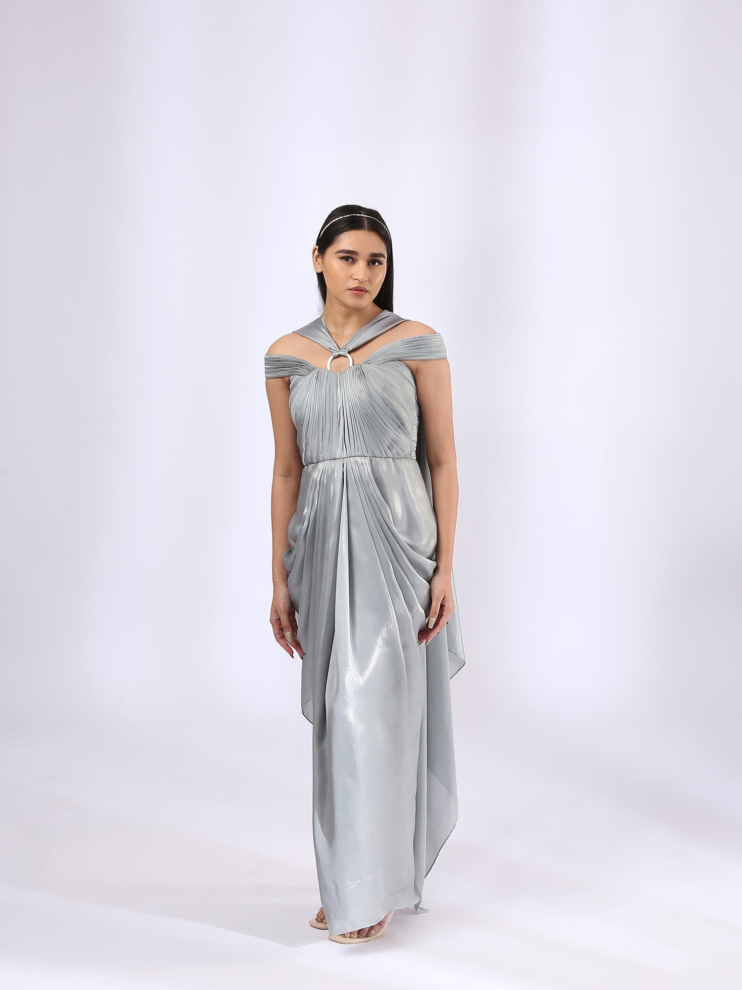 The Metallic Grey Pre Draped Gown features a pleated bodice and draped skirt, accented by a silver metallic ring for added sophistication.