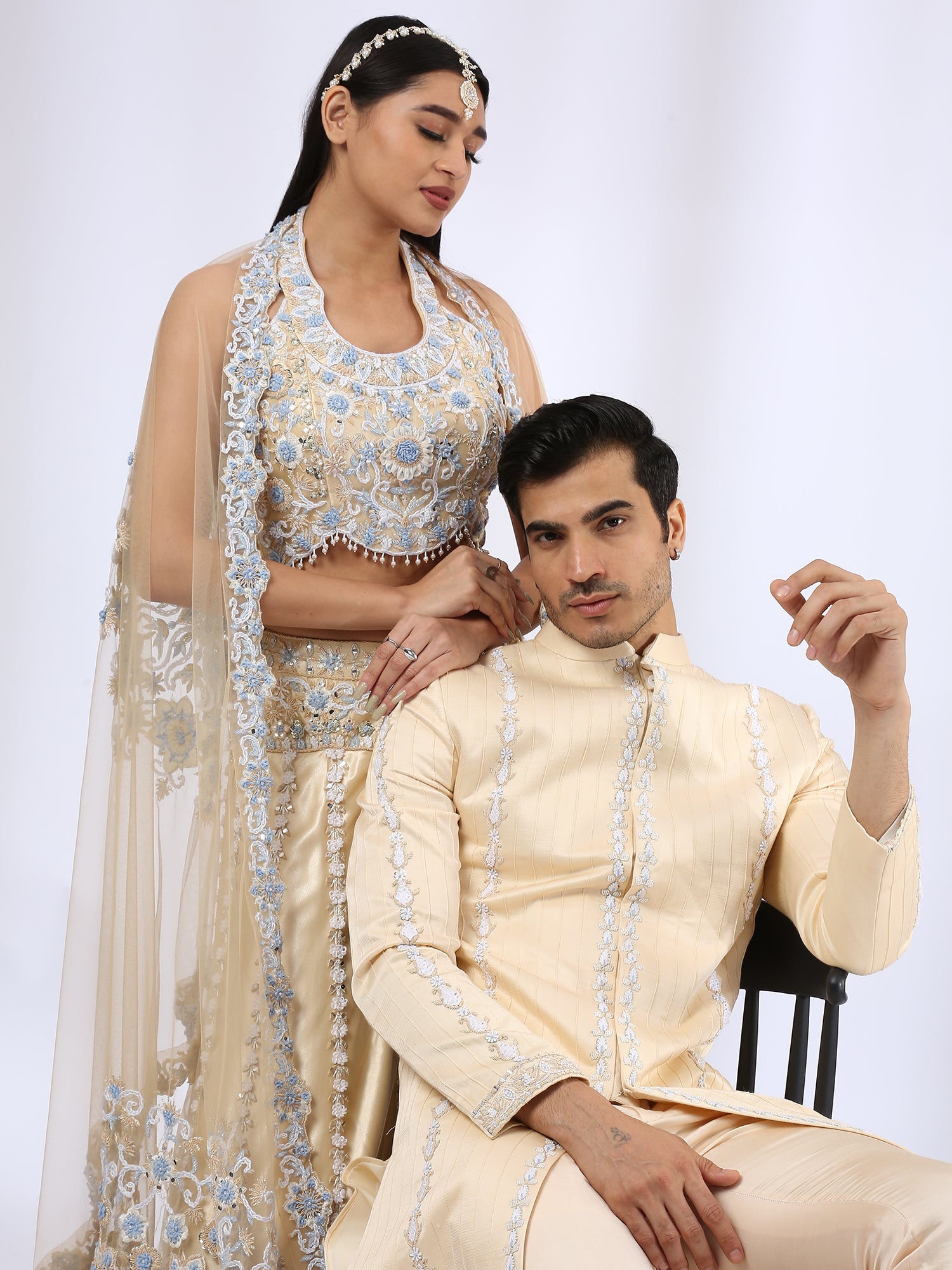 Nude Embroidered Lehenga Choli and Dupatta & Beige Embroidered sherwani with Matching Narrow Pants - Couple Set