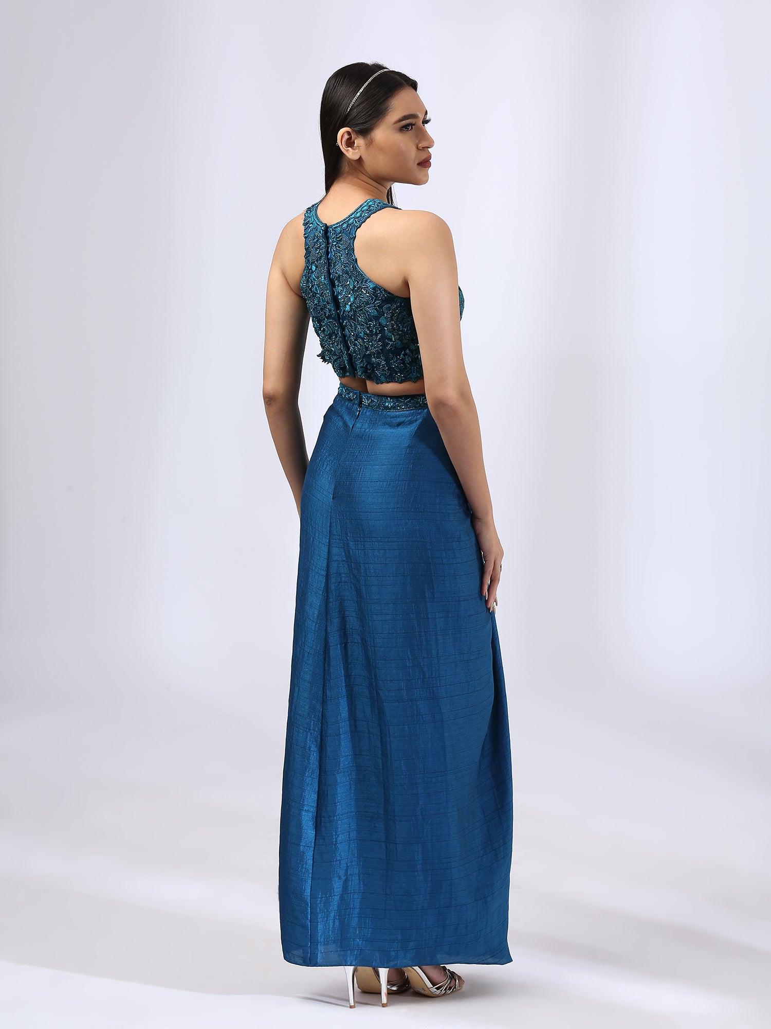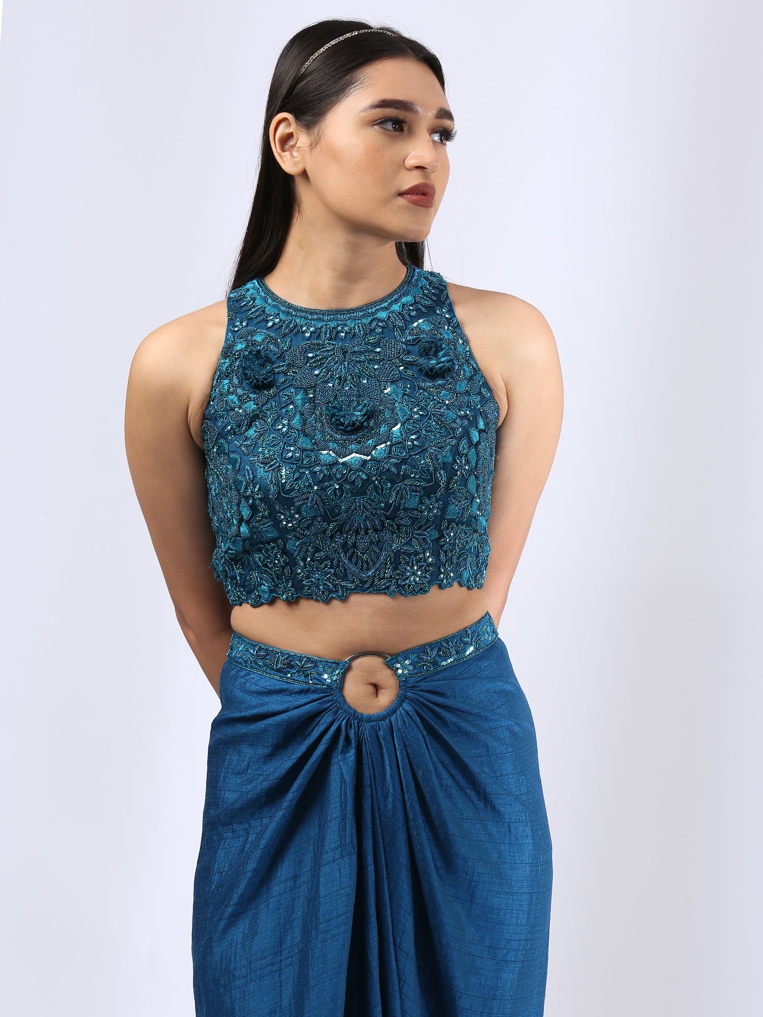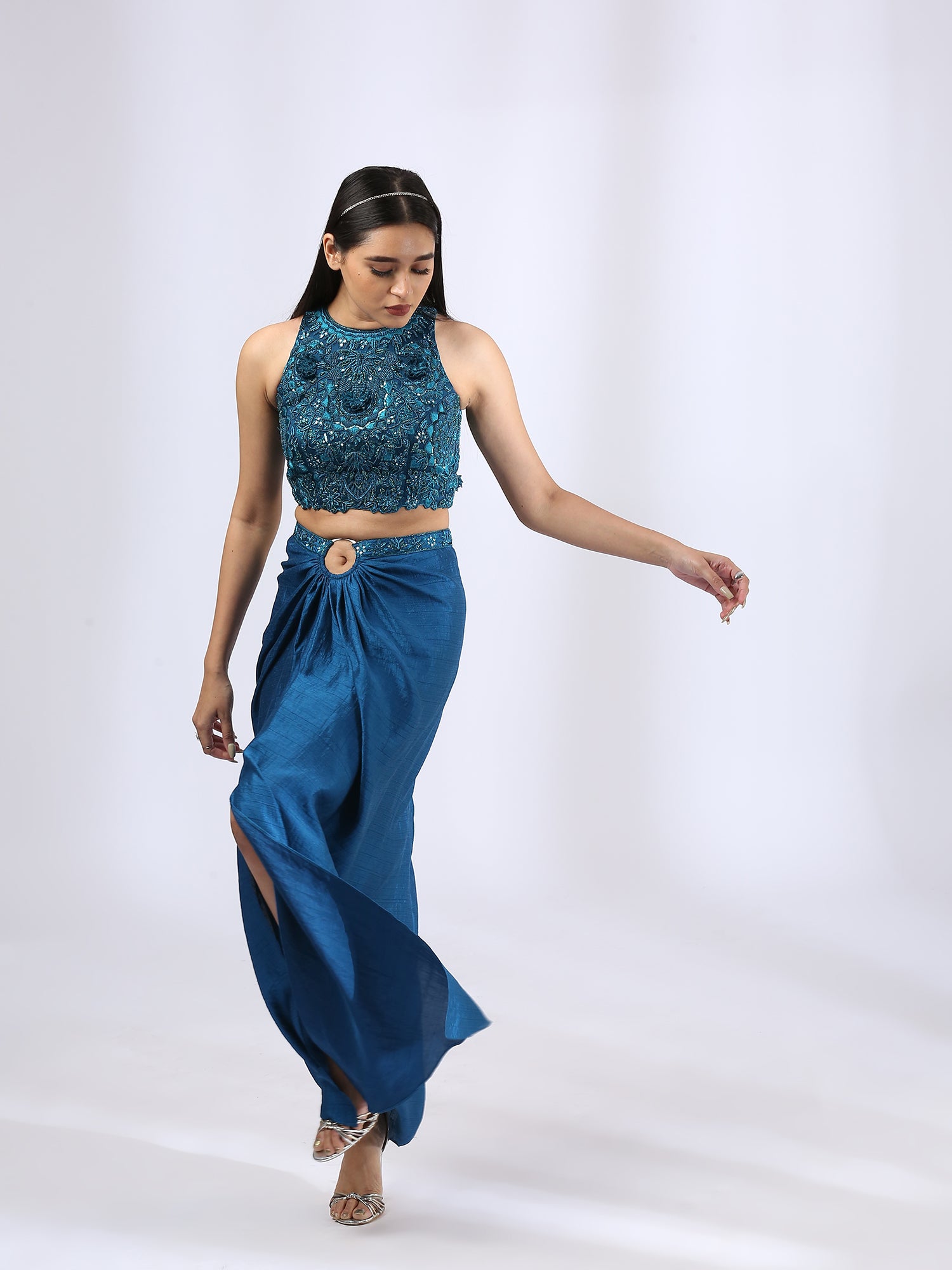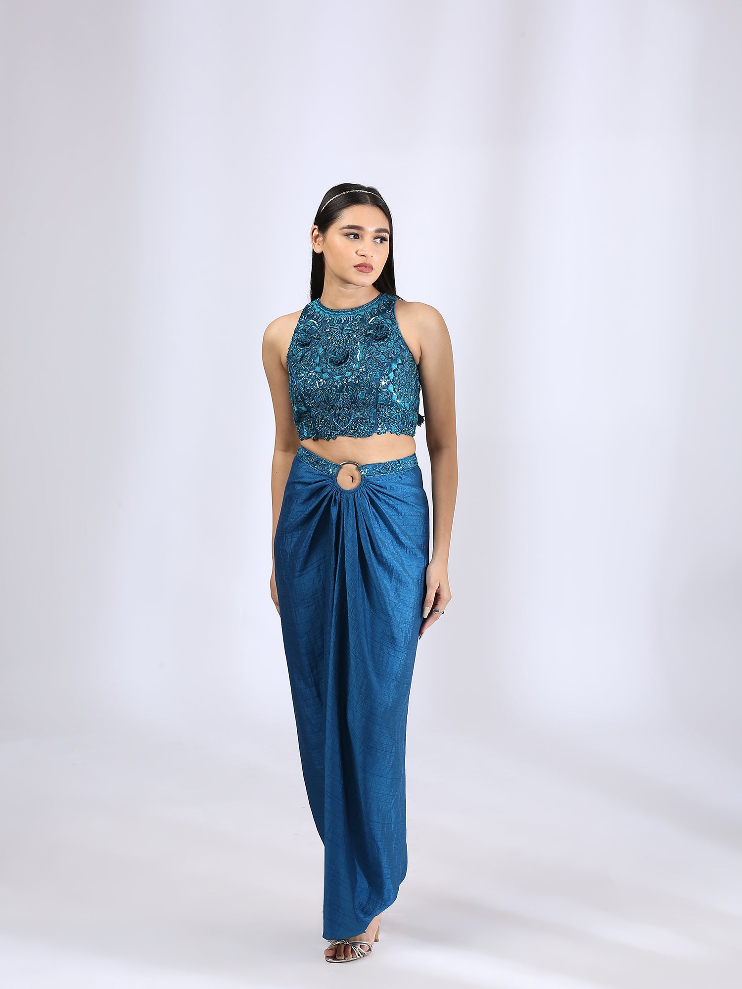 Peacock Blue Embroidered Top and Draped Skirt Set