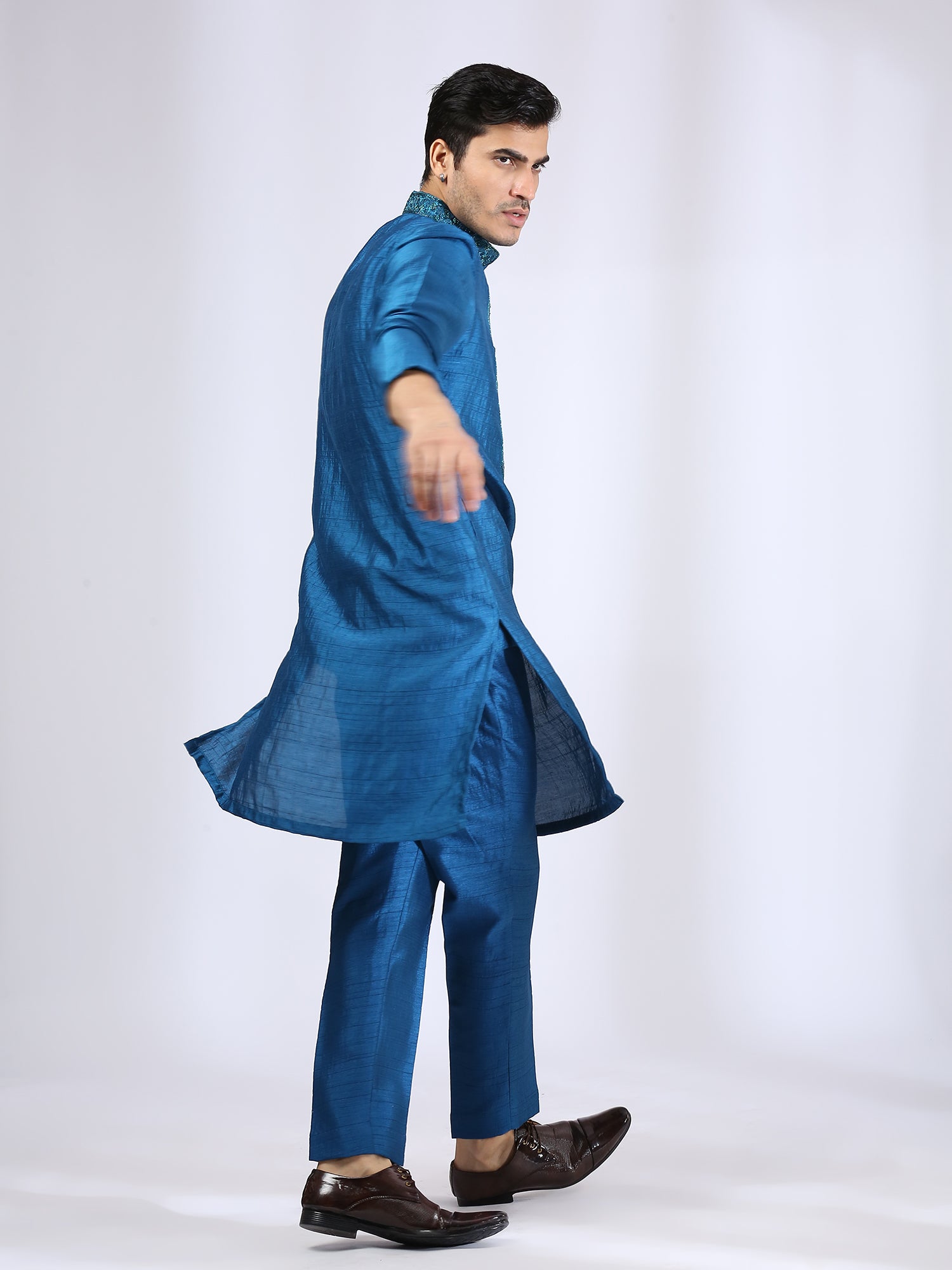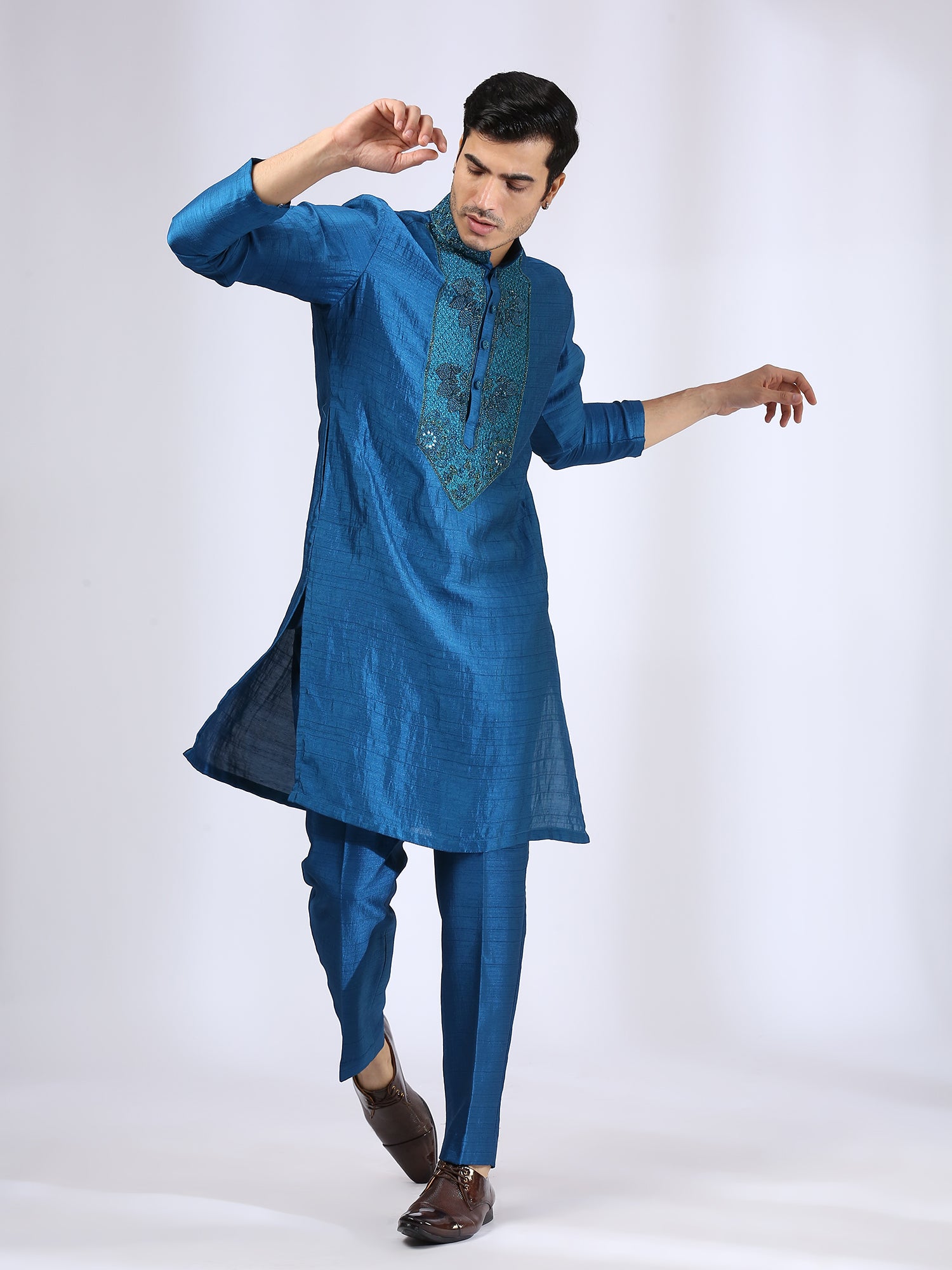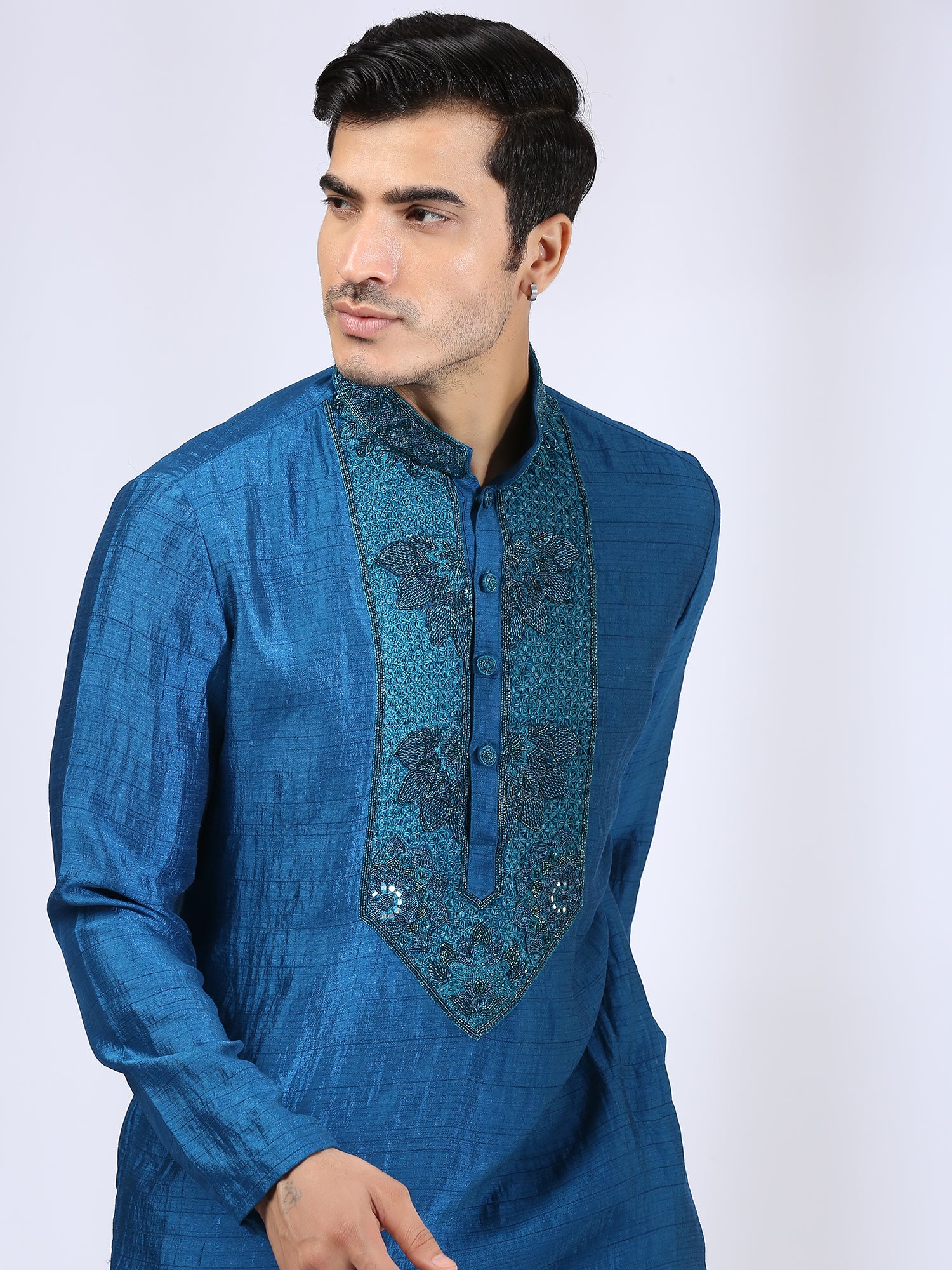 Peacock Blue Kurta with an embroidered yoke in thread and zardozi work. It is teamed with narrow pants.