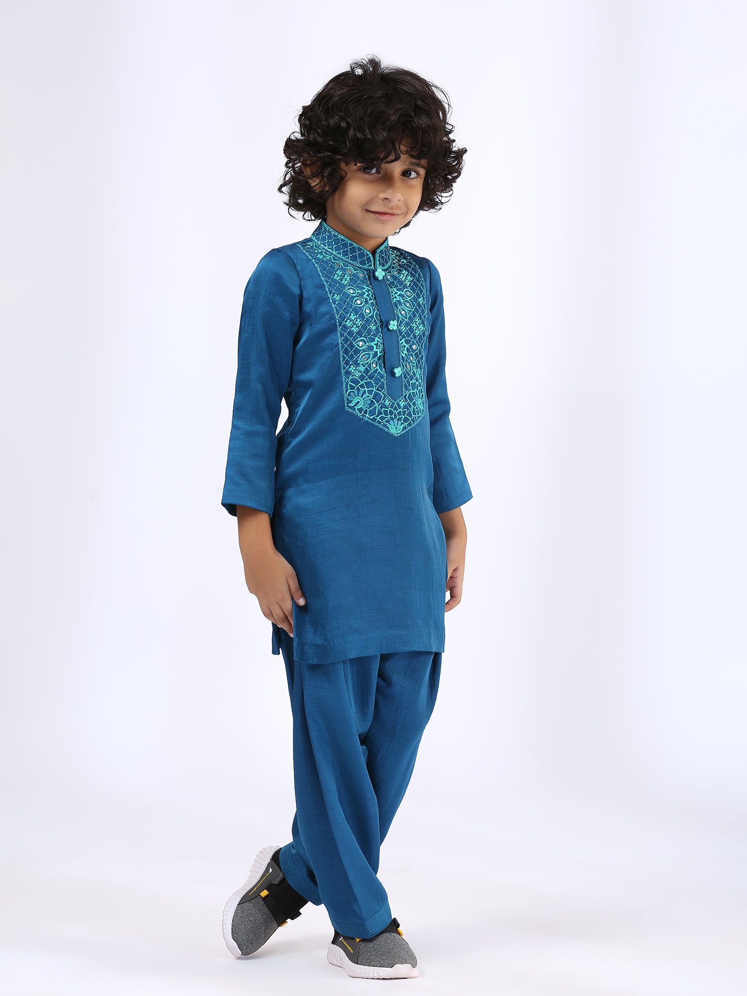 Peacock Blue Kurta with an embroidered yoke in thread and zardozi work. It is teamed with narrow pants for both father and son.