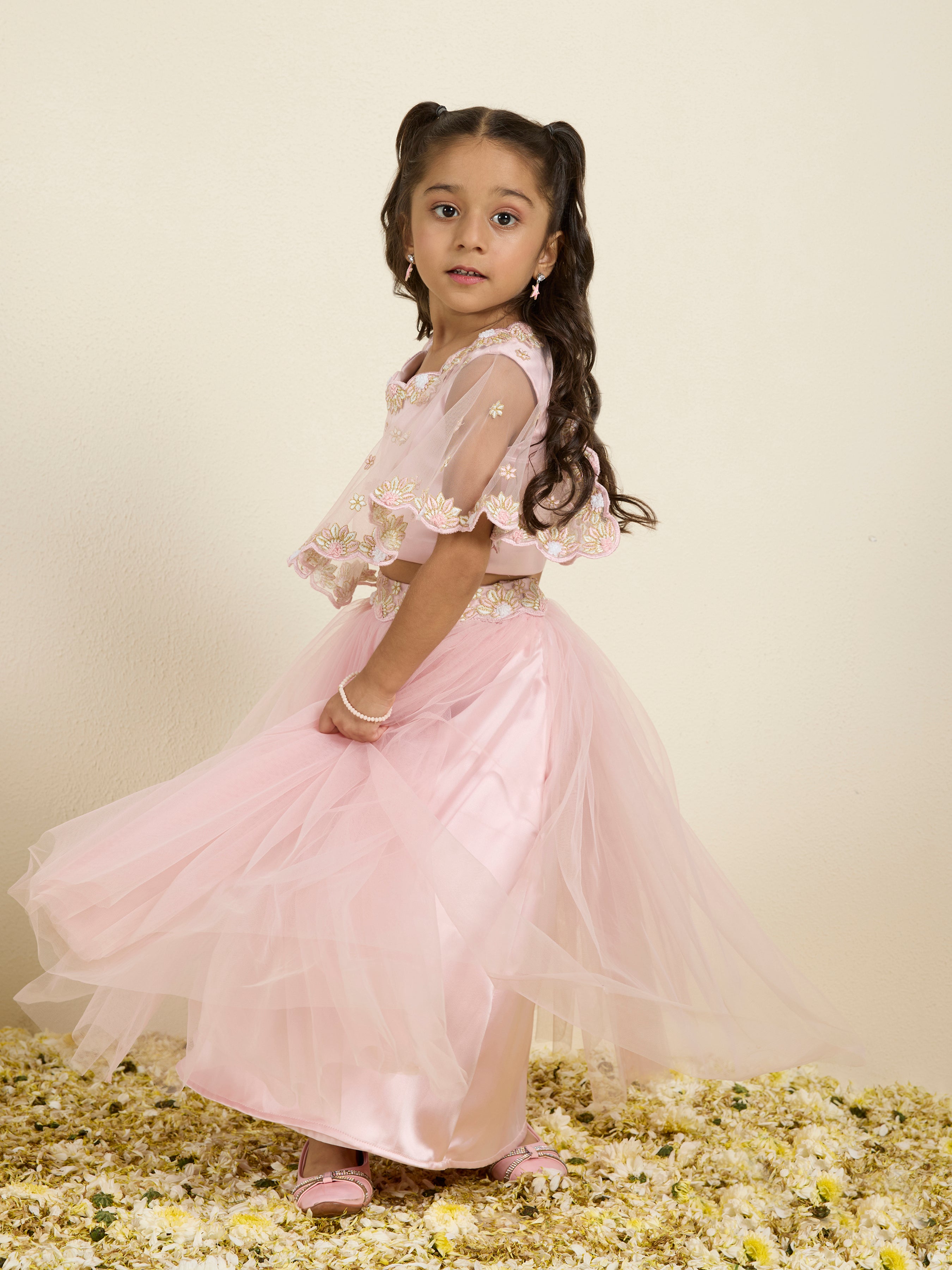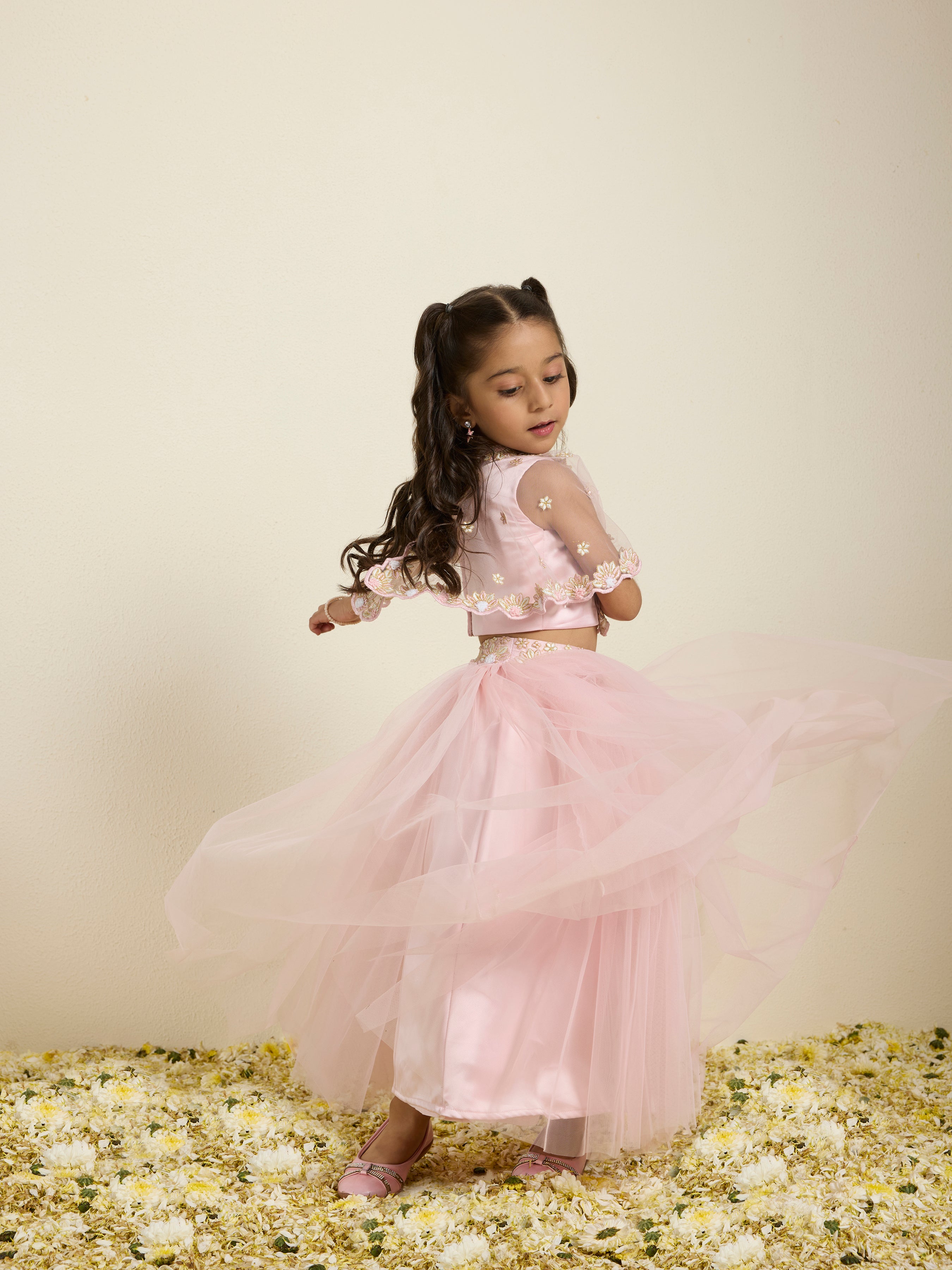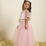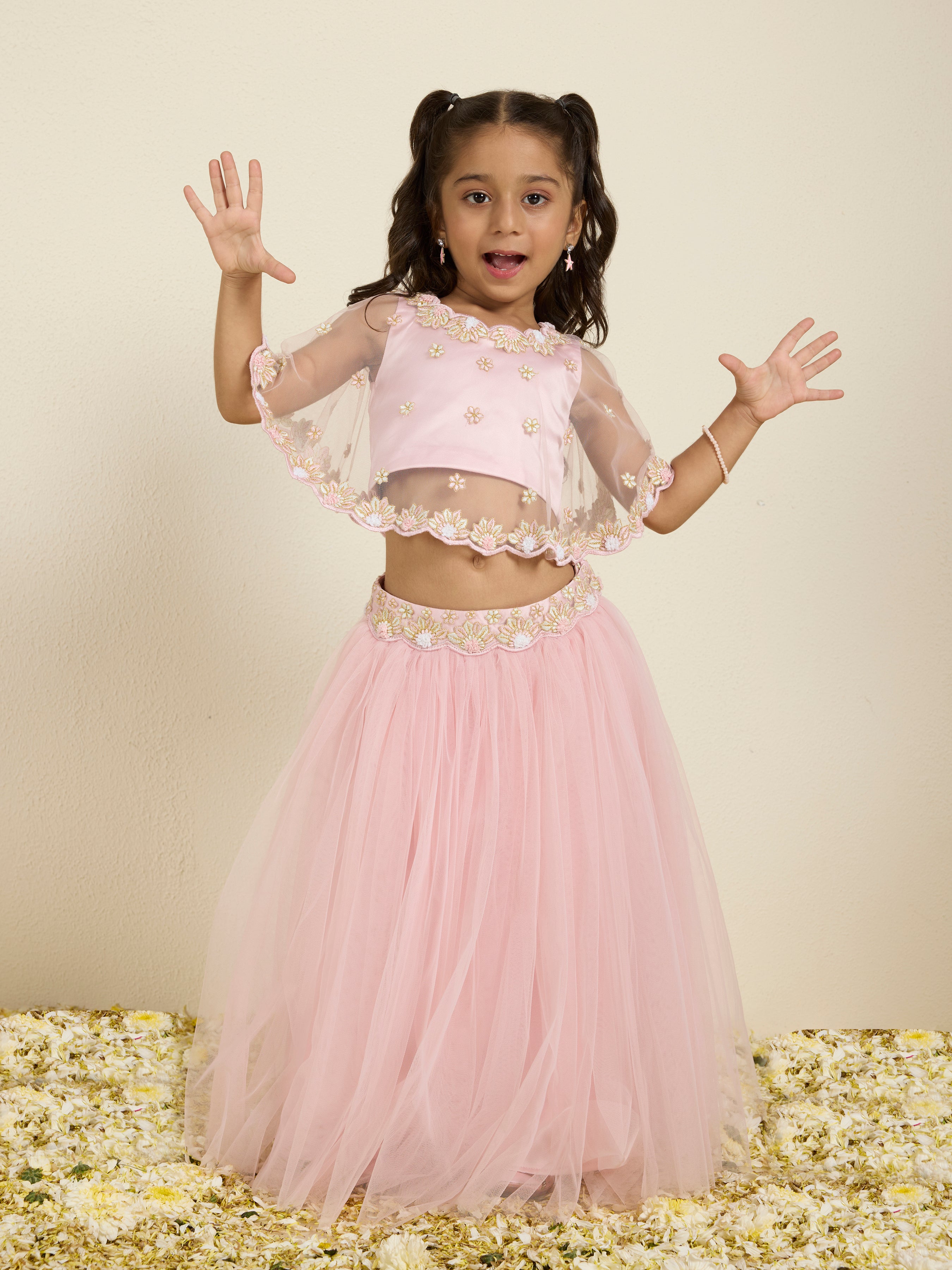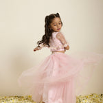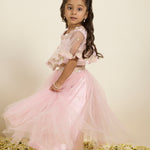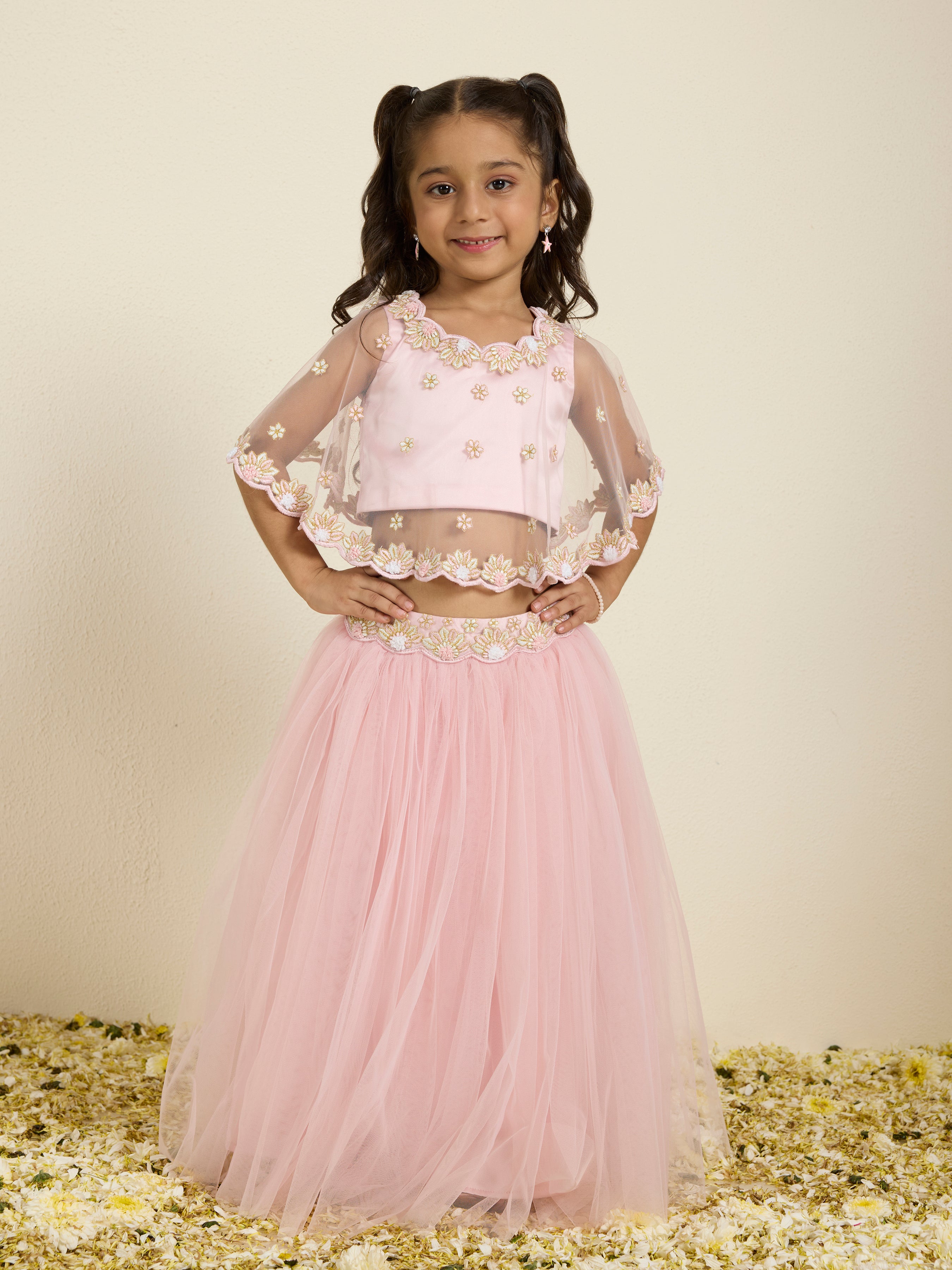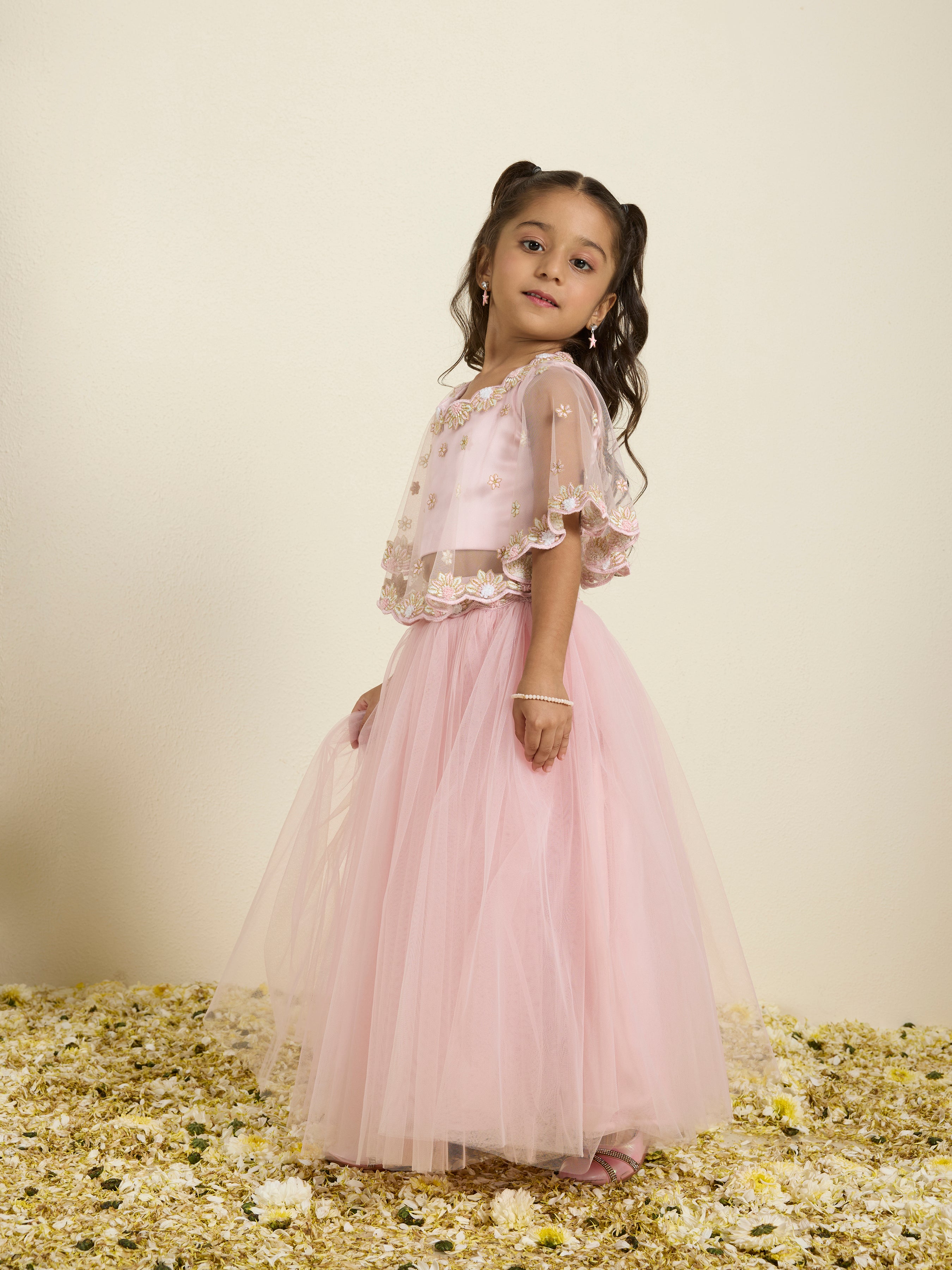 Create a magical look for your little one with this girls’ pink satin choli paired with a beautifully embroidered tulle cape that adds elegance and charm. The set is completed with a voluminous poofy tulle lehenga, perfect for weddings, parties, and festive occasions. Designed with a blend of soft satin and delicate tulle, this ensemble balances comfort and style, making it an ideal choice for special moments.