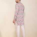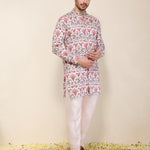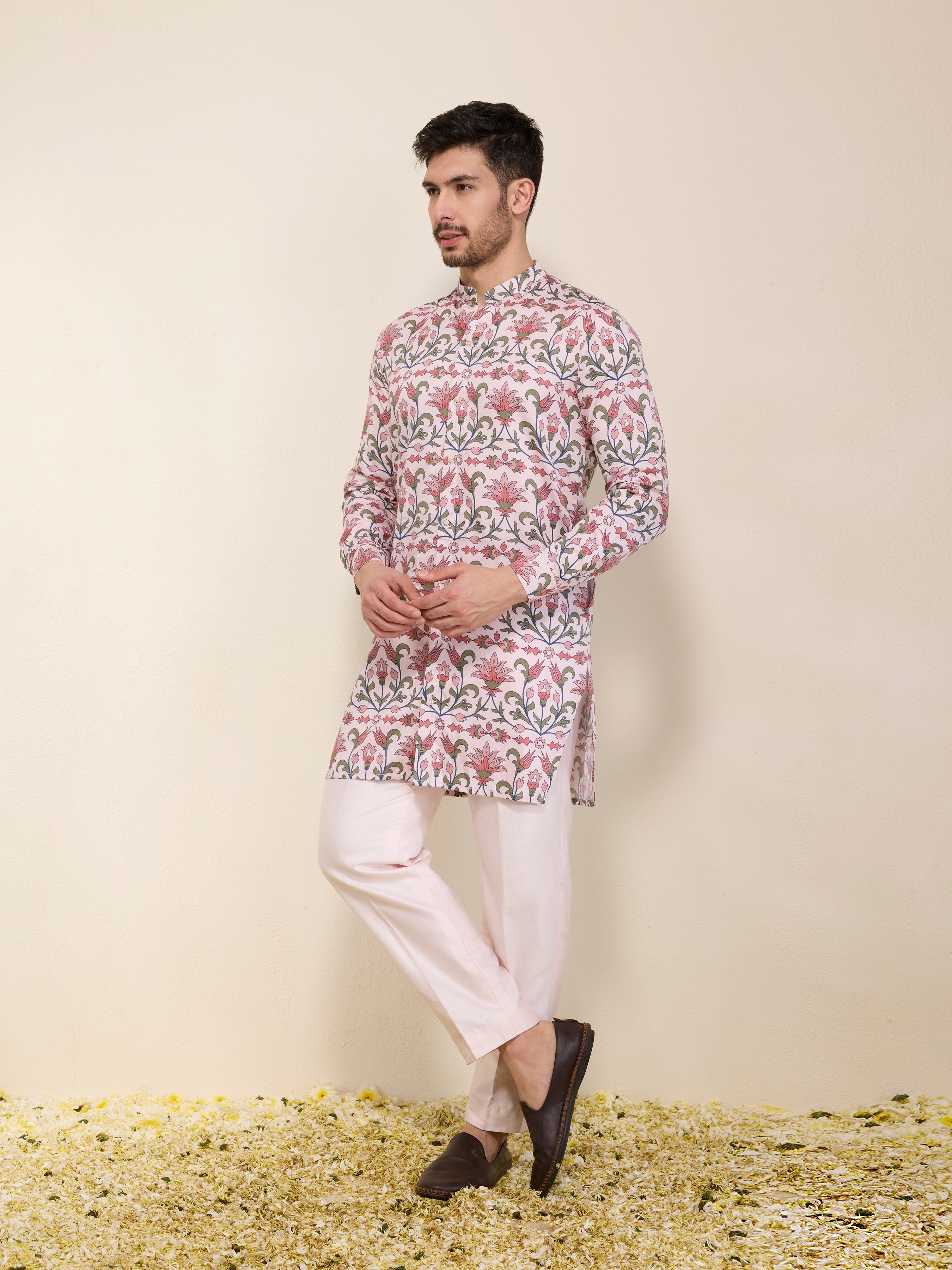 Elevate your traditional wardrobe with this stylish men’s pink printed satin linen front open kurta, featuring elegant metal buttons for a modern touch. The set is complemented by comfortable matching baby pink pants, perfect for weddings, festivals, and festive gatherings. Crafted from breathable satin linen fabric, this ensemble combines contemporary design with classic elegance, making it ideal for special occasions.