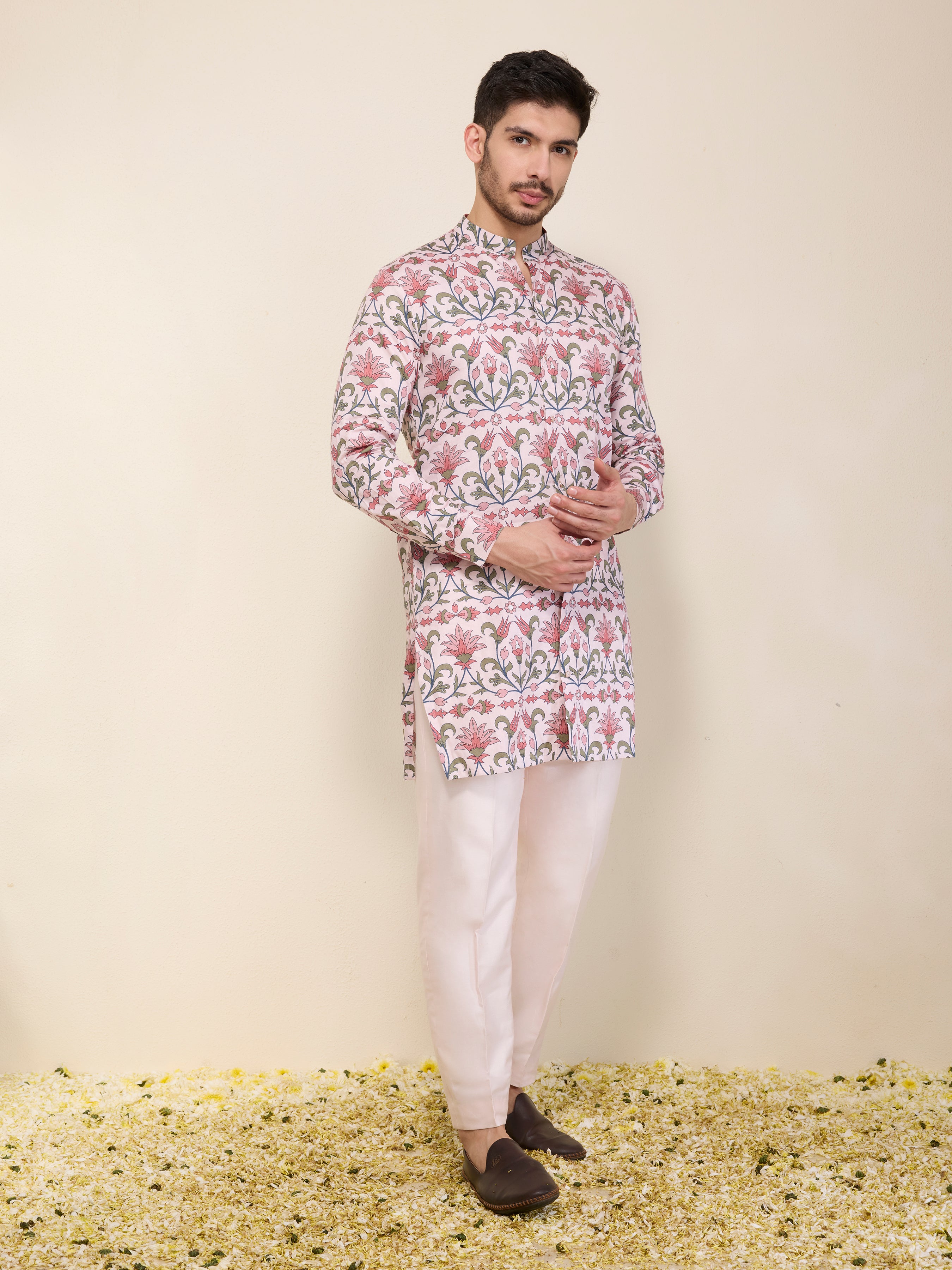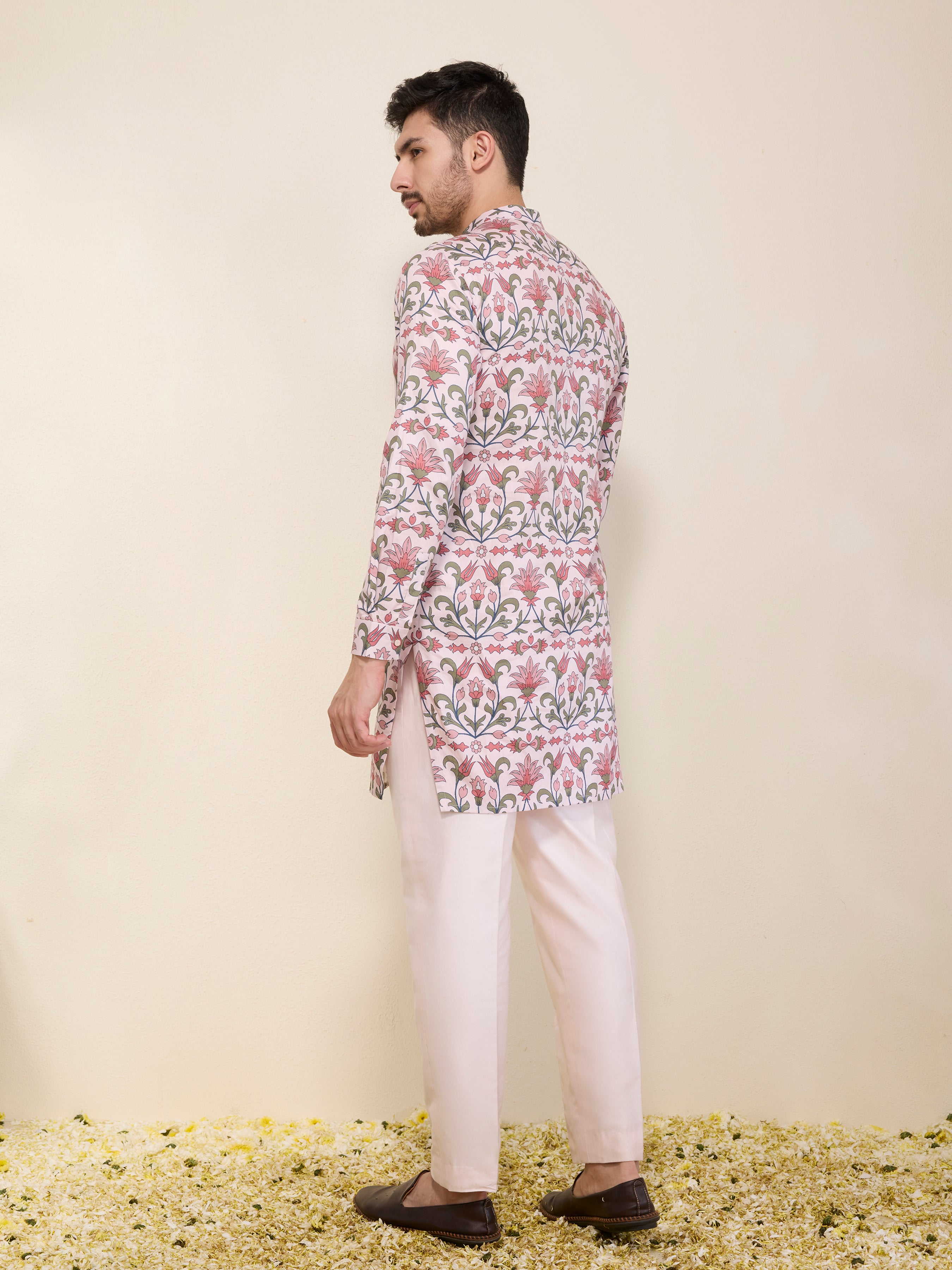 Pink Printed Satin Linen Front Open Kurta with Matching Pants