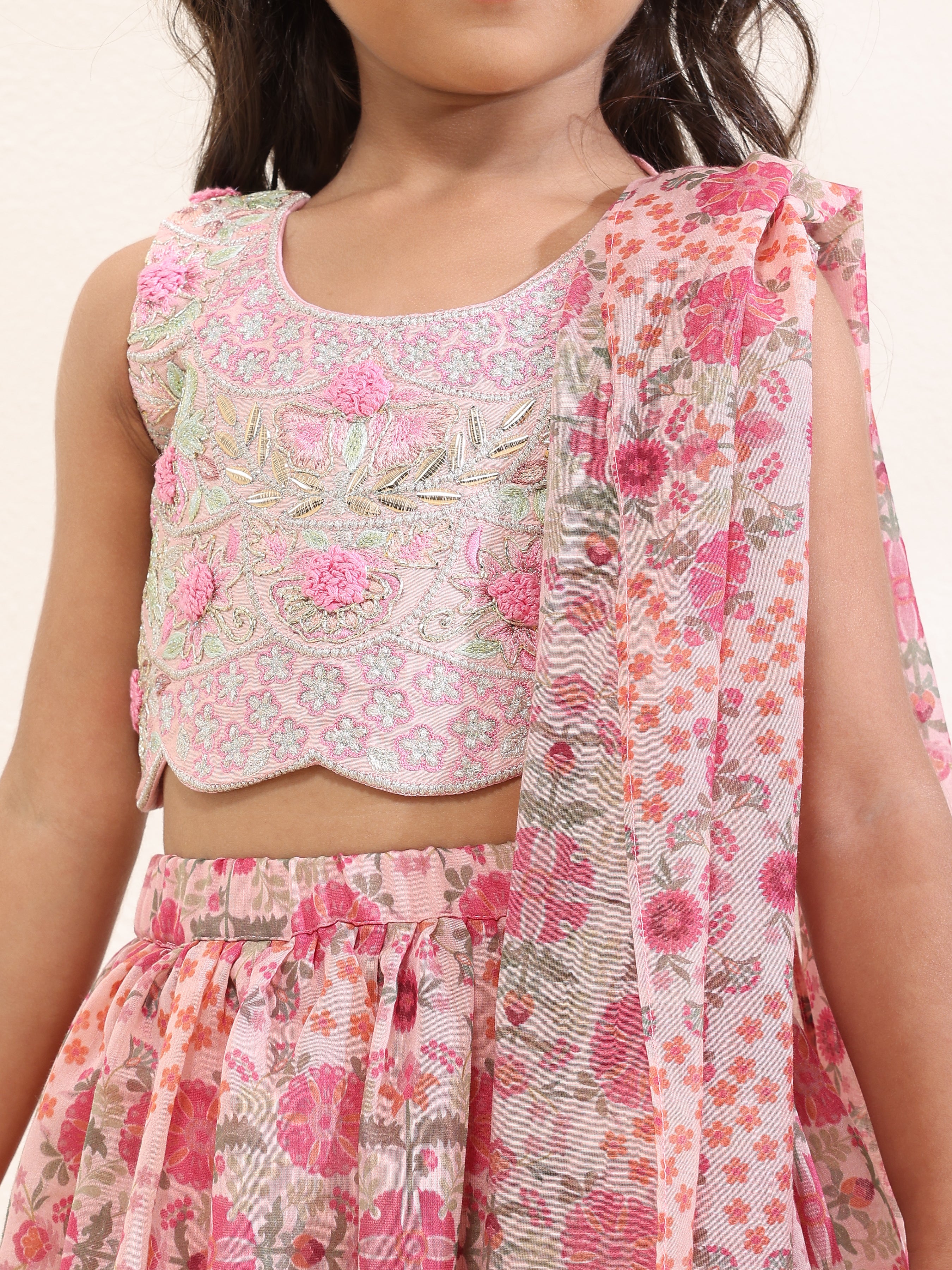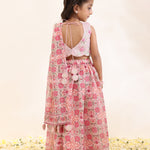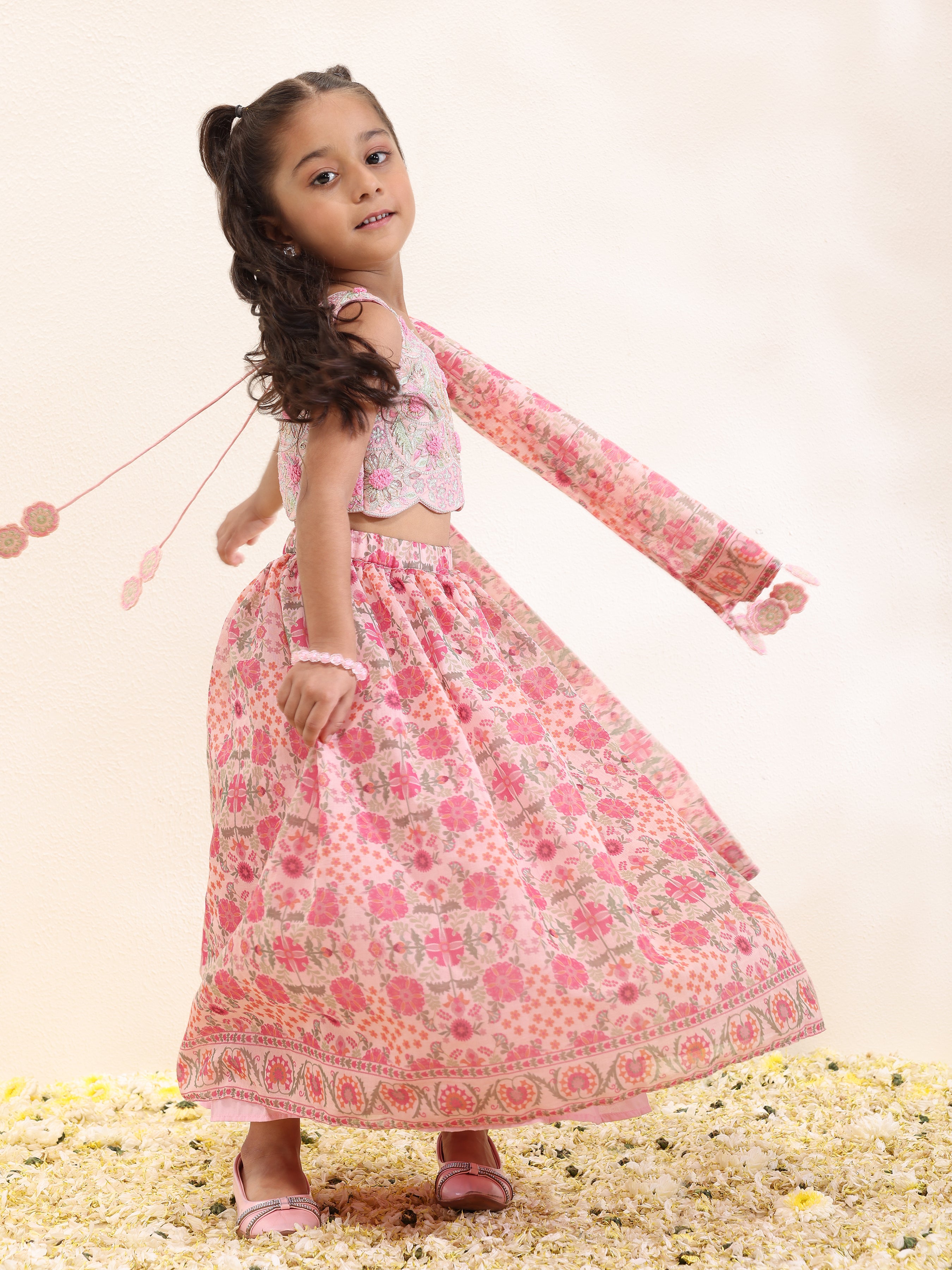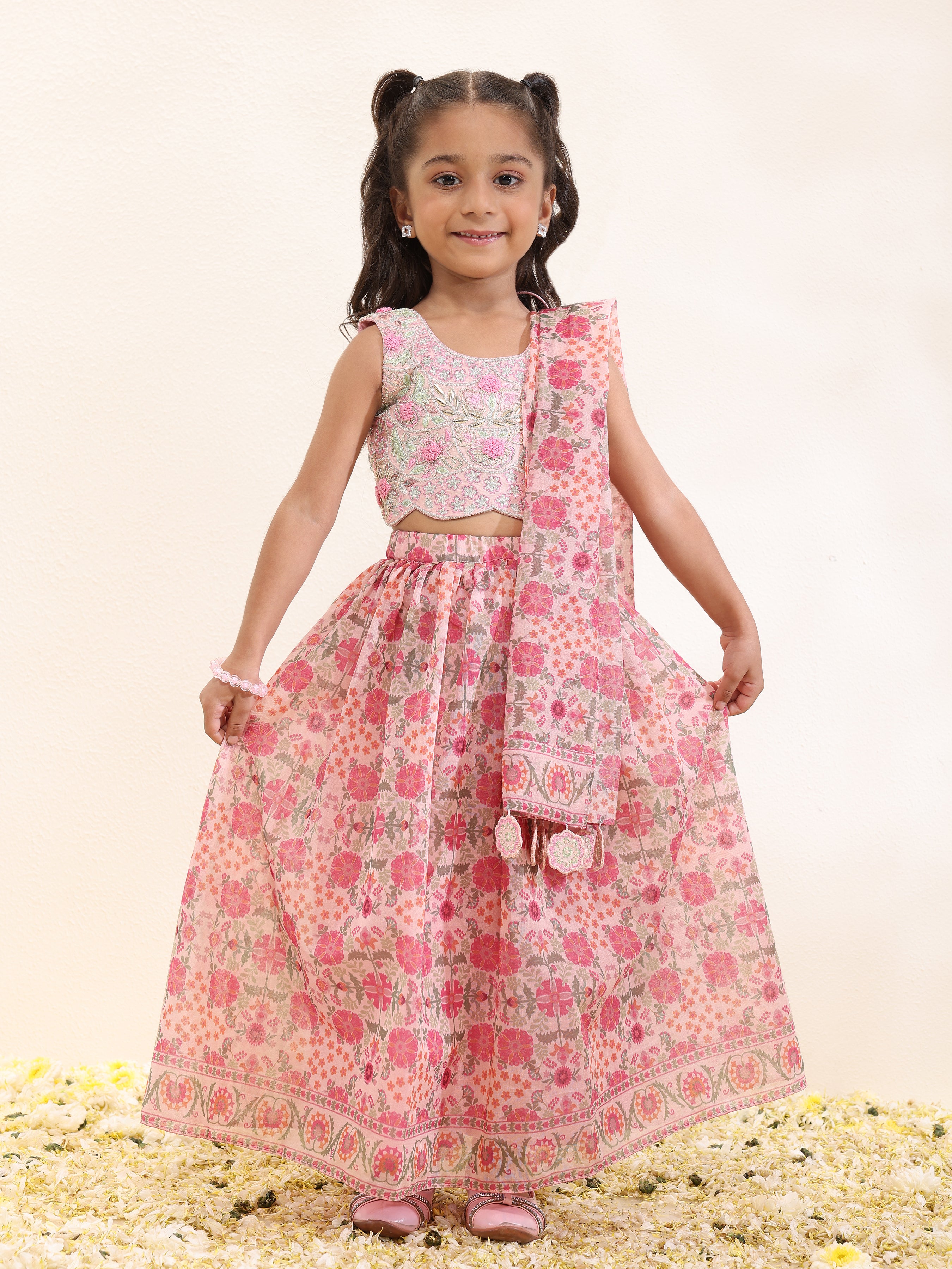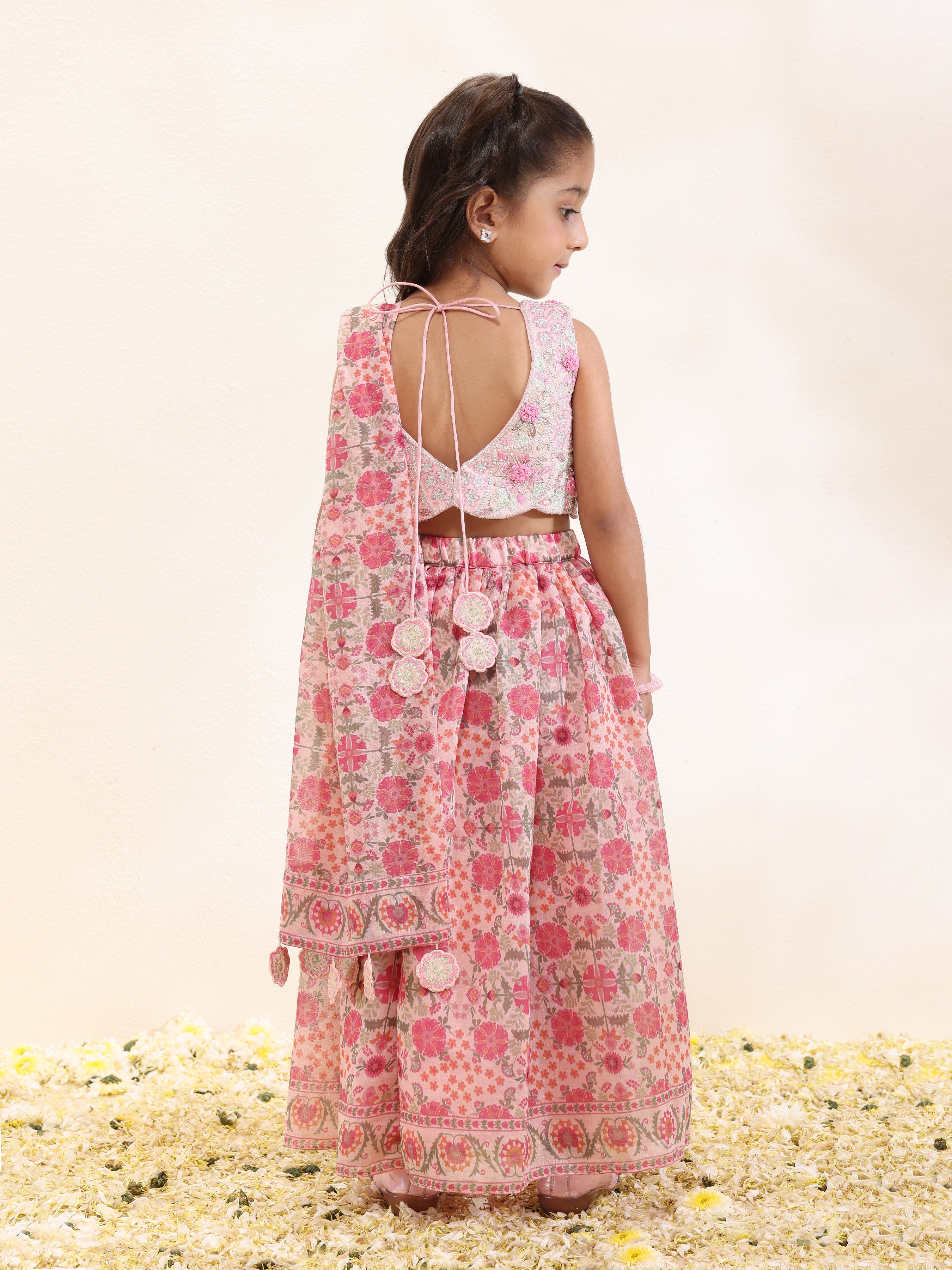 Dress your child in vibrant elegance with this girls’ printed silk mal lehenga and matching dupatta, both enhanced with handcrafted tassels for a playful yet refined touch. The set is beautifully paired with an intricately embroidered spun silk choli, completing the festive and sophisticated look. Crafted from premium fabrics, including spun silk for the choli and printed silk mal for lehenga and dupatta, this ensemble is perfect for weddings, parties, and special celebrations.