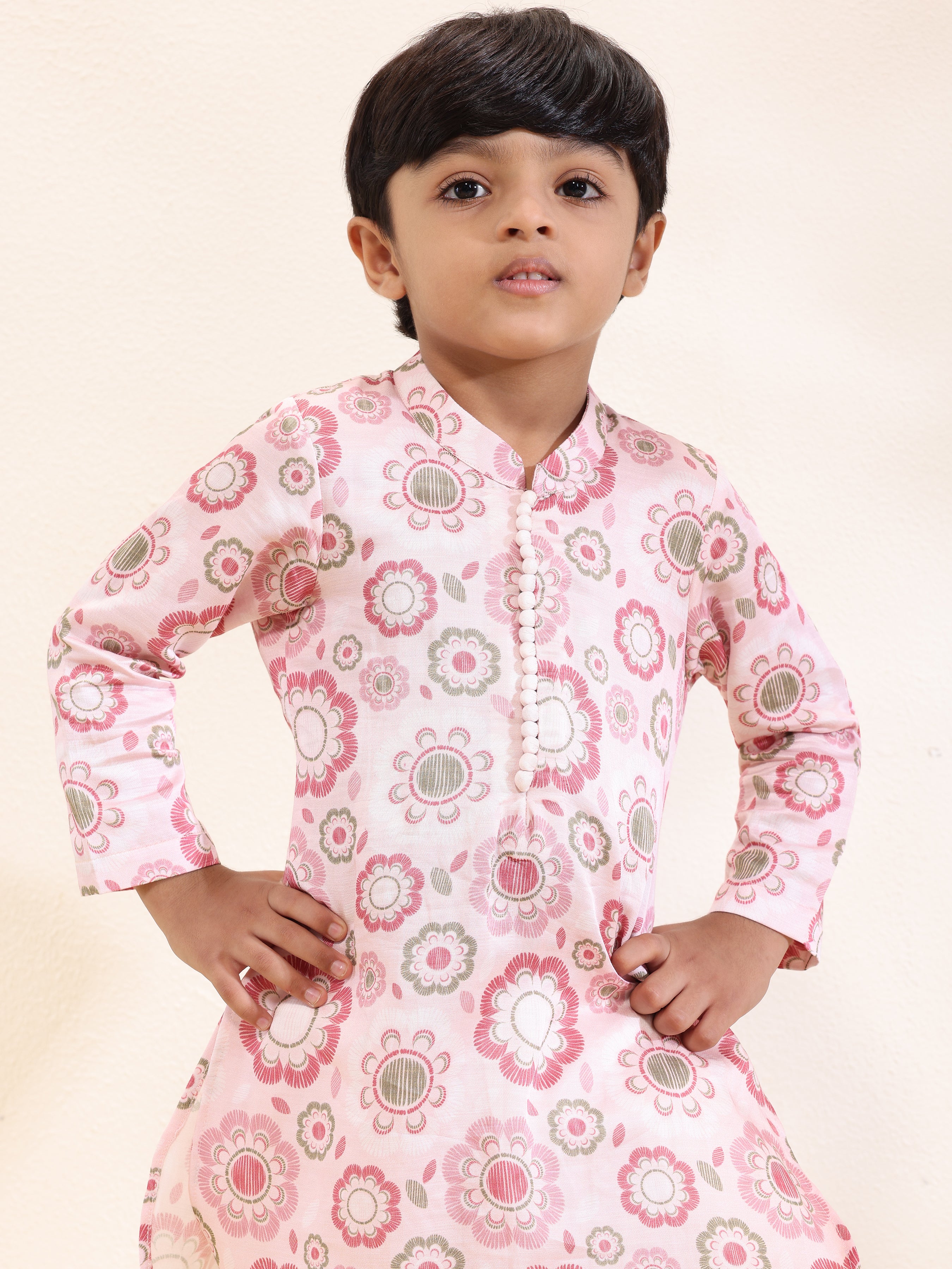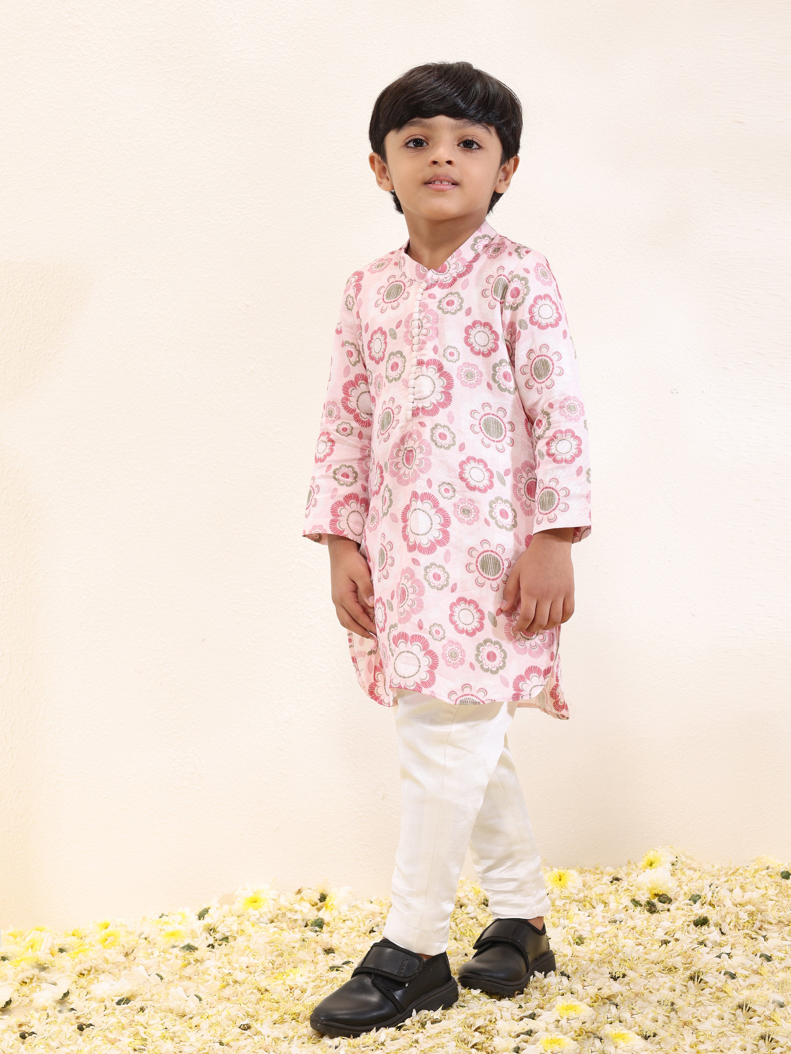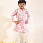 Dress your little one in stylish comfort with this boys’ printed kurta made from breathable satin linen, featuring traditional potli button details for an authentic ethnic look. The kurta is paired with narrow cut pants crafted from soft spun silk, ensuring both elegance and ease of movement. Perfect for festive celebrations, family gatherings, and special occasions, this set combines classic design with modern tailoring.