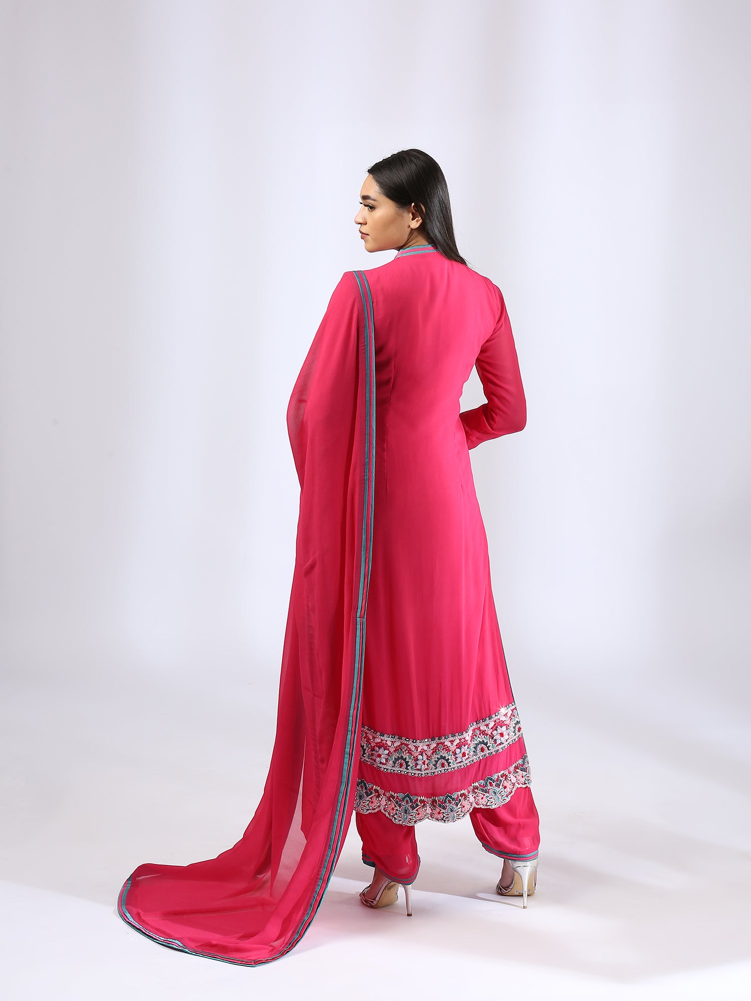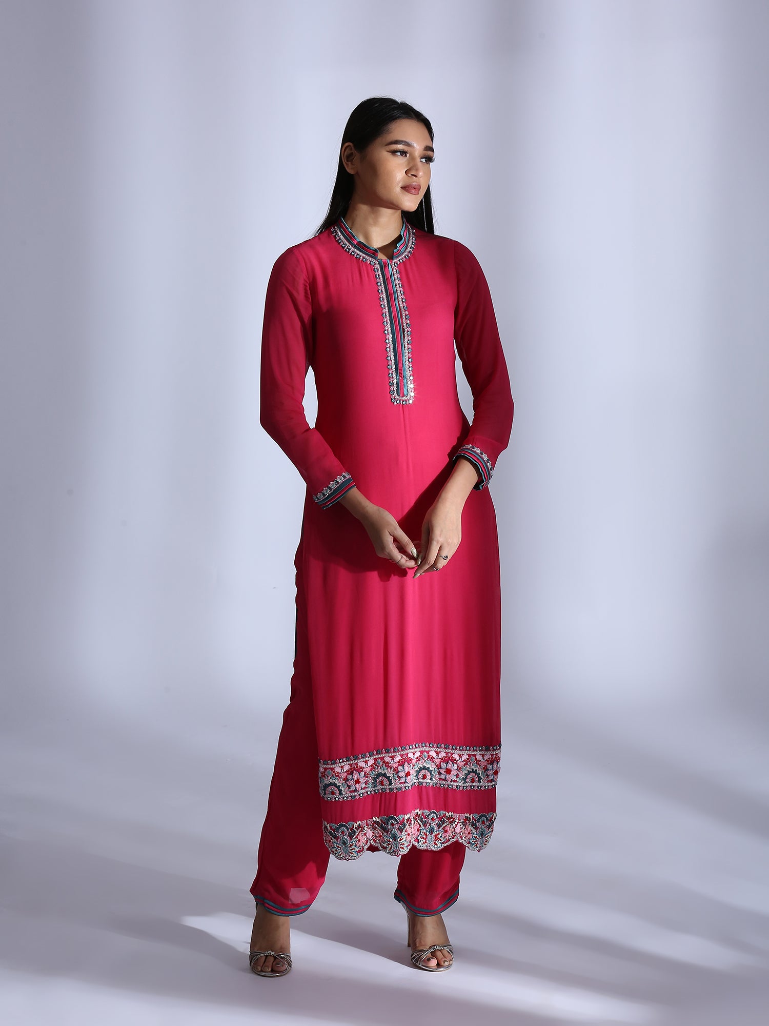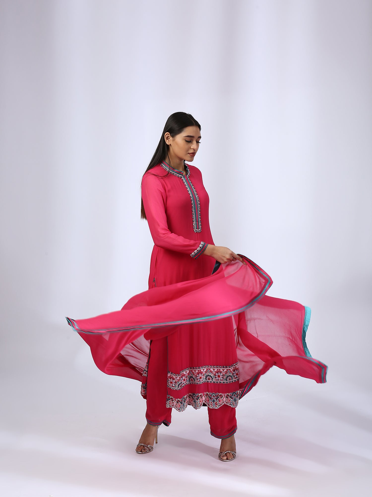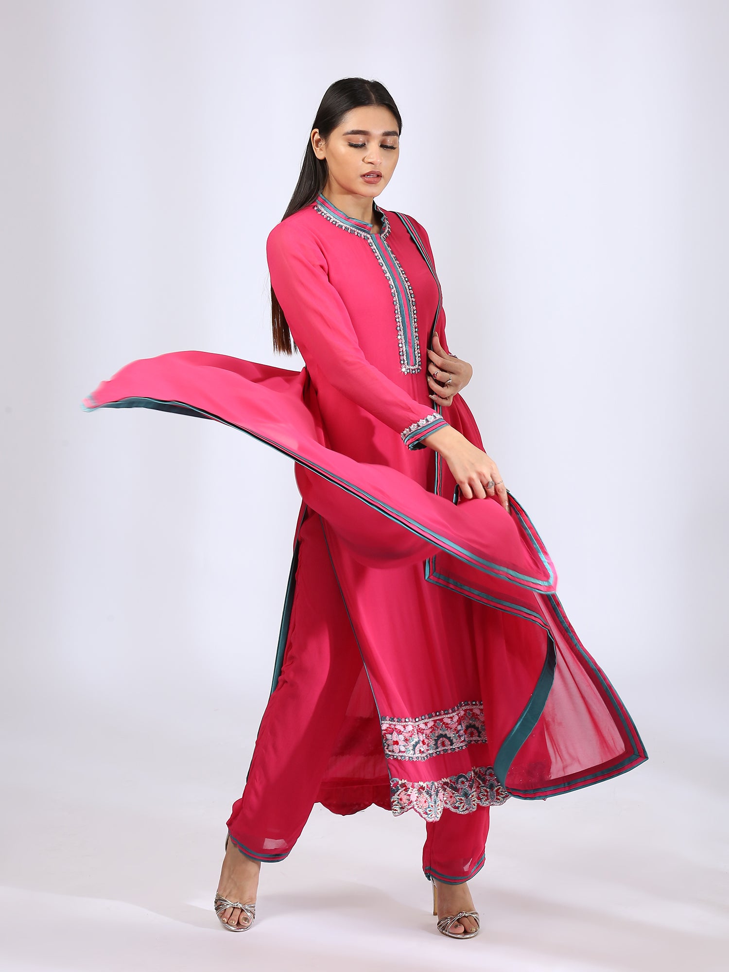 The Rani Pink Kurta features elegant embroidery on the hemline and placket, paired with coordinating ankle-length pants and a dupatta.