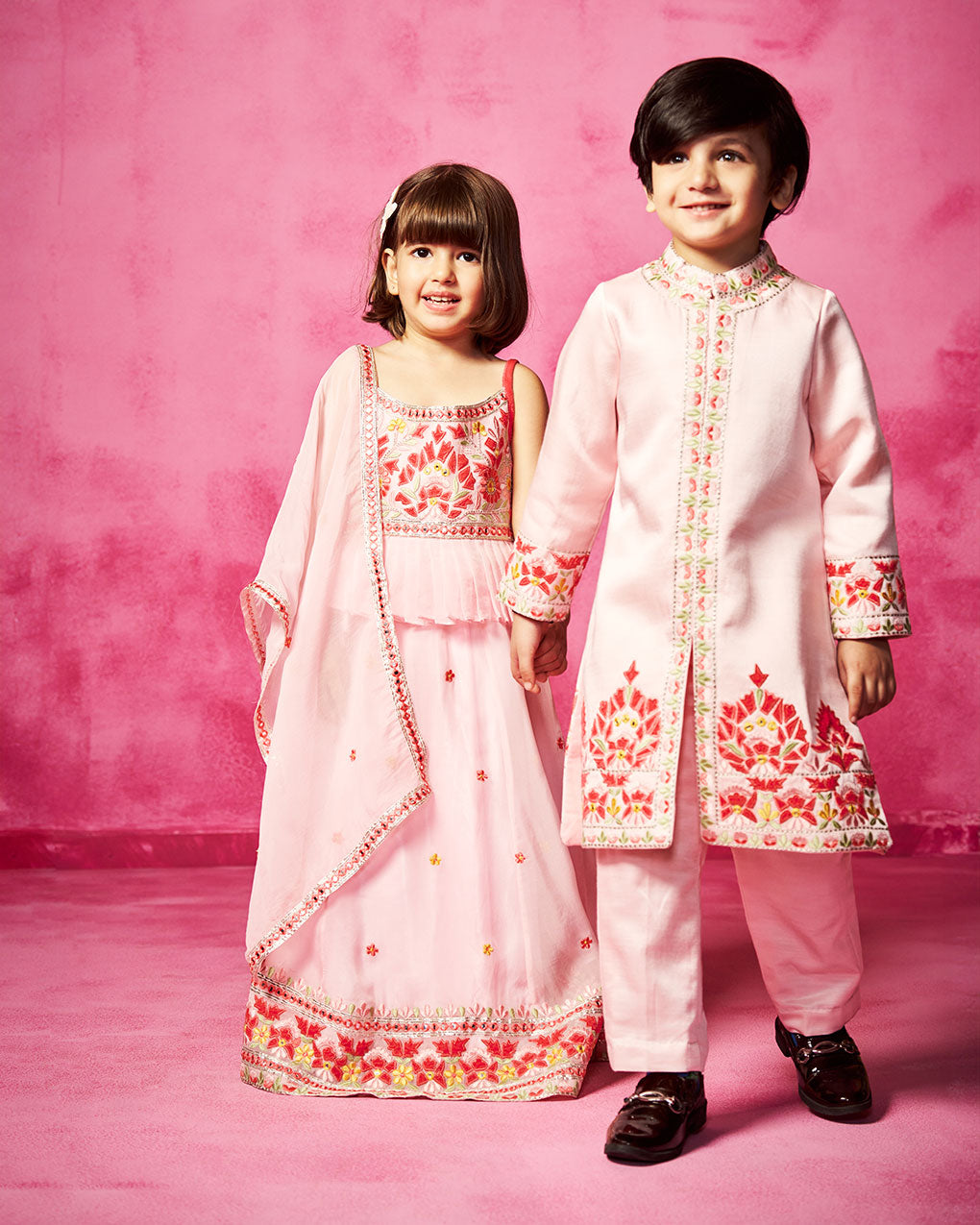 Light Pink embroidered sherwani with velvet patchwork and threadwork embroidery. It is teamed with matching narrow pants for the son.