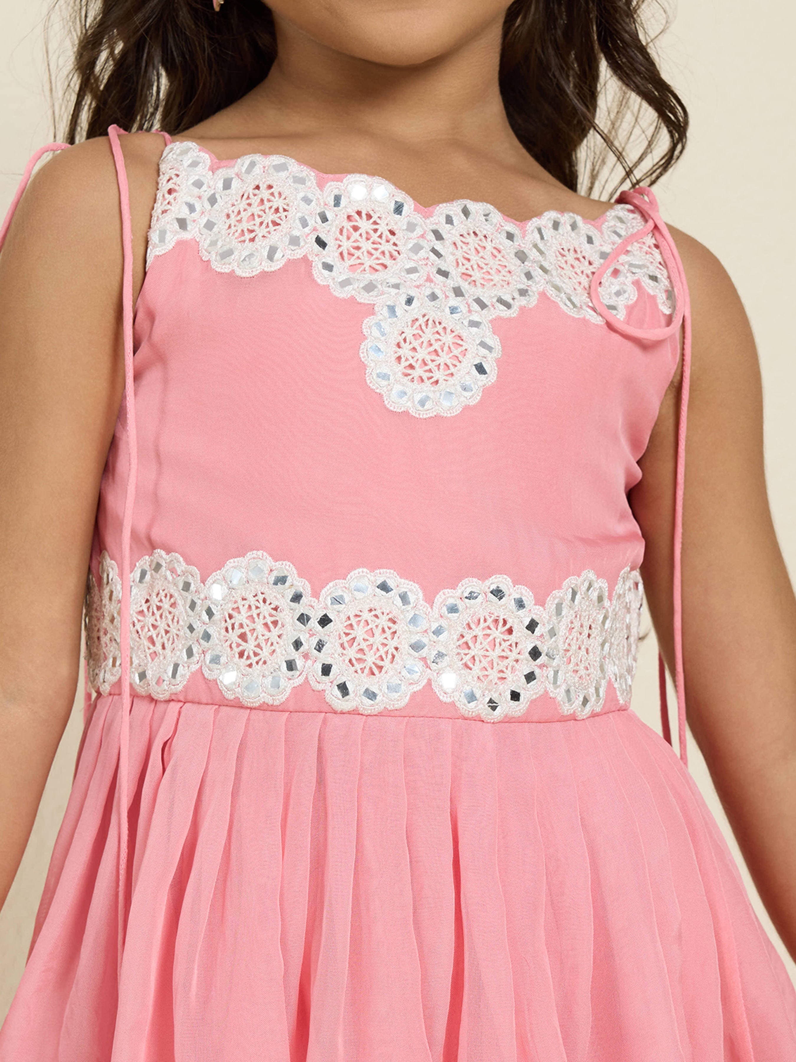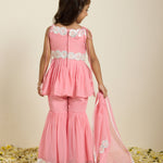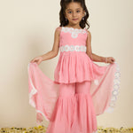 Bring elegance and tradition to your child’s wardrobe with this beautiful pink organza sharara set. The set features stylish mirror work on the peplum kurta, paired with comfortable organza sharara pants and a matching dupatta. Designed for festive occasions, weddings, and celebrations, this ensemble combines intricate craftsmanship with delicate fabrics for a charming and graceful look. Crafted to provide comfort and style, it’s perfect for special events.