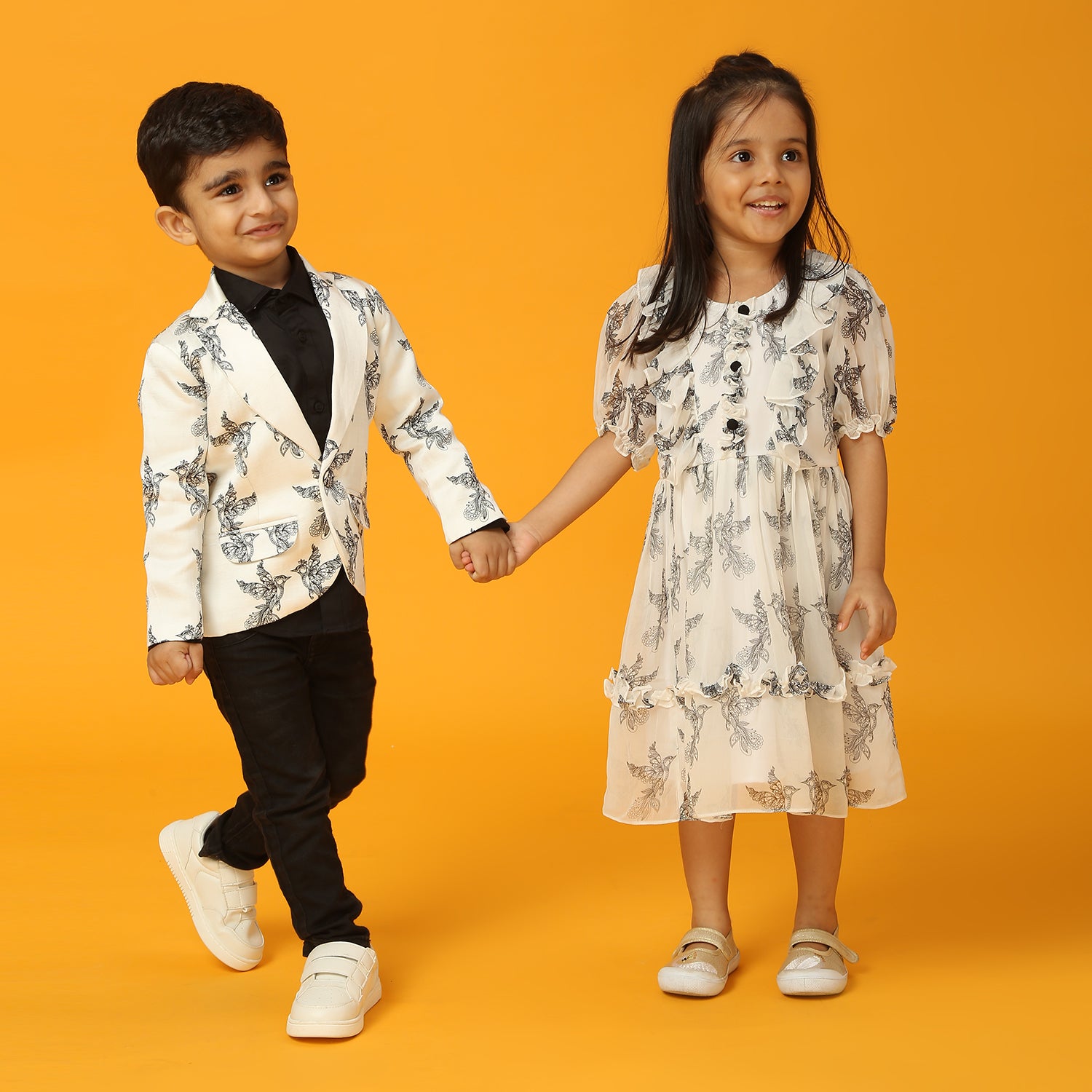Dress with bird print enhnced with reffle detail on yoke and hemline for girl paired with Blazer with bird print enhanced with front pockets for boy.