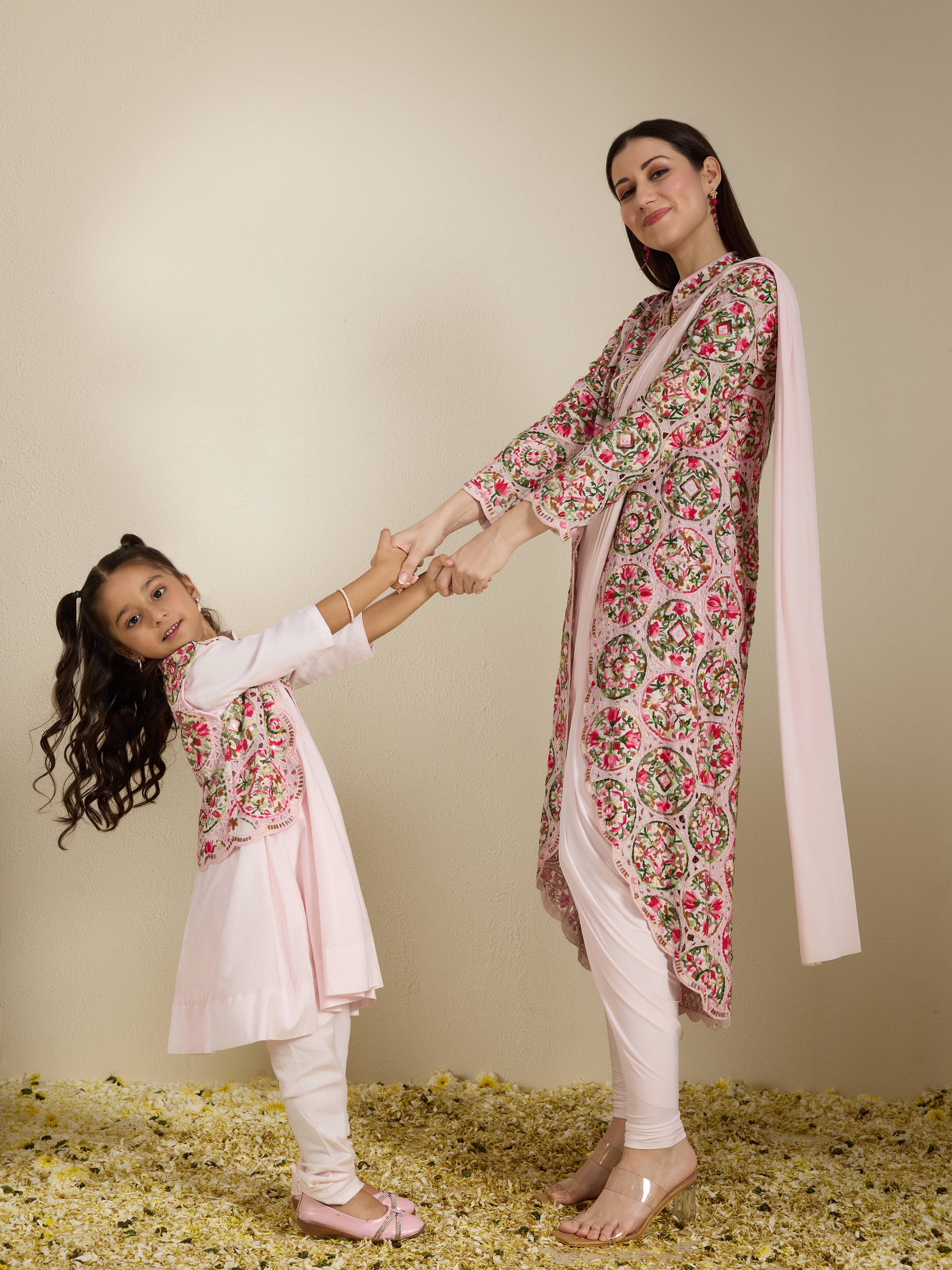 Daughter: Light Pink Kalidar Spun Silk Kurta Set with Embroidered Cutwork Jacket