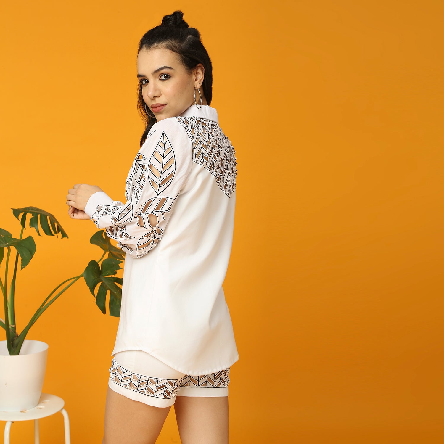 This set features a black and white poplin button-down shirt with cutwork detailing on the yoke and sleeves, accompanied by matching shorts.