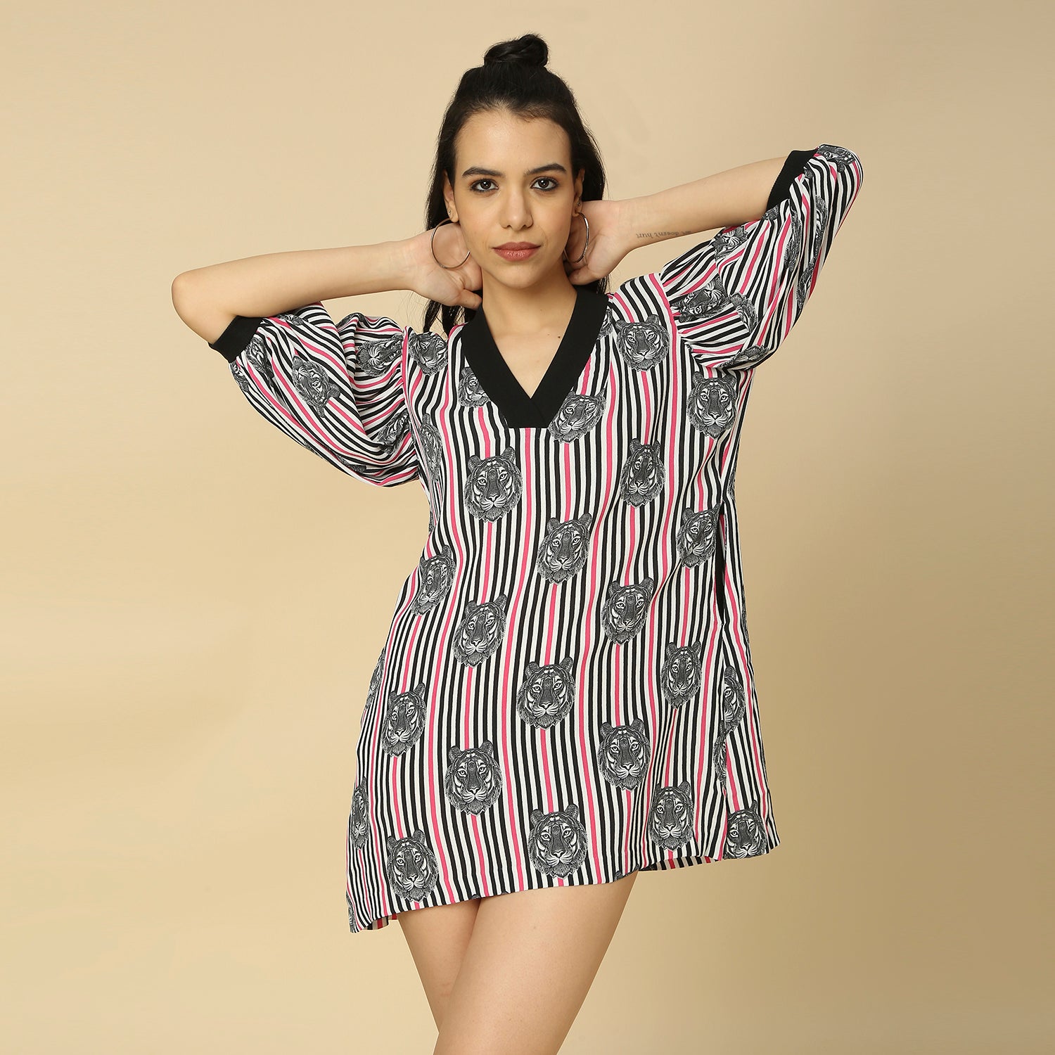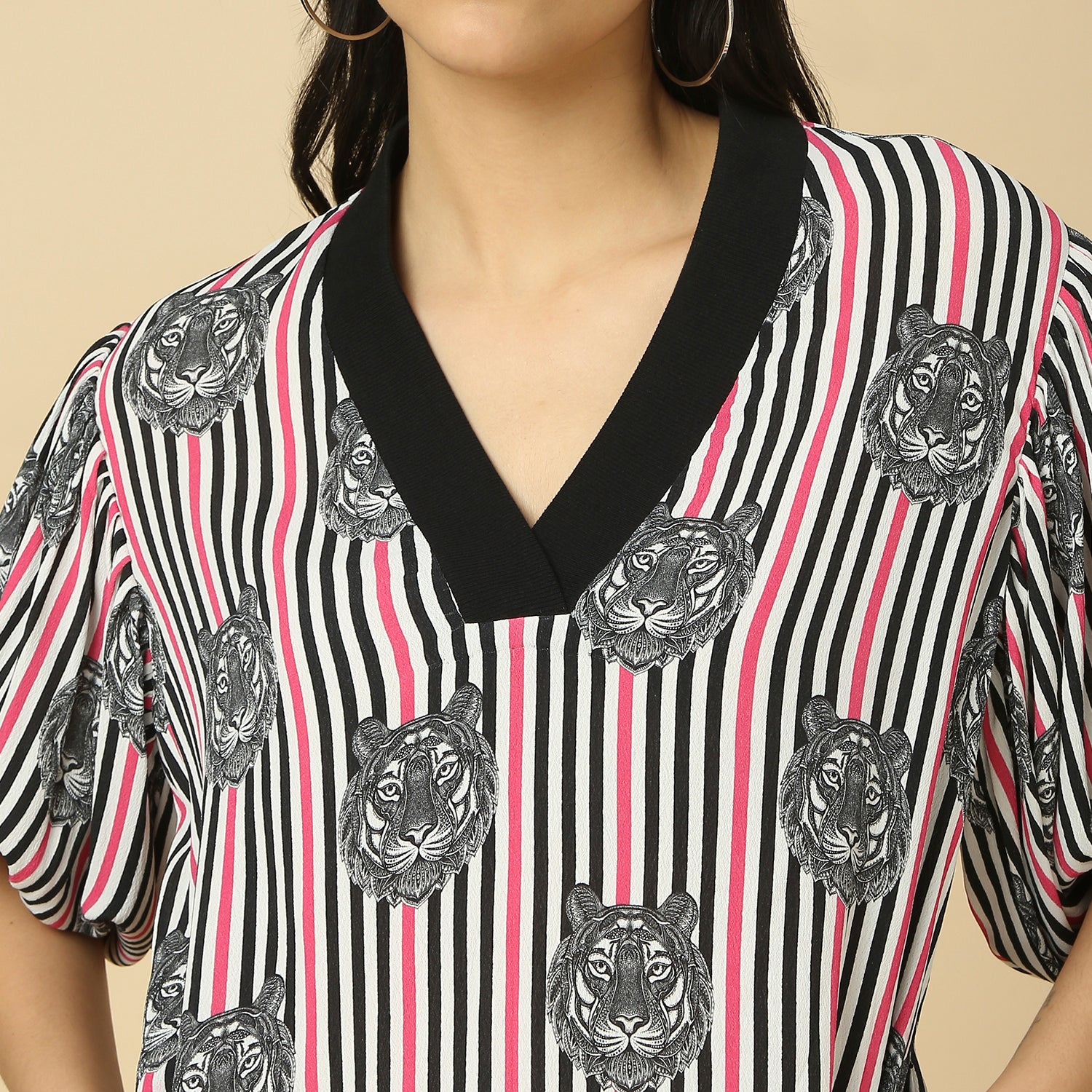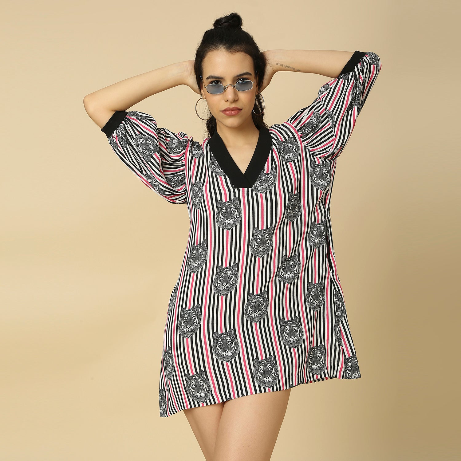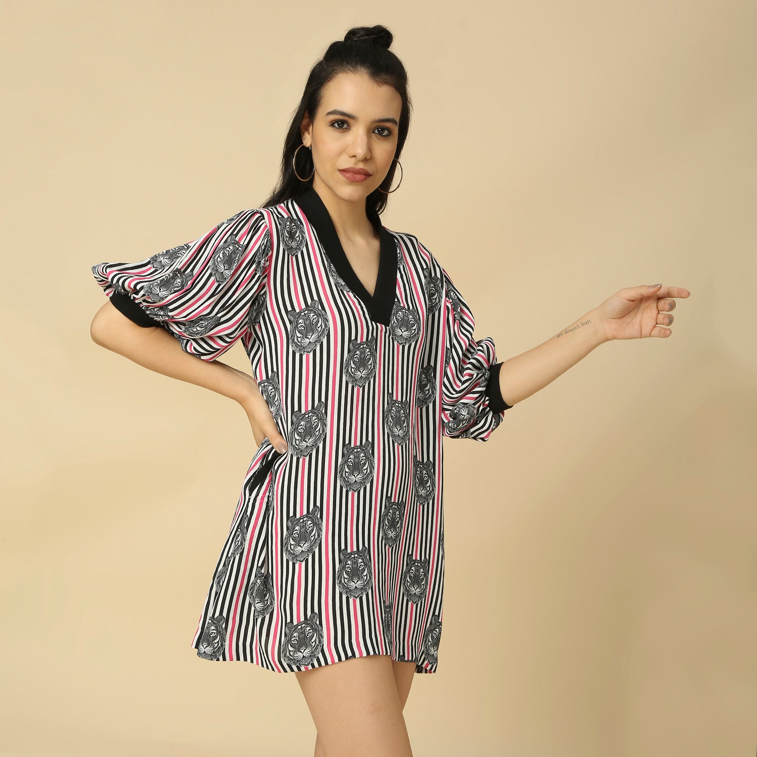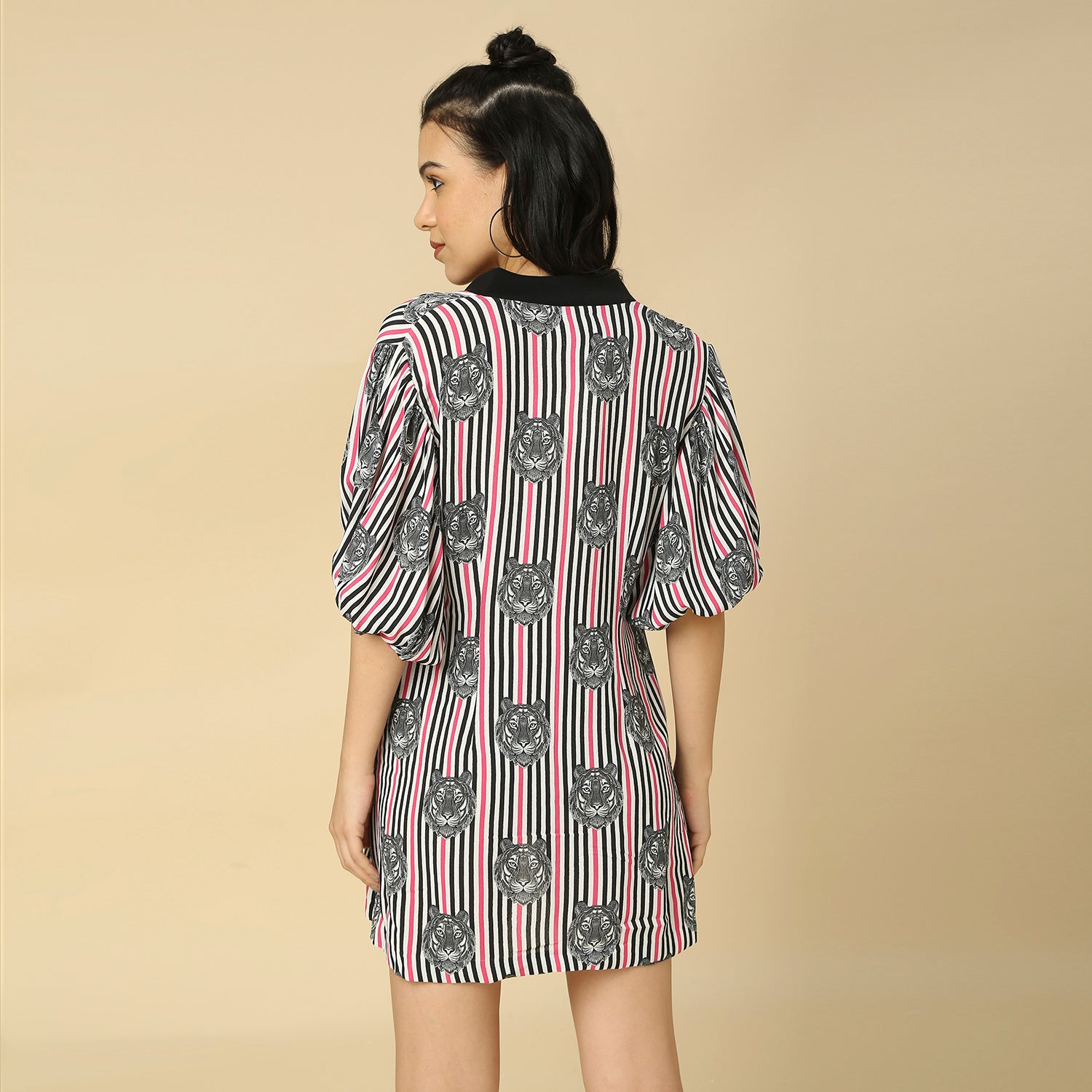This skater dress features a unique combination of black, white, and pink matte crepe, adorned with stripes and a fierce tiger print. The neckline and cuffs are enhanced with ribbed detailing for added texture and style.