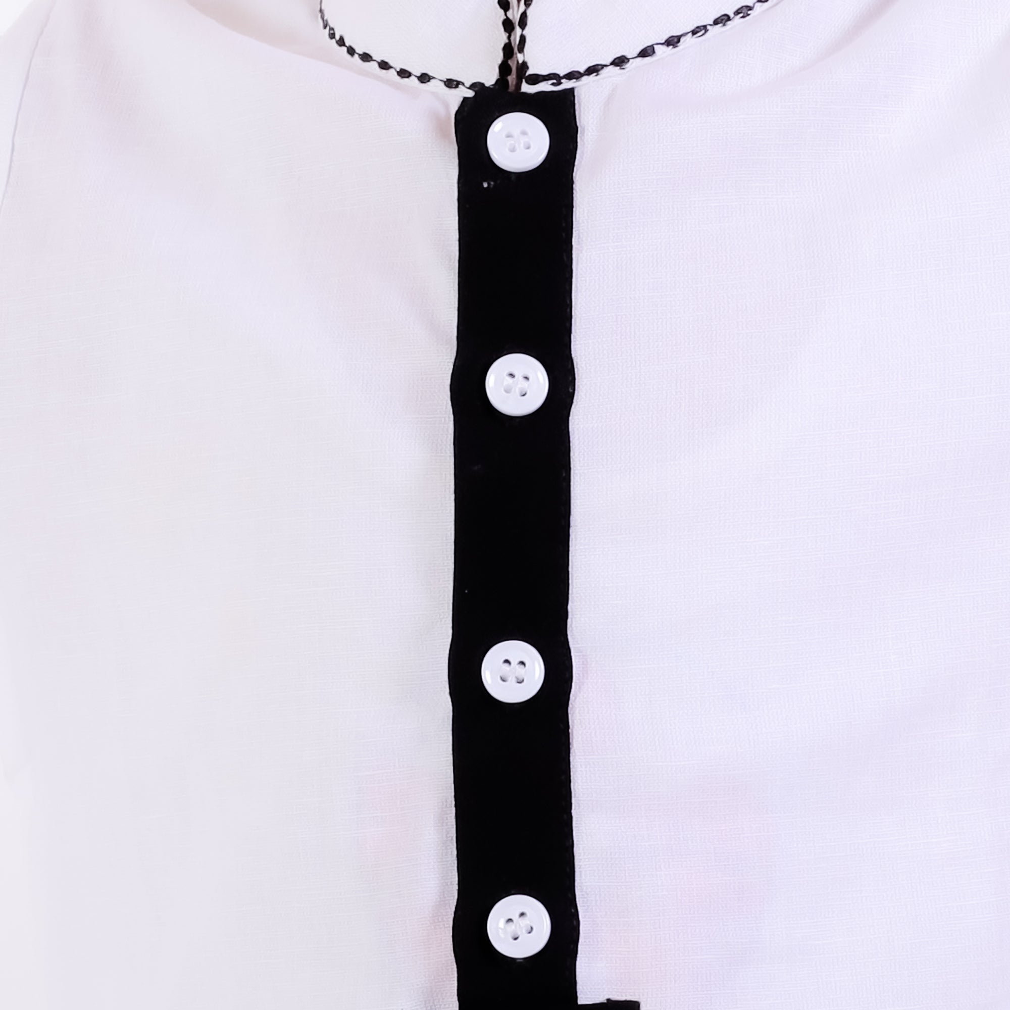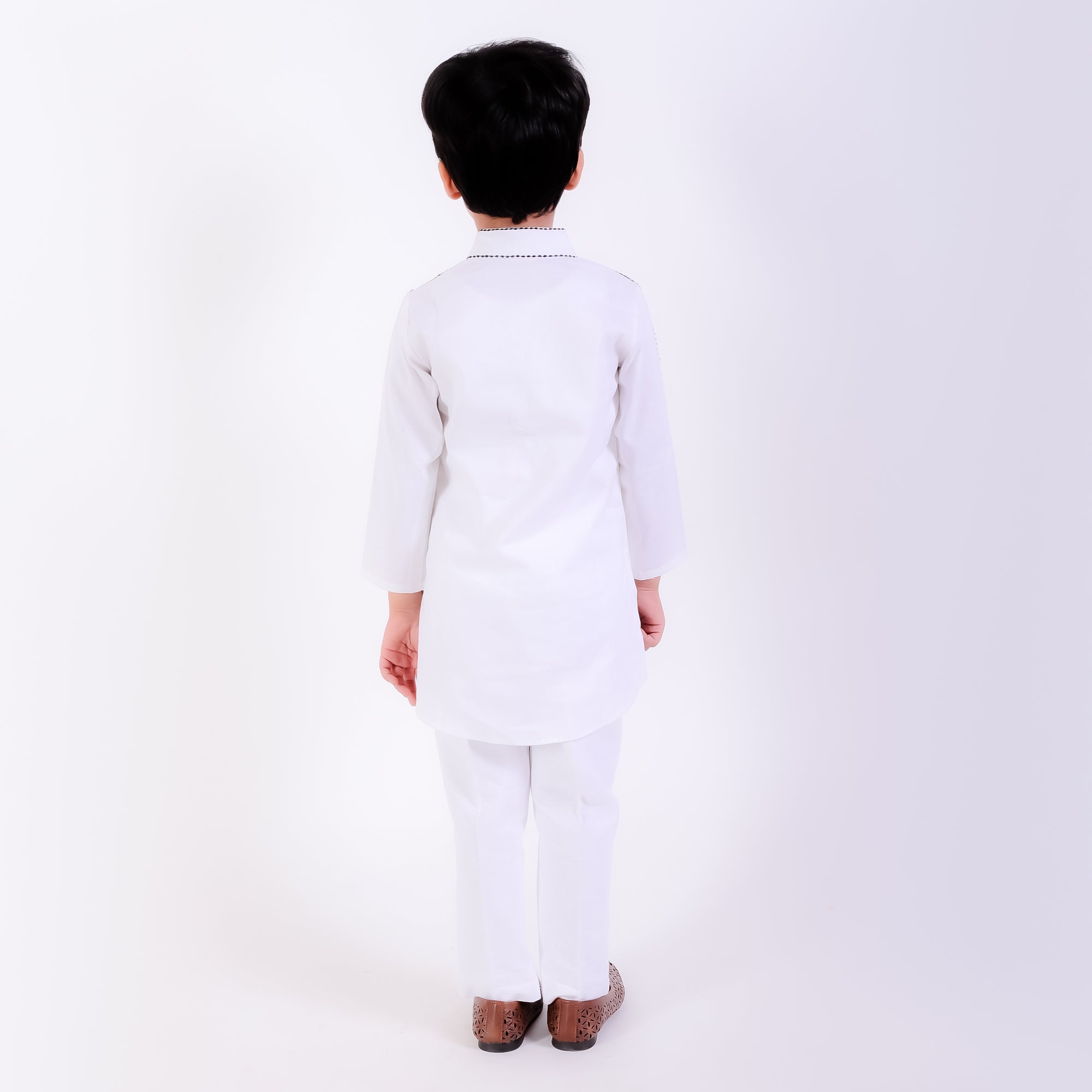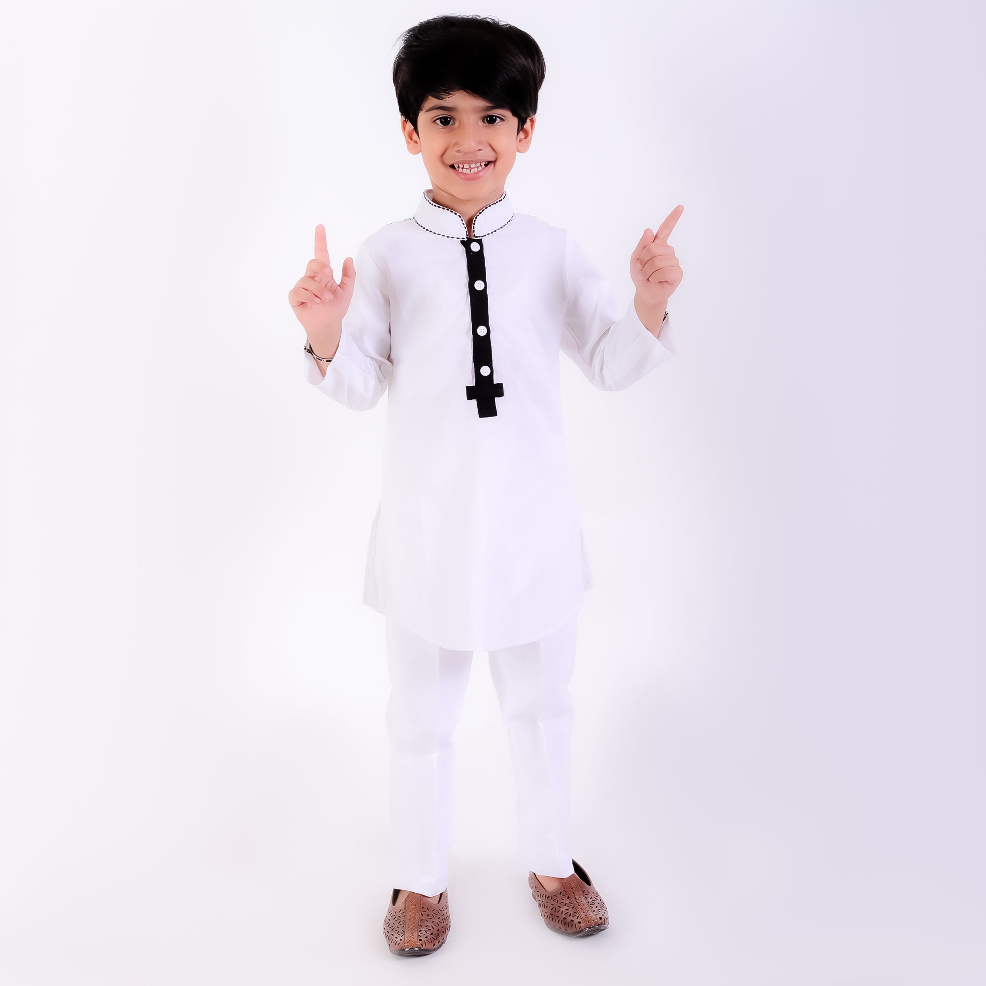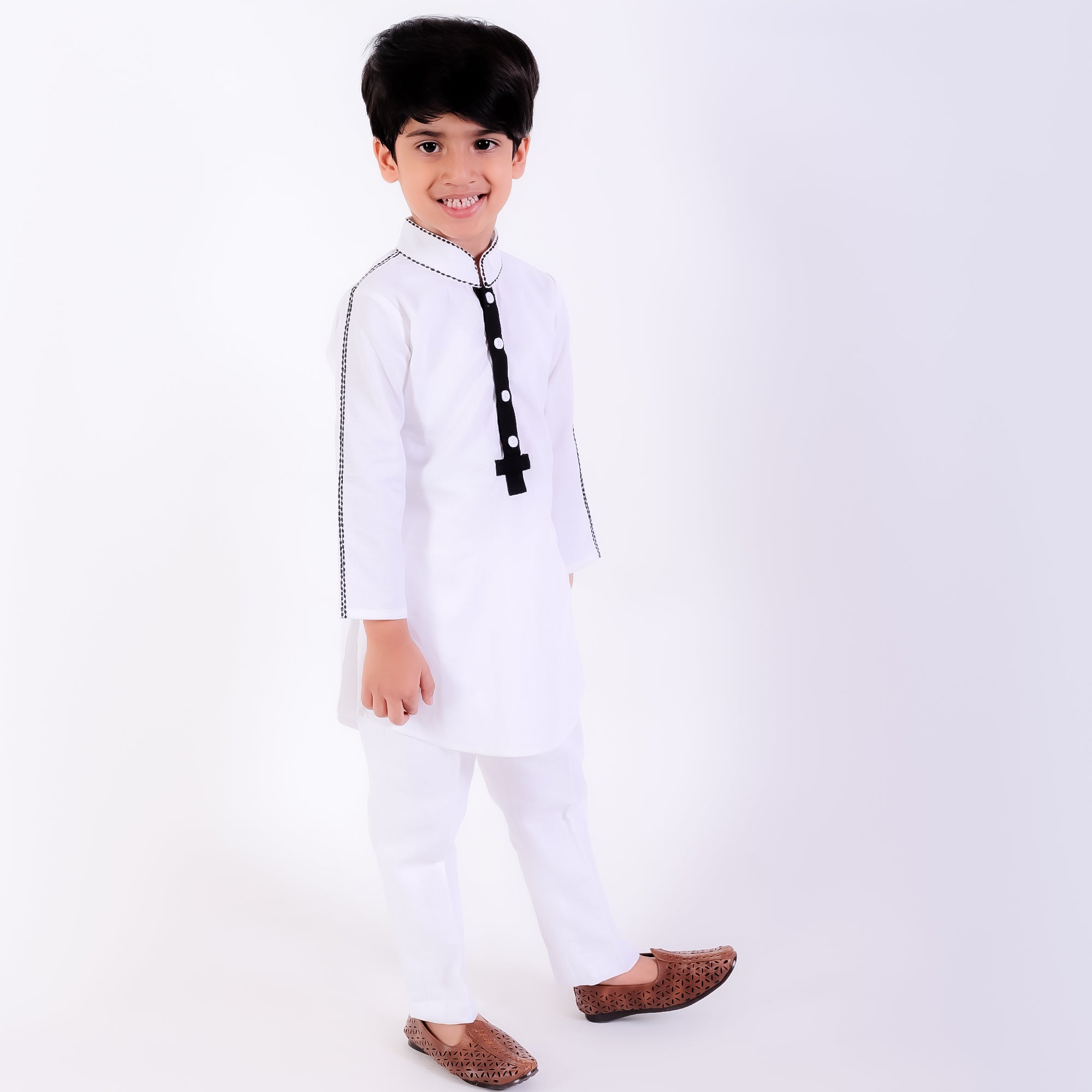 Ivory full sleeves kurta with contrasting black stitch detail on collar, shoulder & sleeves. Paired with a matching pant.