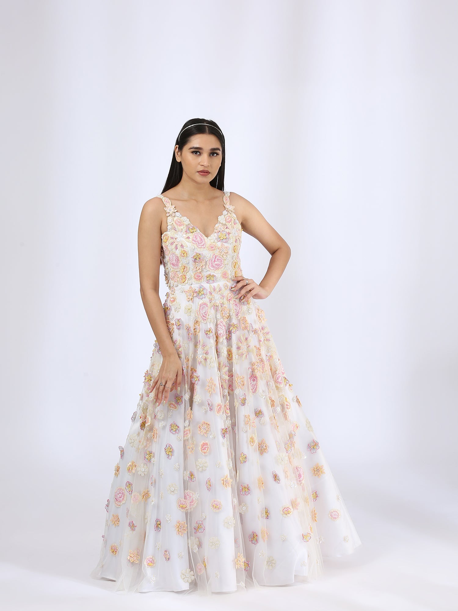 Ivory tulle gown with all over 3D embroidered flowers for mother and daughter.