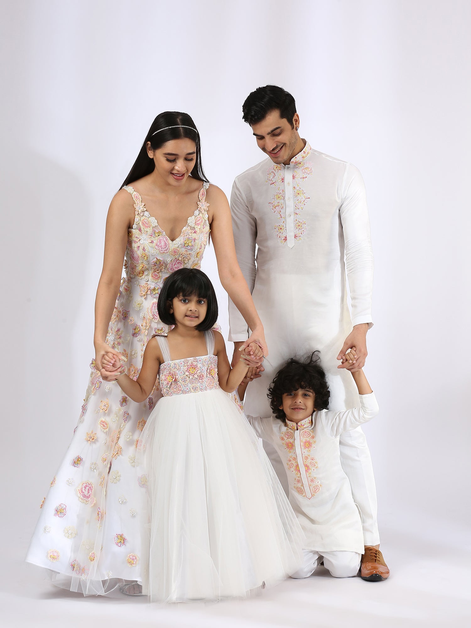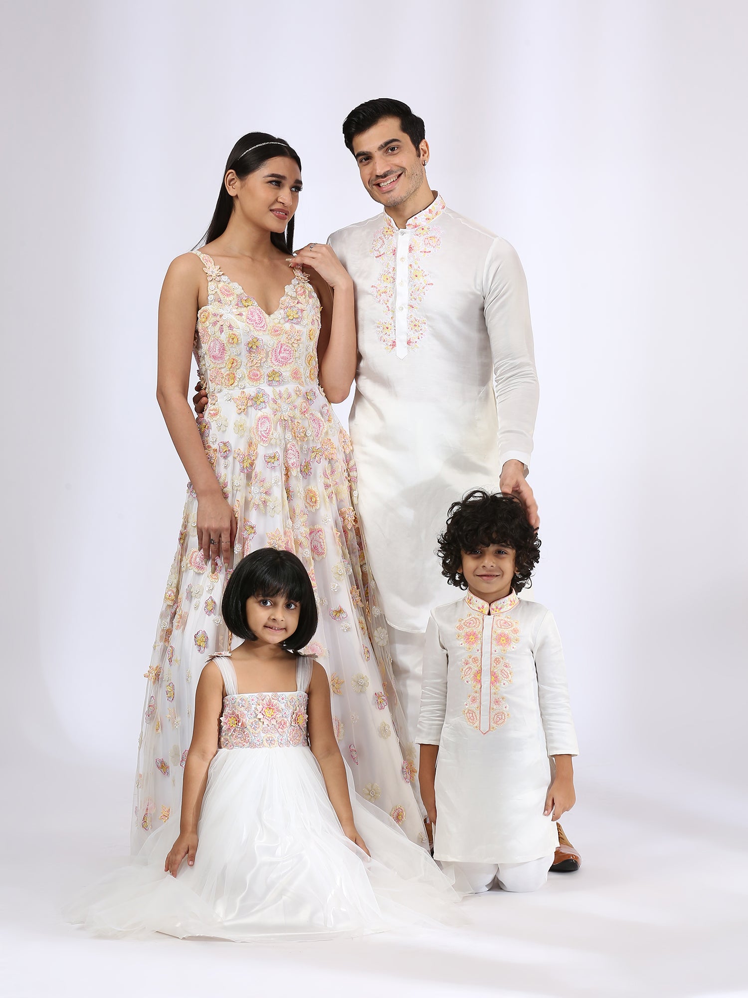 Ivory kurta embroidered with bugle beads on the collar and around the placket. It is teamed with matching narrow pants for both father and son