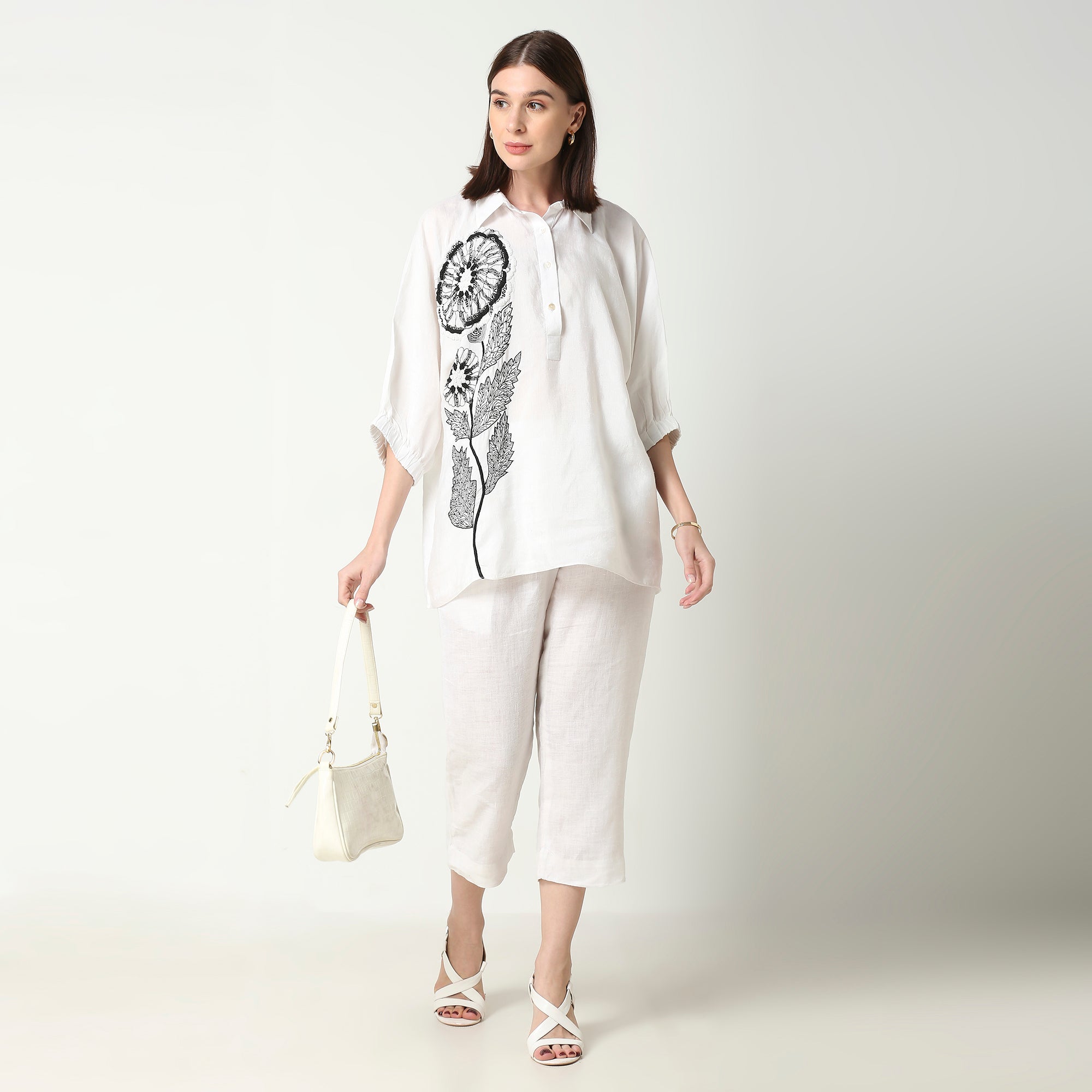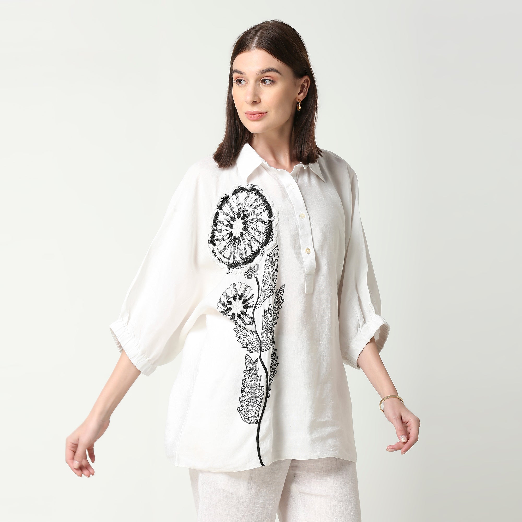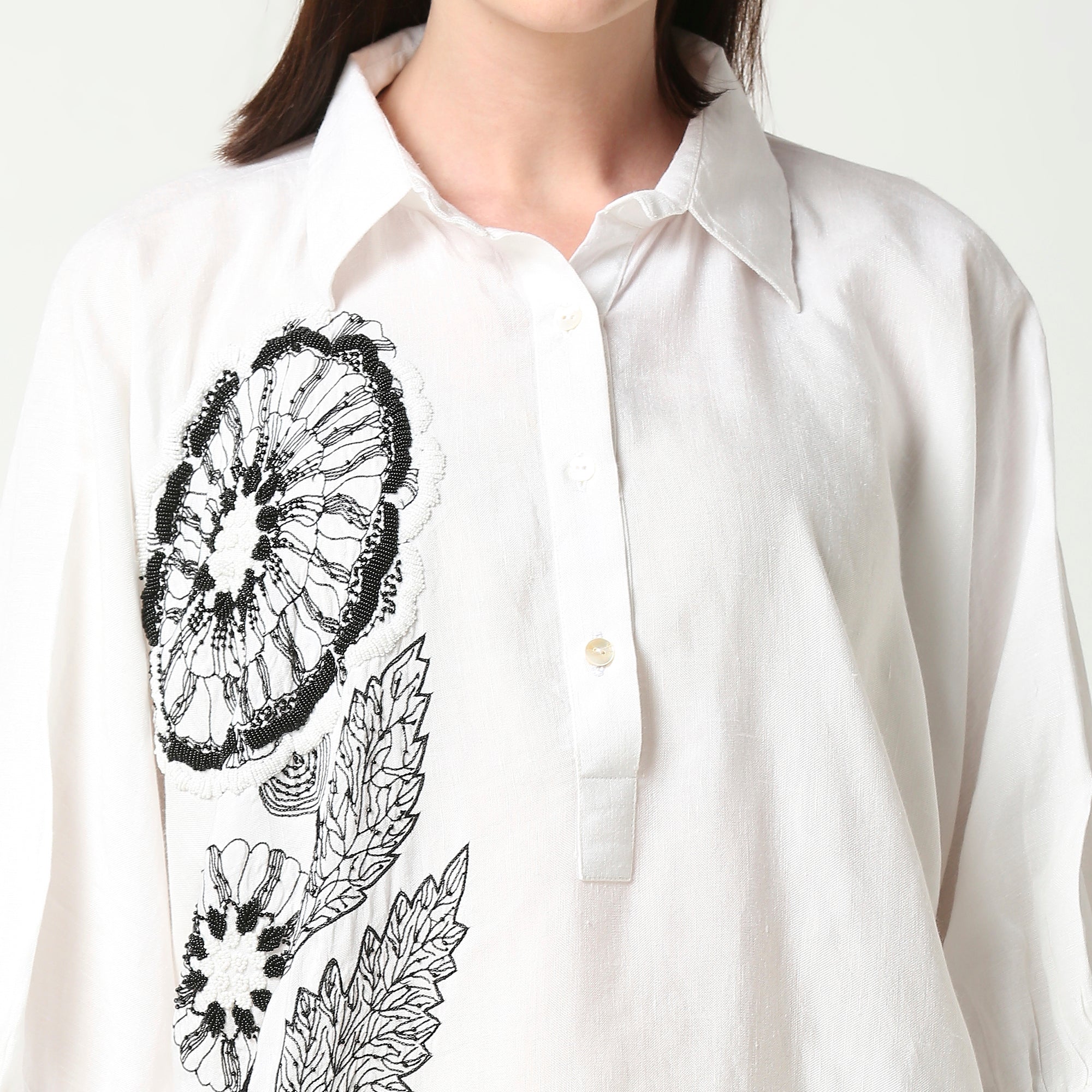 Ivory White Shirt features a relaxed fit and is adorned with a single-sided floral motif crafted from delicate beads.