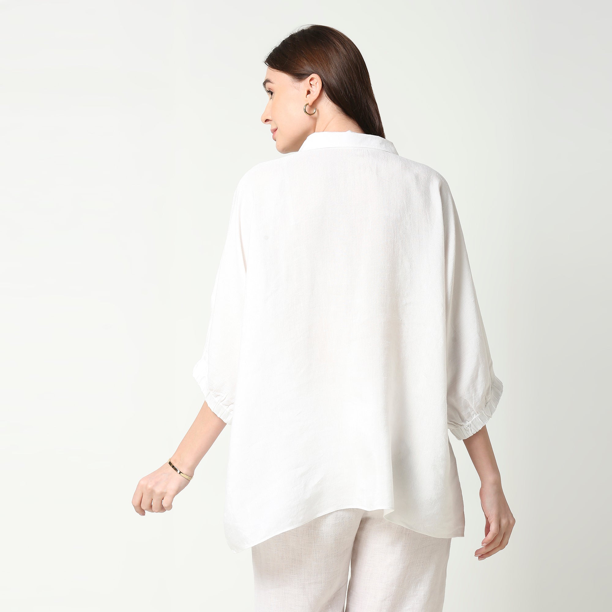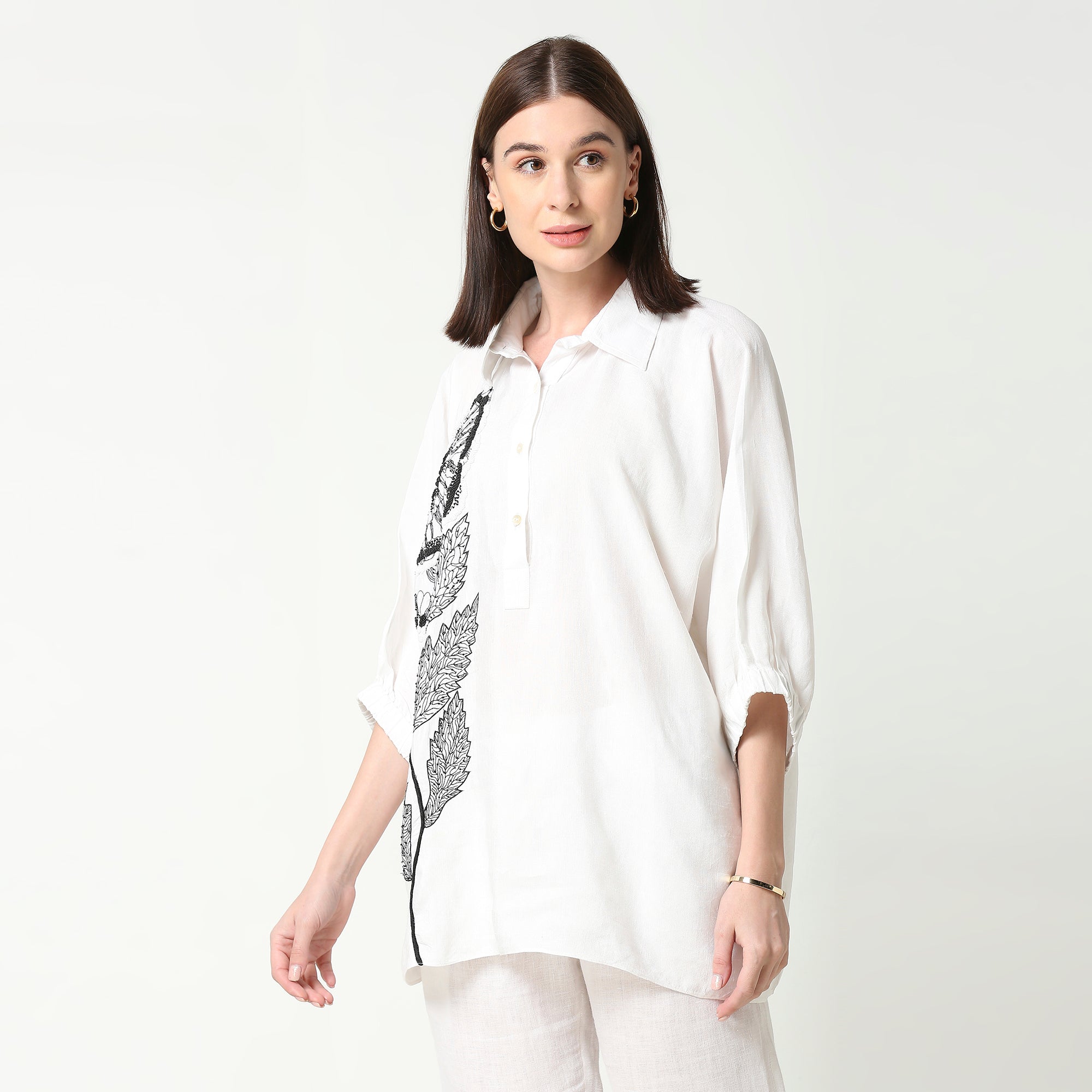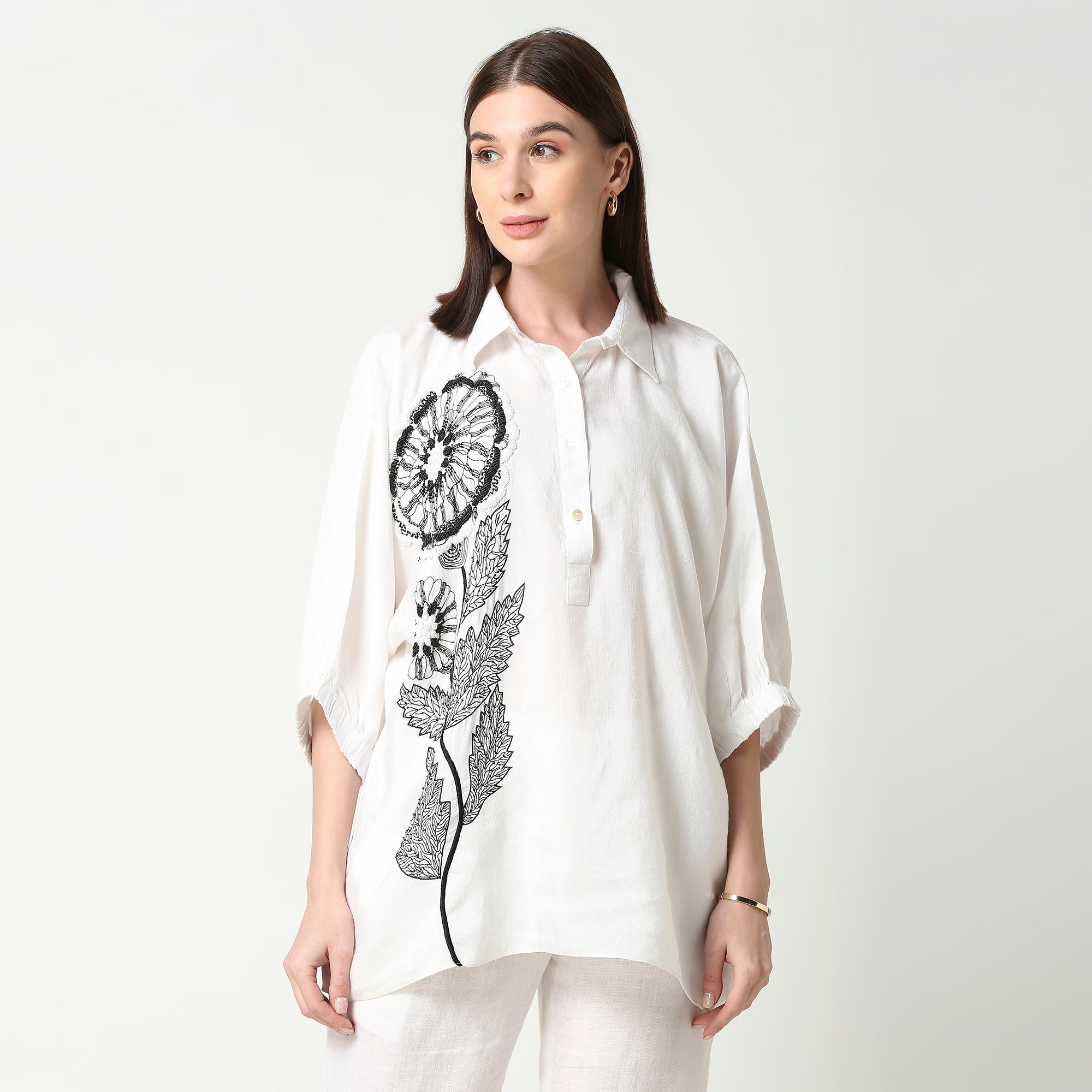 Ivory White Shirt features a relaxed fit and is adorned with a single-sided floral motif crafted from delicate beads.