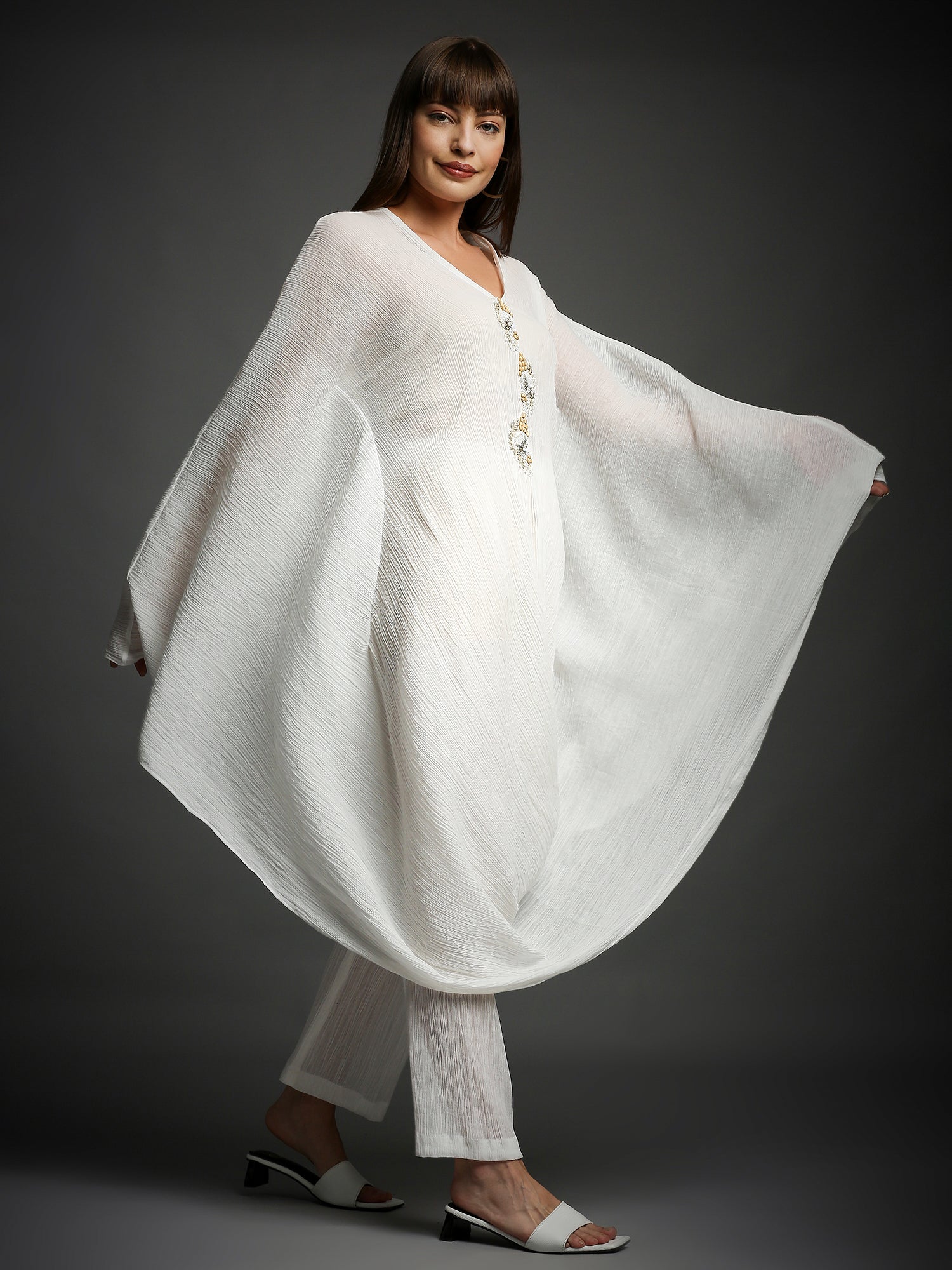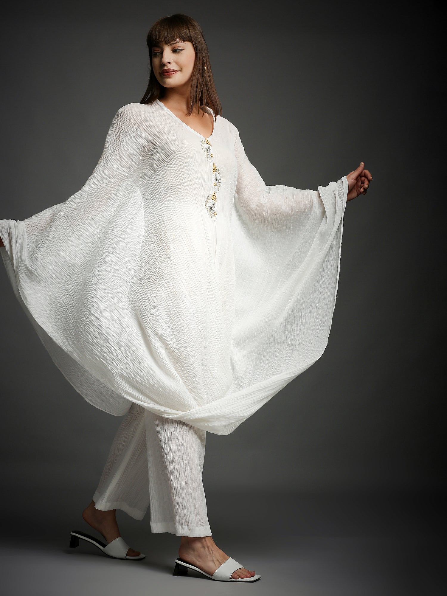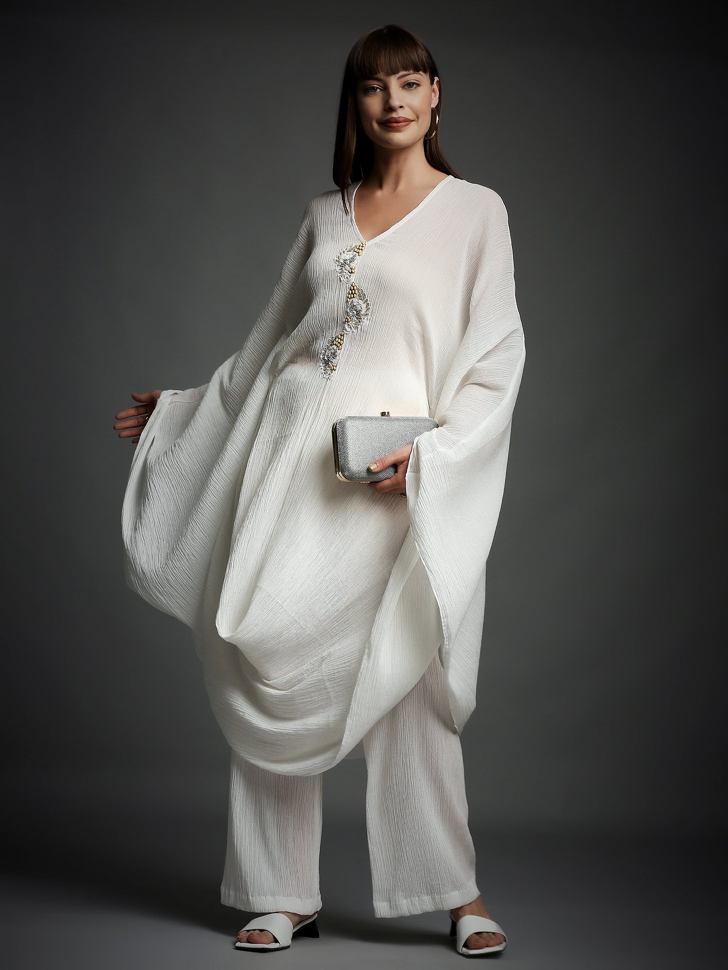 This crinkled ivory white draped top features hand-embroidered motifs on the center front, paired perfectly with matching pants.