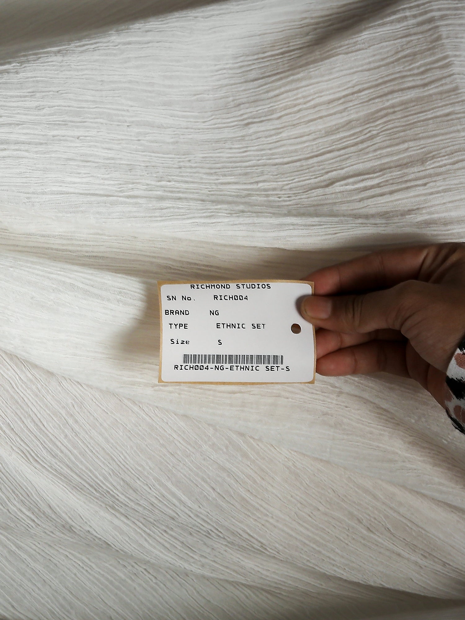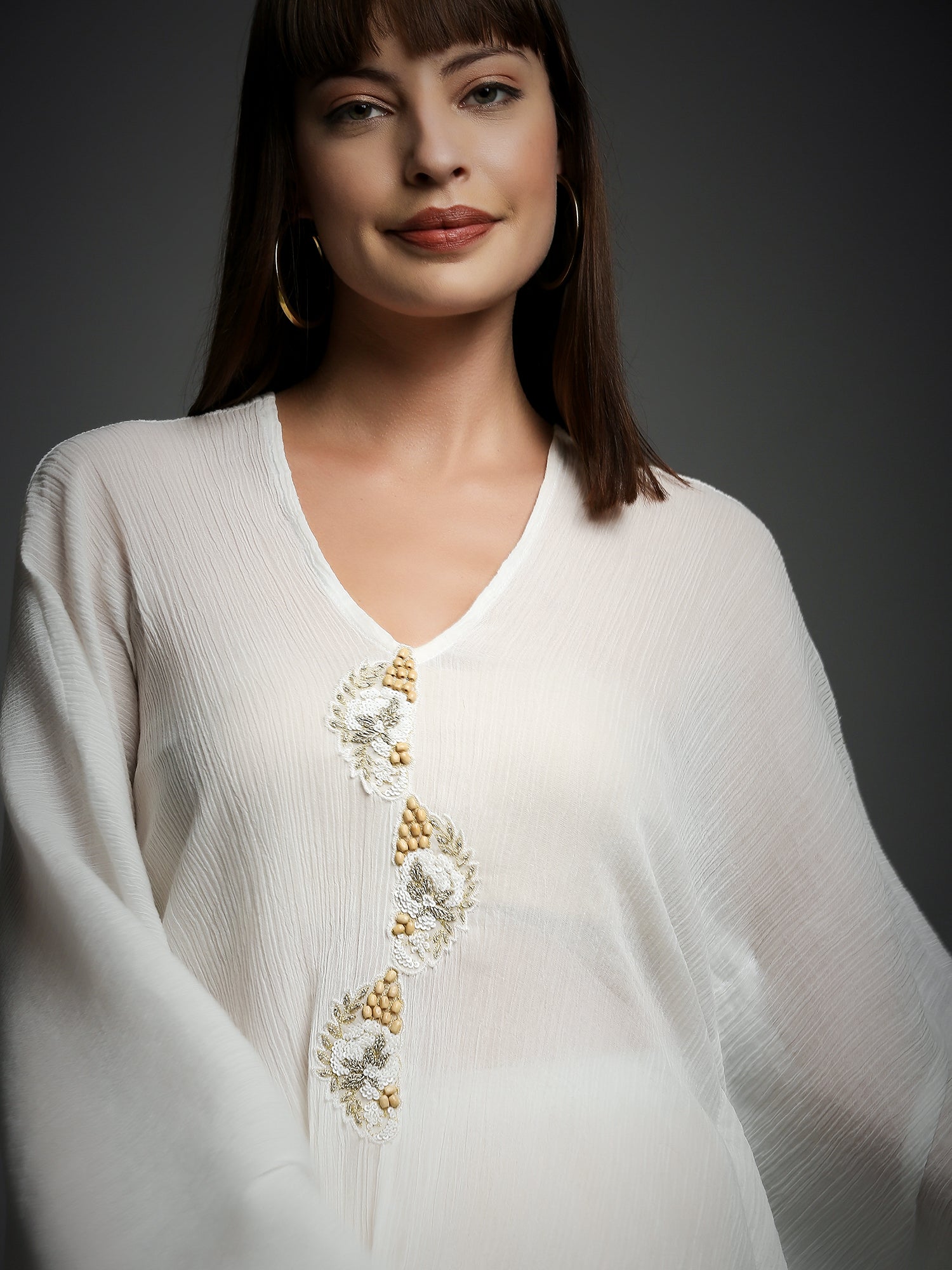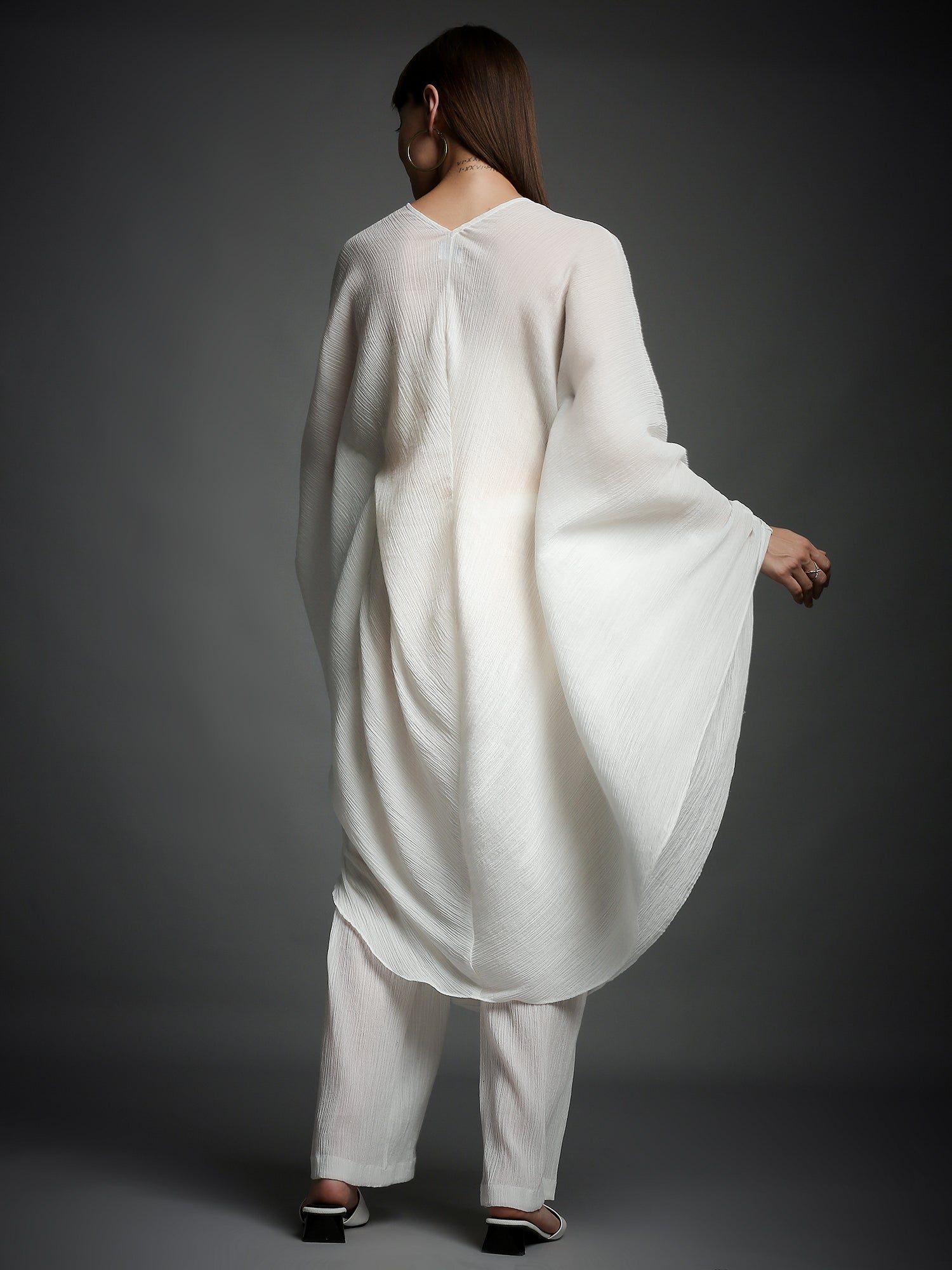 This crinkled ivory white draped top features hand-embroidered motifs on the center front, paired perfectly with matching pants.
