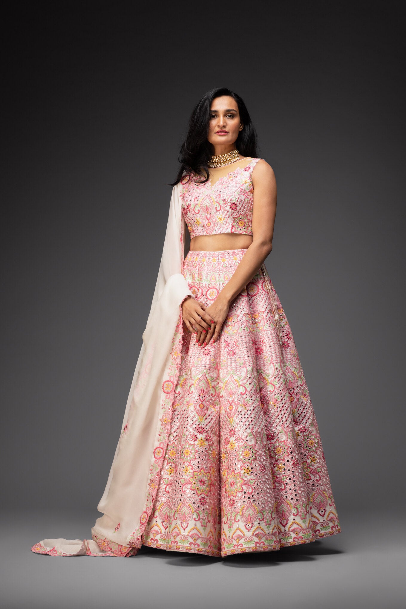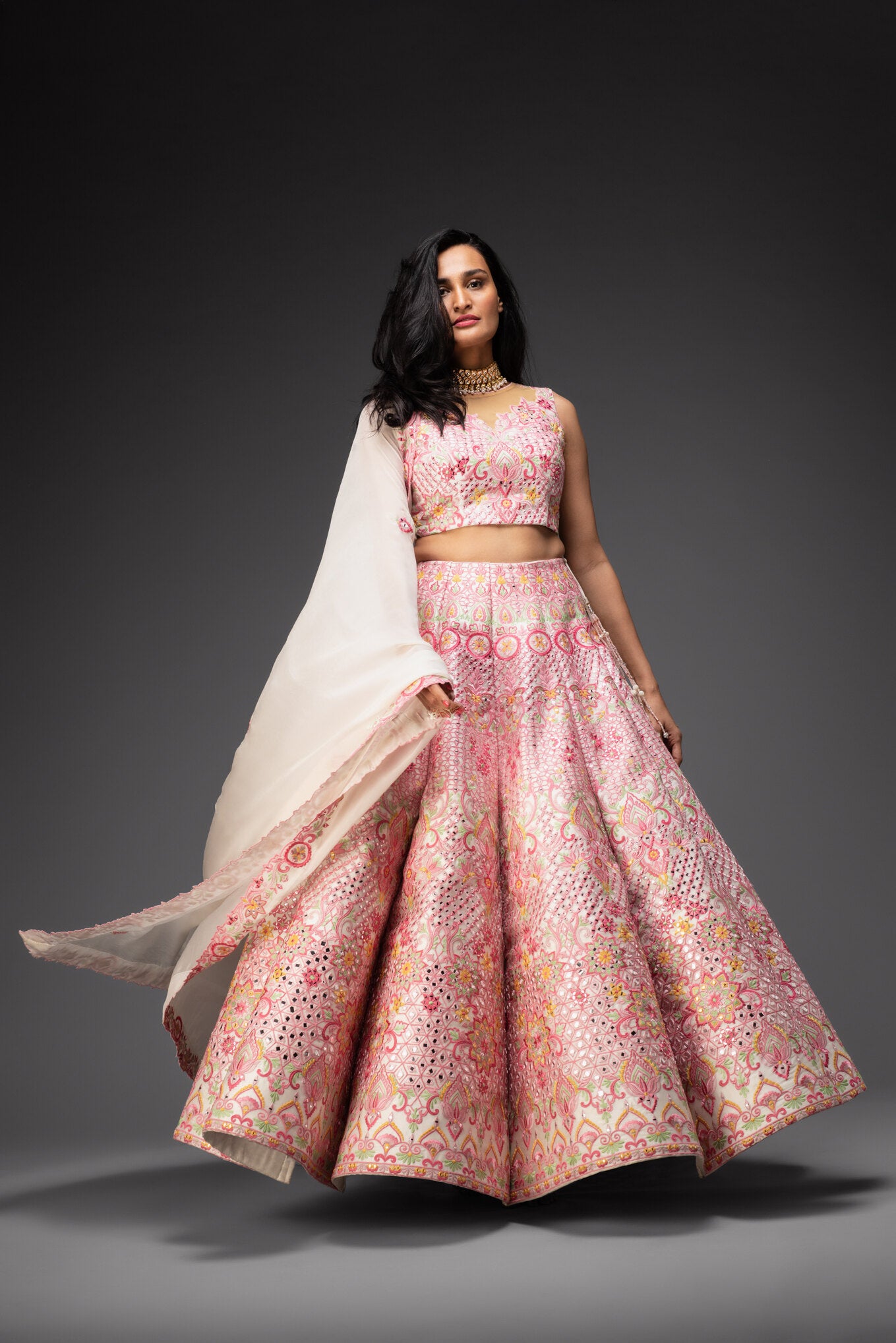 The ivory lehenga for women features intricate thread-mirror floral pink embroidery, adding a touch of elegance to the design. It is accompanied by a matching organza cutwork blouse and net dupatta.